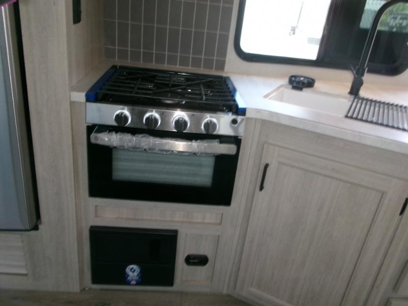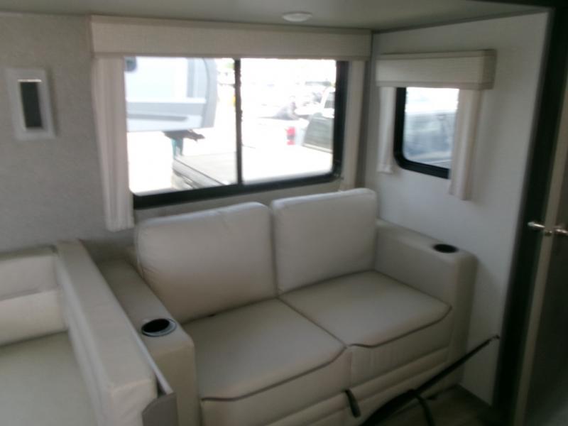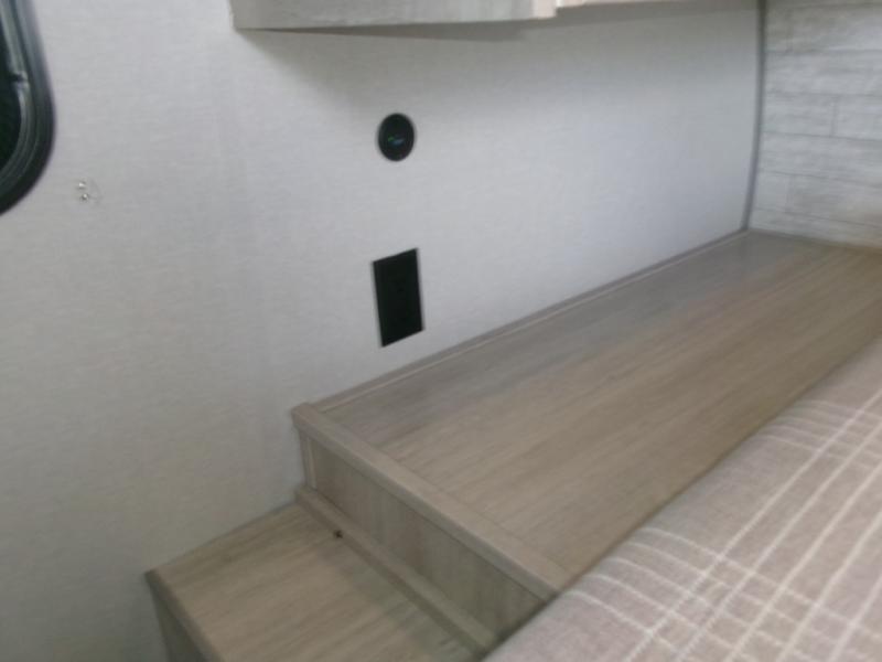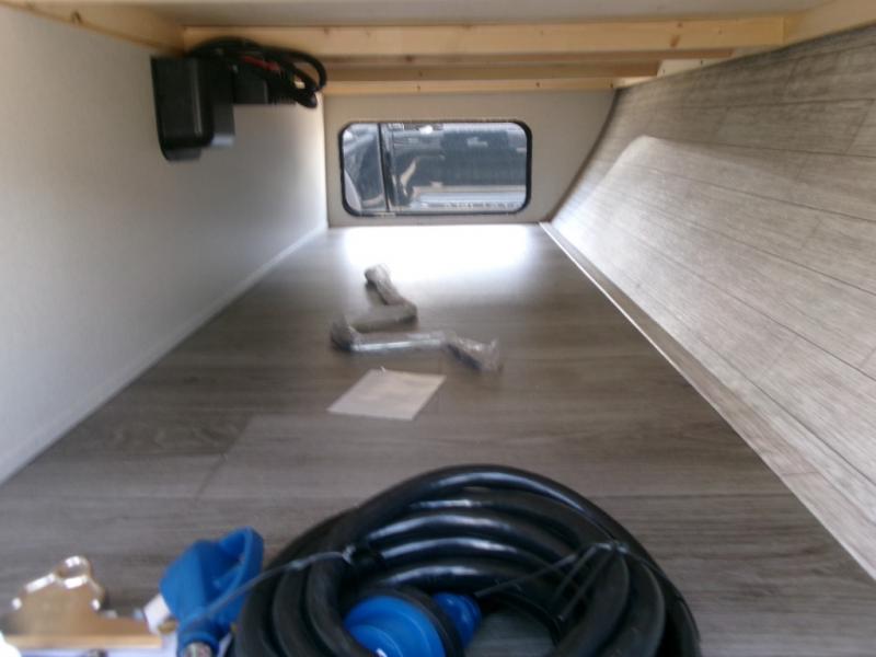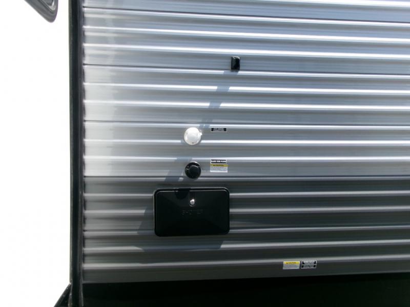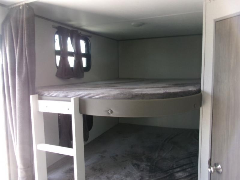 When you enjoy camping with your own accommodations and space for the whole crew, hitch this trailer up and head to the campgrounds! After loading everything easily thanks to the dual entry doors and all the interior and exterior storage, you will have no worries that you left anything behind. The electric awning is easy to set up, like the large slide out, and the awning offers multicolor LED lights to choose from by using the remote. When you are outside the cook might like to make a meal using the outside camper kitchen. The interior kitchen offers full amenities including a pantry, and everyone can enjoy the angled entertainment center. There are double-size bunks with a ladder for the kids and a walk-around queen bed for the owner to sleep on, plus furniture in the living area that doubles as additional sleeping space!