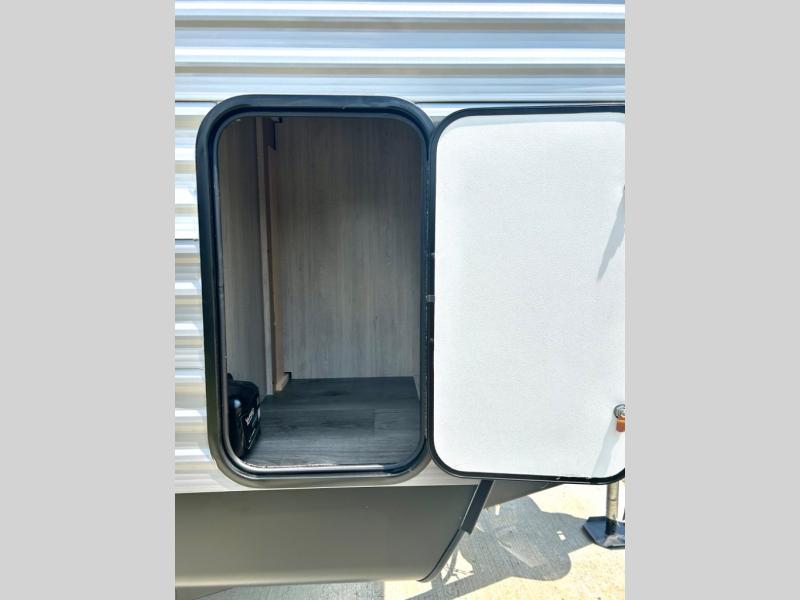 Step into comfort with this front kitchen travel trailer! You will love the amount of counter space you have to prep and cook meals. There is also an outdoor camper kitchen with a griddle and mini refrigerator for breakfast outdoors. There is plenty of storage space for all your belongings, including two kitchen pantries, overhead cabinets, a closet and a wardrobe, plus a pass-through storage. Your crew can get comfortable on the 70" sofa and booth dinette within the large slide out, and there is an entertainment center if you plan to bring your own TV. And don't overlook the rear master bedroom with a queen bed slide out, a wardrobe, plus its own exterior entry door!