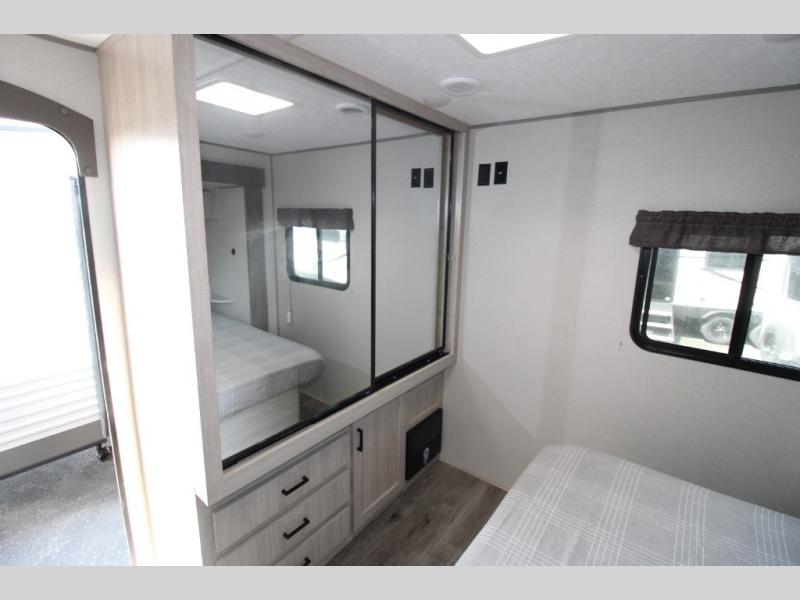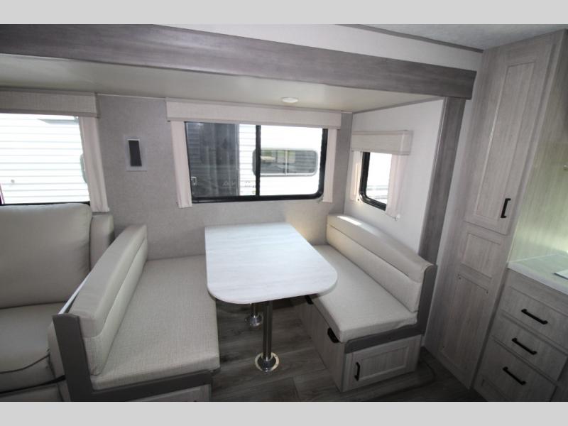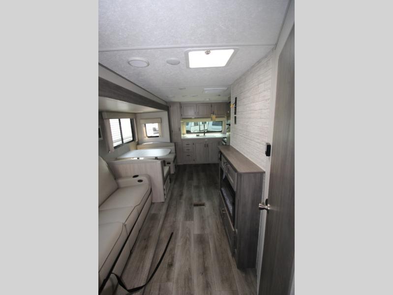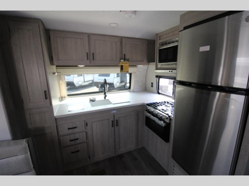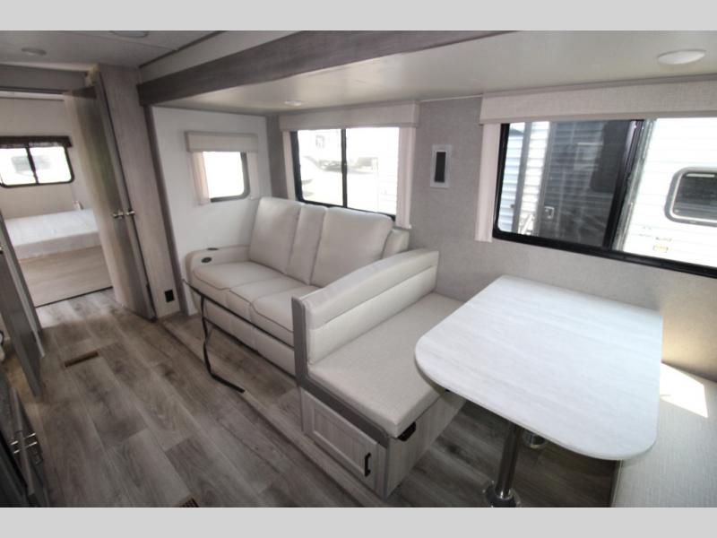 Step into comfort with this front kitchen travel trailer! You will love the amount of counter space you have to prep and cook meals. There is also an outdoor camper kitchen with a griddle and mini refrigerator for breakfast outdoors. There is plenty of storage space for all your belongings, including two kitchen pantries, overhead cabinets, a closet and a wardrobe, plus a pass-through storage. Your crew can get comfortable on the 70" sofa and booth dinette within the large slide out, and there is an entertainment center if you plan to bring your own TV. And don't overlook the rear master bedroom with a queen bed slide out, a wardrobe, plus its own exterior entry door!