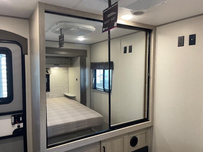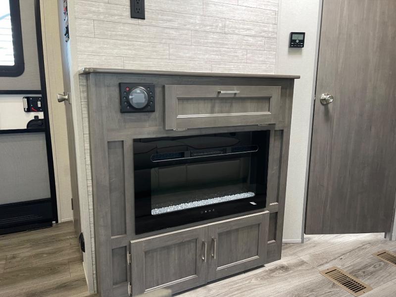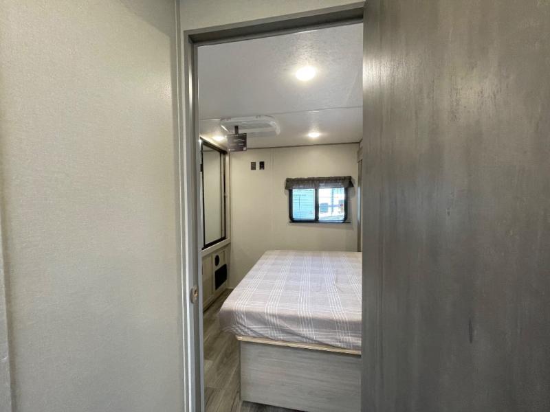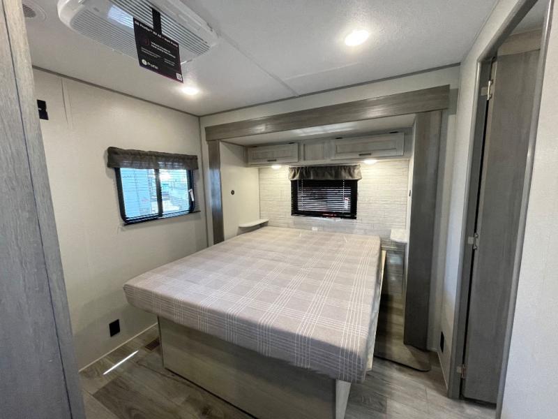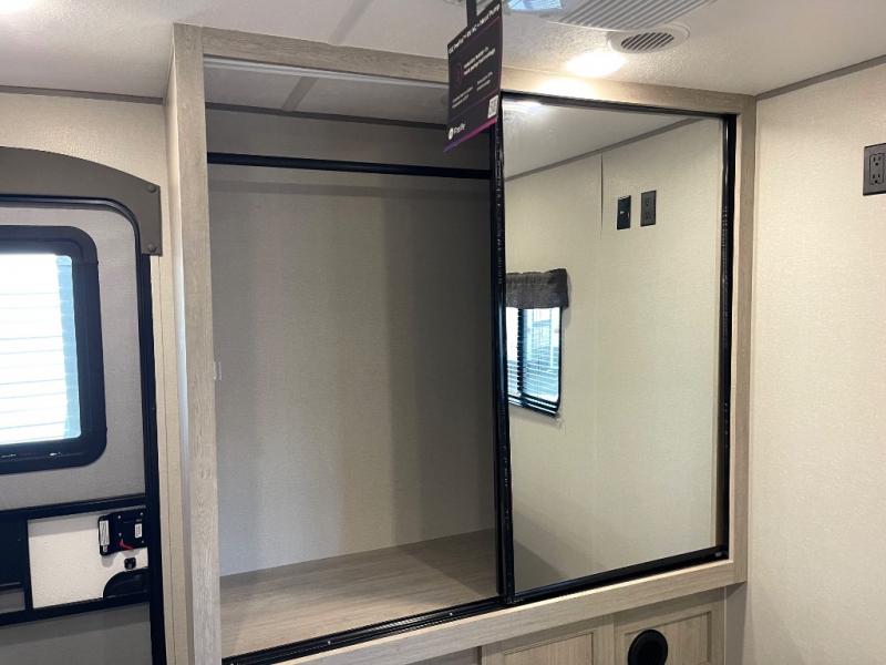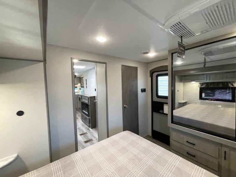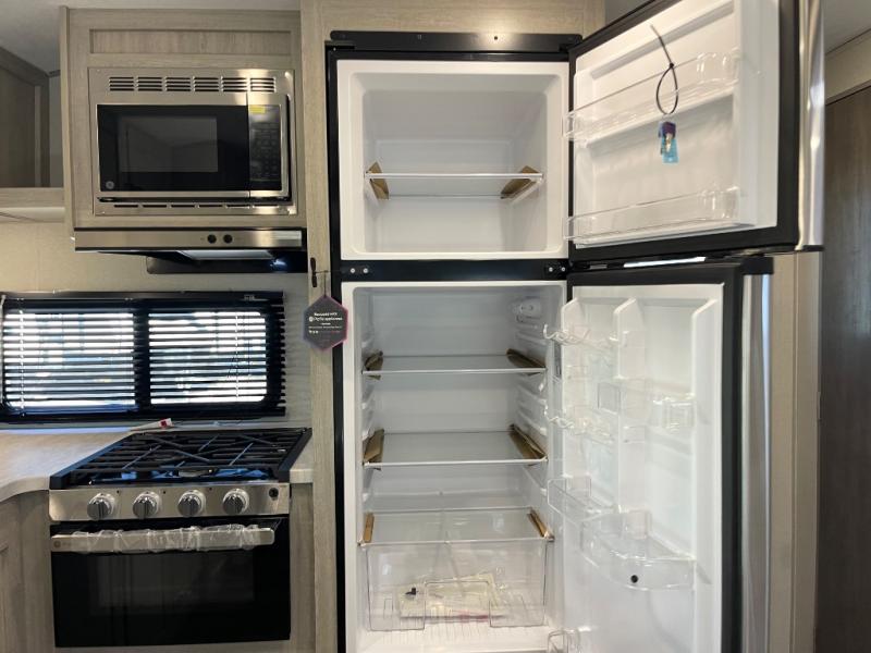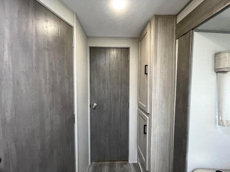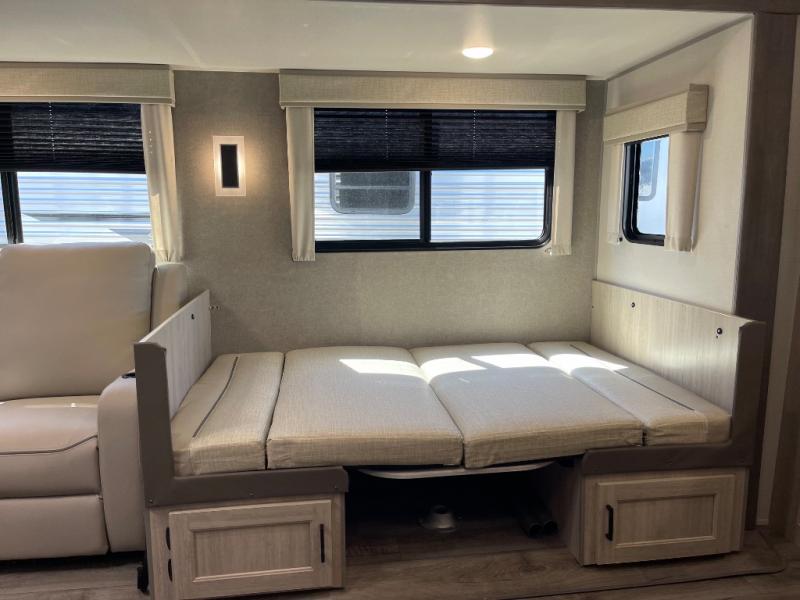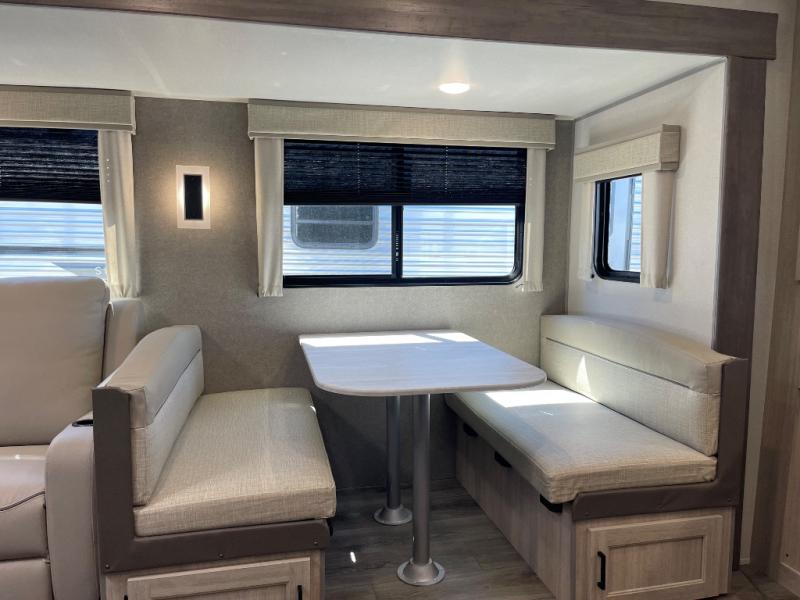 Step into comfort with this front kitchen travel trailer! You will love the amount of counter space you have to prep and cook meals. There is also an outdoor camper kitchen with a griddle and mini refrigerator for breakfast outdoors. There is plenty of storage space for all your belongings, including two kitchen pantries, overhead cabinets, a closet and a wardrobe, plus a pass-through storage. Your crew can get comfortable on the 68" sofa and booth dinette within the large slide out, and there is an entertainment center if you plan to bring your own TV. And don't overlook the rear master bedroom with a queen bed slide out, a wardrobe, plus its own exterior entry door!