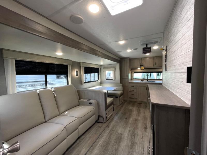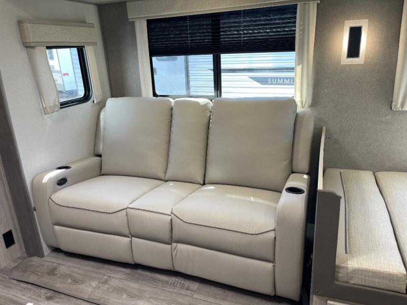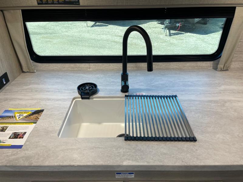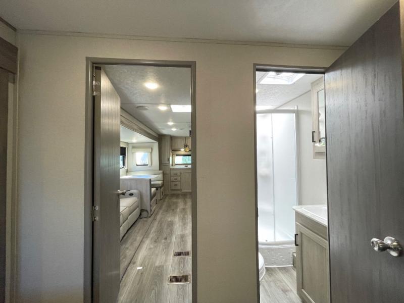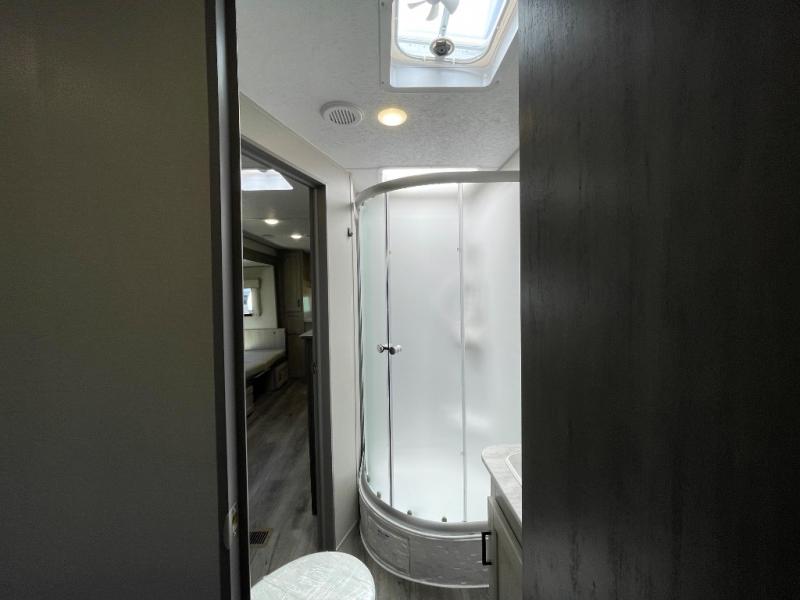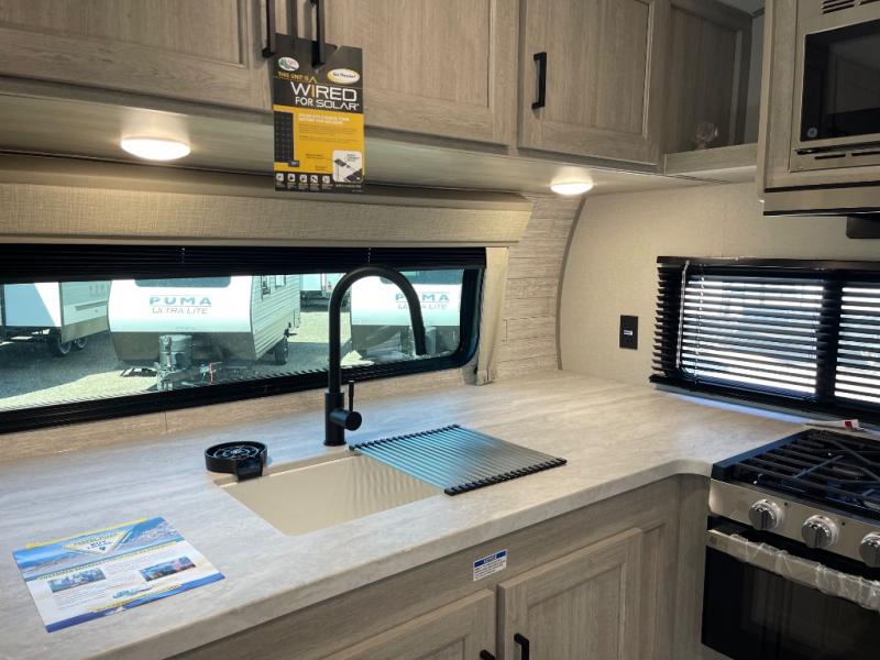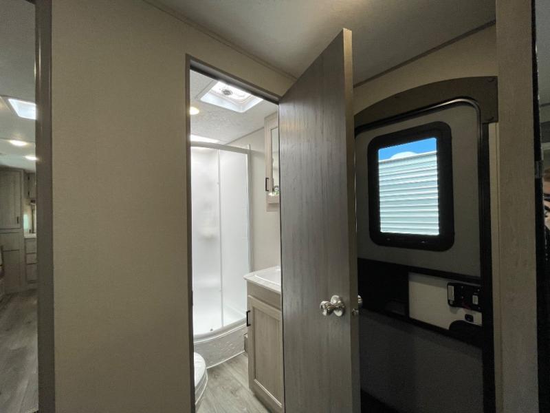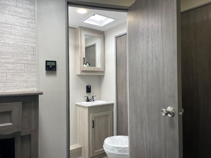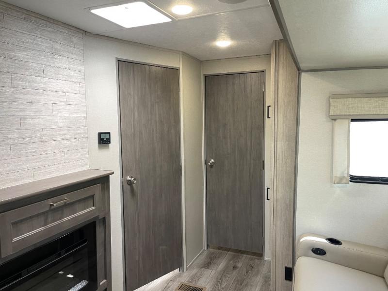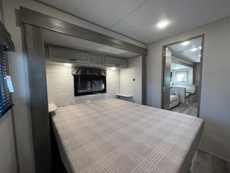 Step into comfort with this front kitchen travel trailer! You will love the amount of counter space you have to prep and cook meals. There is also an outdoor camper kitchen with a griddle and mini refrigerator for breakfast outdoors. There is plenty of storage space for all your belongings, including two kitchen pantries, overhead cabinets, a closet and a wardrobe, plus a pass-through storage. Your crew can get comfortable on the 68" sofa and booth dinette within the large slide out, and there is an entertainment center if you plan to bring your own TV. And don't overlook the rear master bedroom with a queen bed slide out, a wardrobe, plus its own exterior entry door!