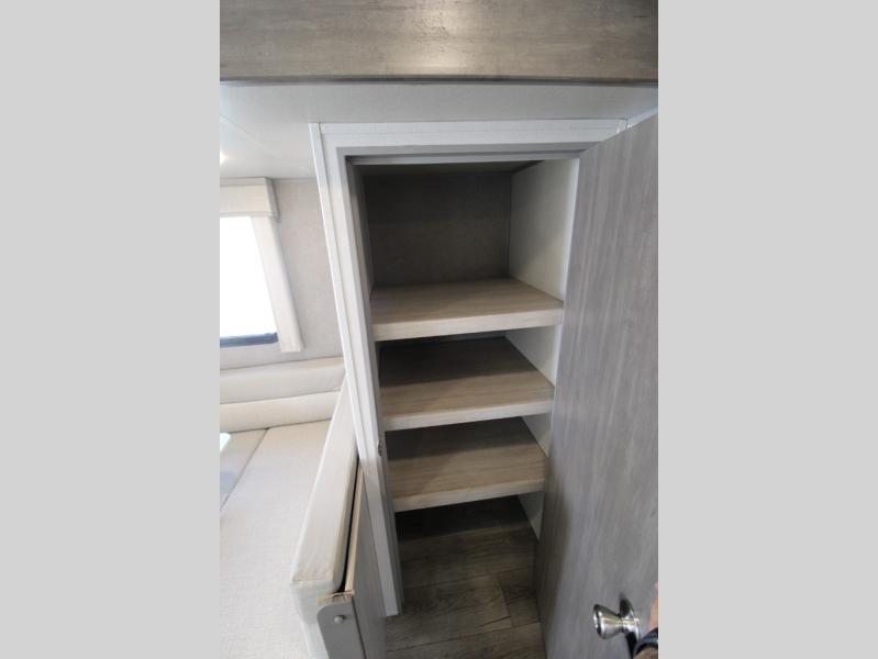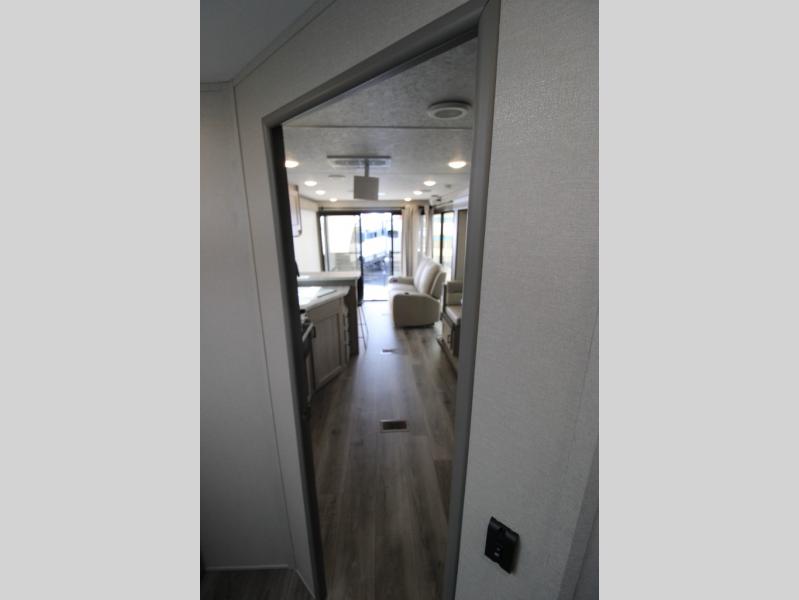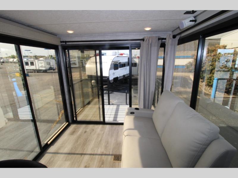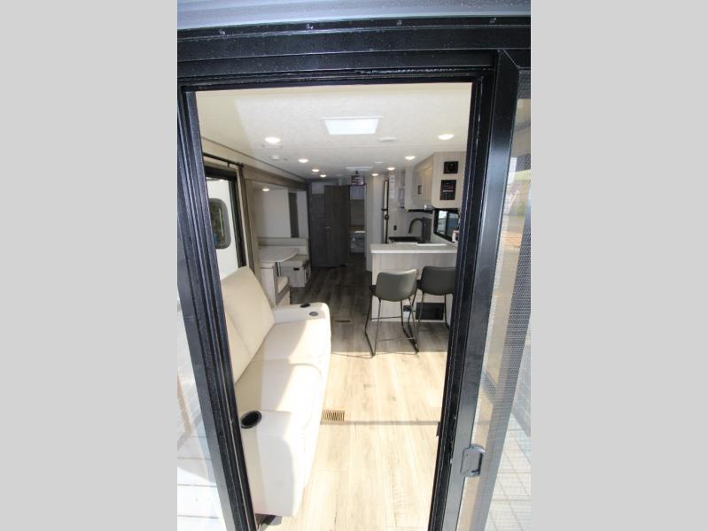 You're bound to love every minute spent in this spacious travel trailer! The rear covered porch includes an exterior entry door here and a patio door to give your unit a more residential feel. There is a sofa that can be switched out for optional theater seating, a U-shaped dinette within the large slide, plus two bar seats at the kitchen counter so everyone has a place to relax. A spacious walk-through bathroom will create a front master bedroom with a 60" x 74" queen bed, dual wardrobes, plus your own exterior entry door for convenience!