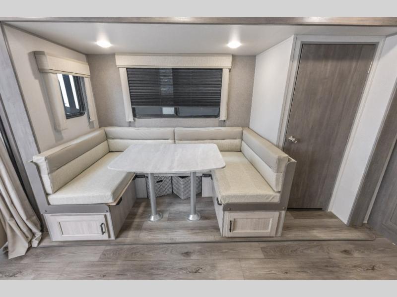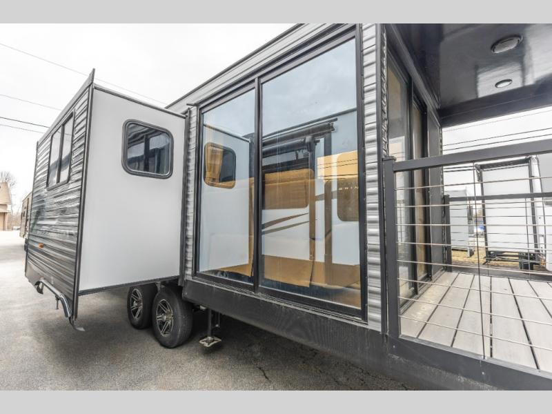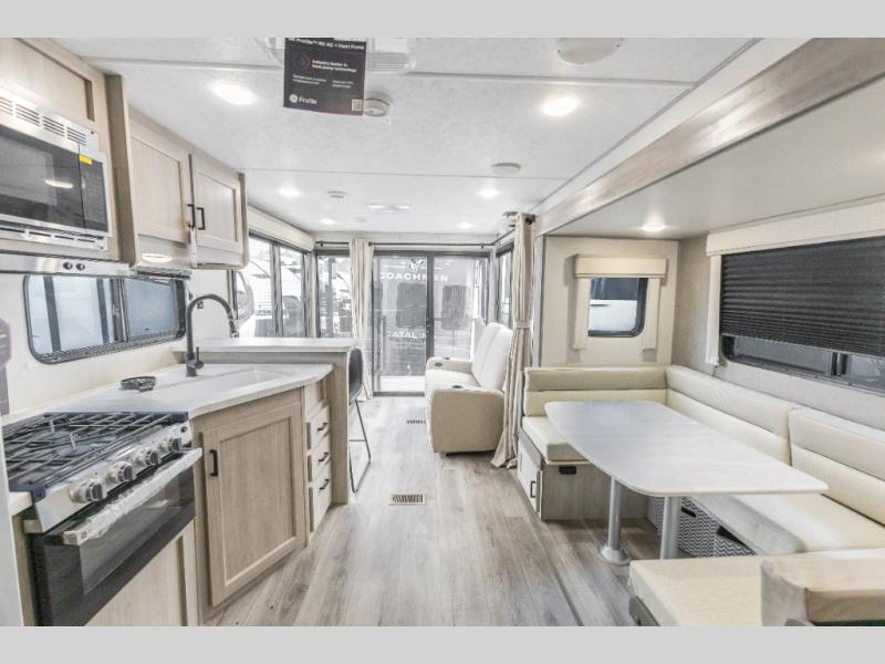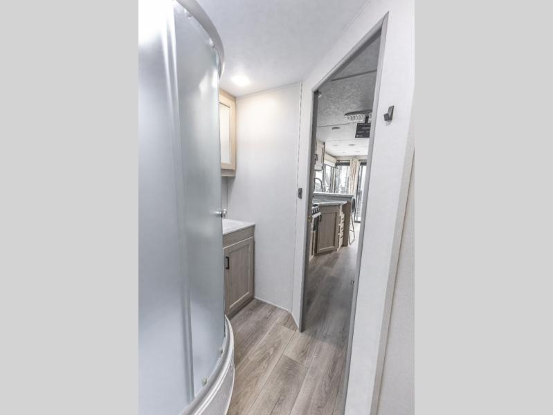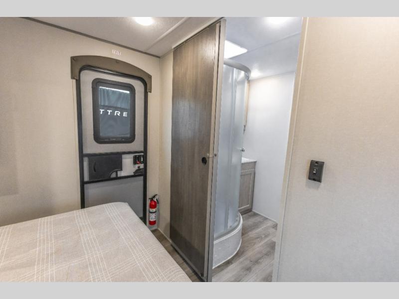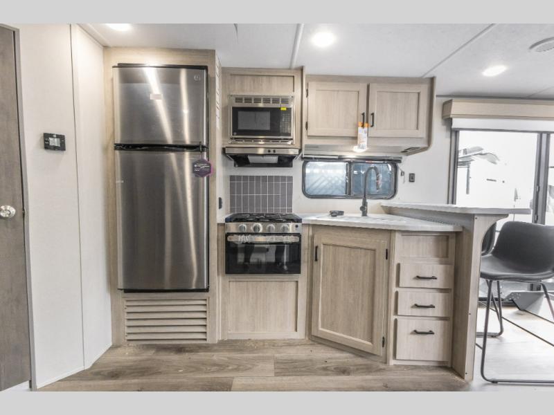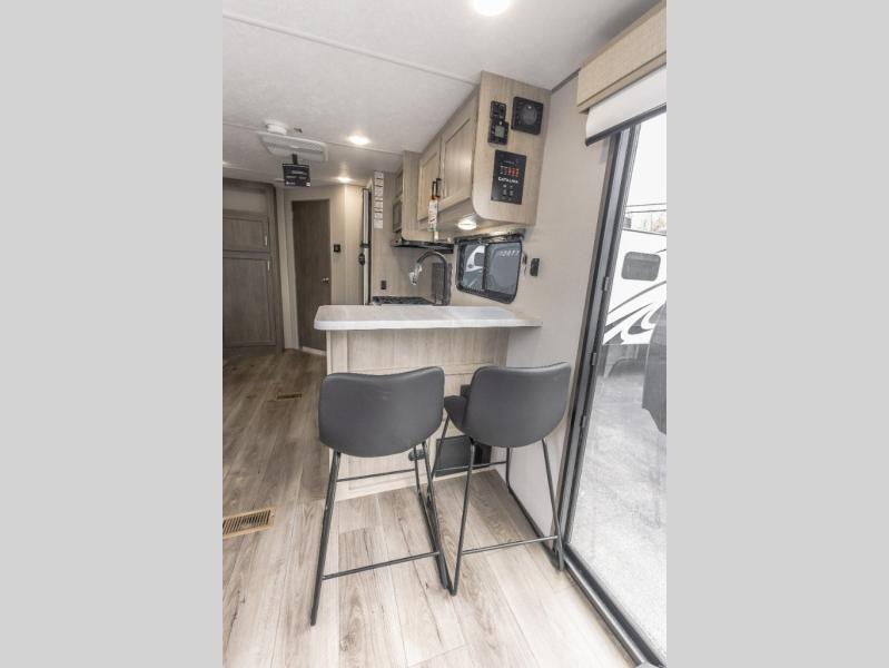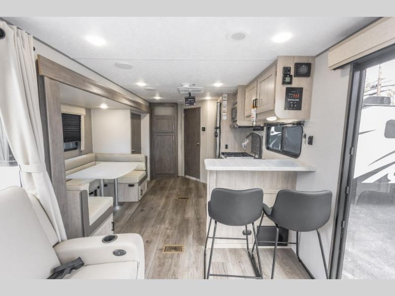 You're bound to love every minute spent in this spacious travel trailer! The rear covered porch includes an exterior entry door here and a patio door to give your unit a more residential feel. There is a sofa that can be switched out for optional theater seating, a U-shaped dinette within the large slide, plus two bar seats at the kitchen counter so everyone has a place to relax. A spacious walk-through bathroom will create a front master bedroom with a 60" x 74" queen bed, dual wardrobes, plus your own exterior entry door for convenience!