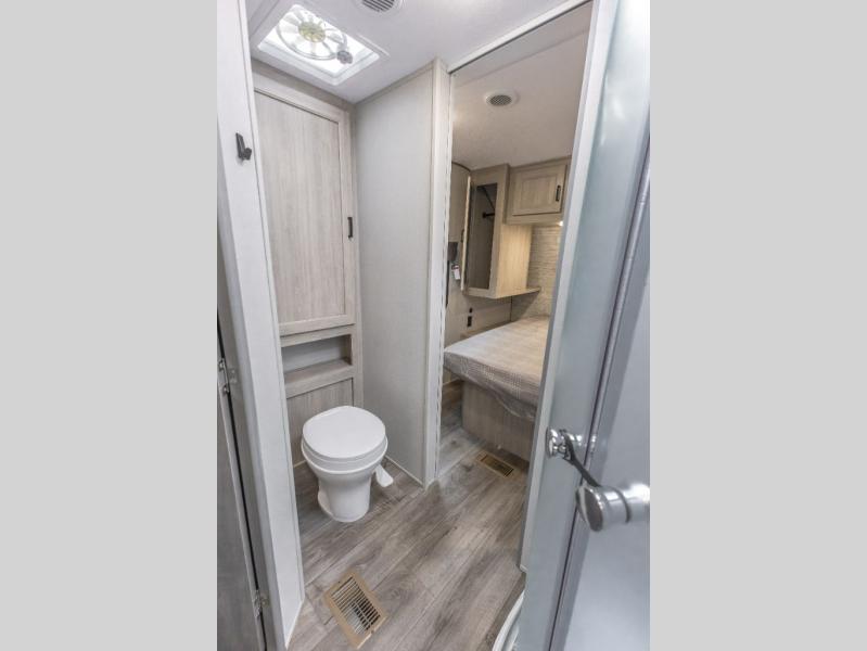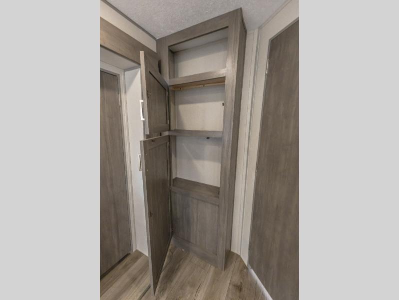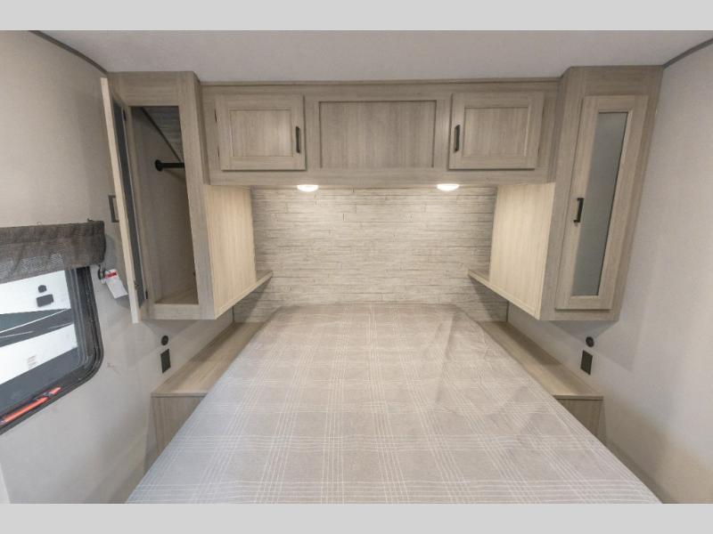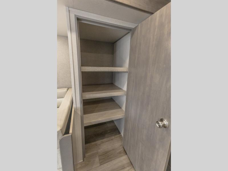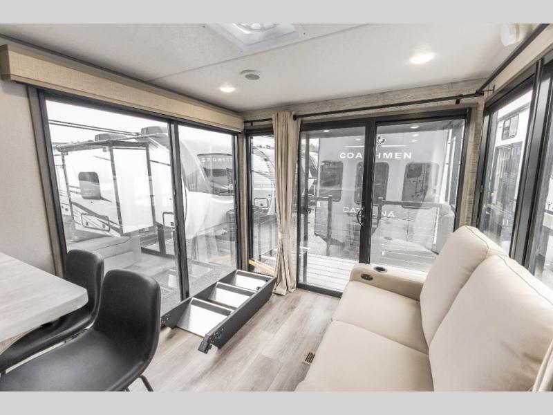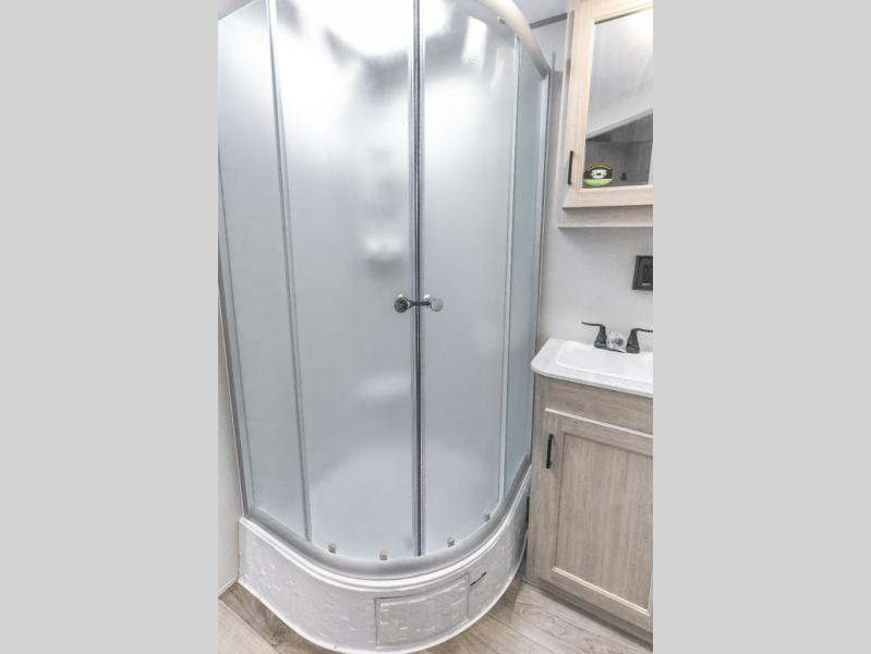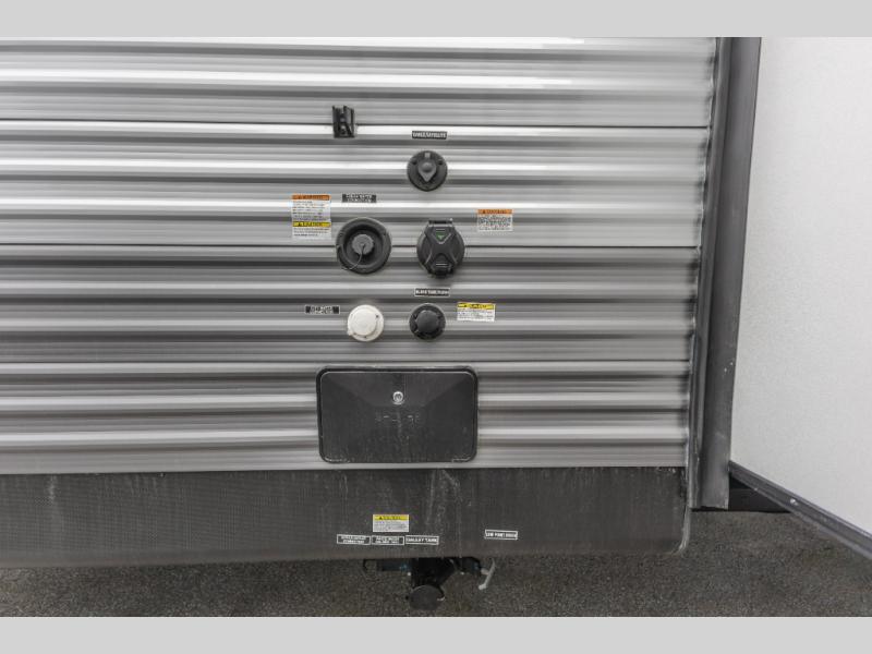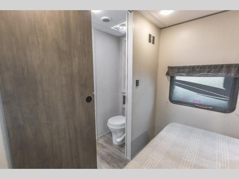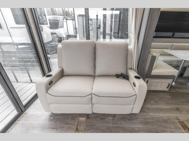 You're bound to love every minute spent in this spacious travel trailer! The rear covered porch includes an exterior entry door here and a patio door to give your unit a more residential feel. There is a sofa that can be switched out for optional theater seating, a U-shaped dinette within the large slide, plus two bar seats at the kitchen counter so everyone has a place to relax. A spacious walk-through bathroom will create a front master bedroom with a 60" x 74" queen bed, dual wardrobes, plus your own exterior entry door for convenience!