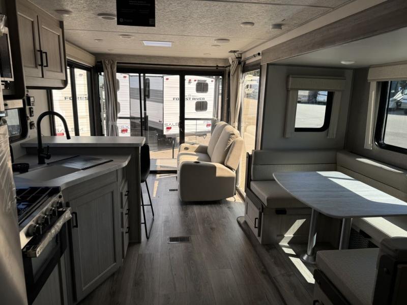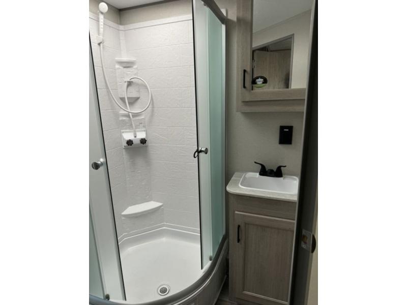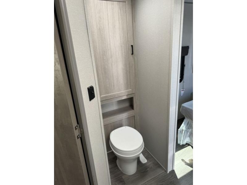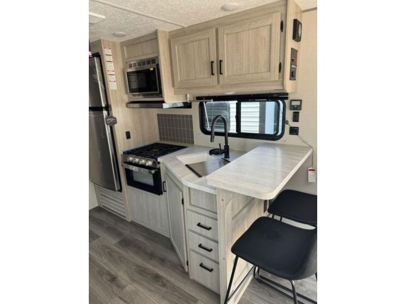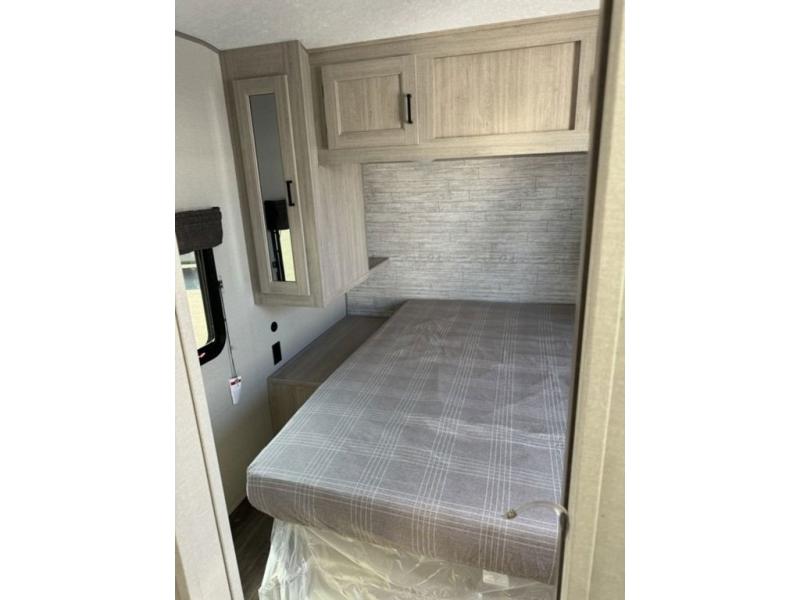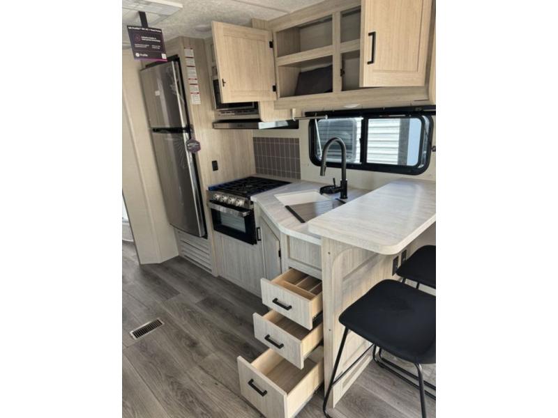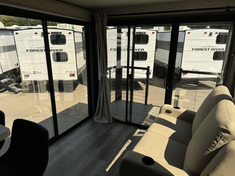 You're bound to love every minute spent in this spacious travel trailer! The rear covered porch includes an exterior entry door here and a patio door to give your unit a more residential feel. There is a sofa that can be switched out for optional theater seating, a U-shaped dinette within the large slide, plus two bar seats at the kitchen counter so everyone has a place to relax. A spacious walk-through bathroom will create a front master bedroom with a 60" x 74" queen bed, dual wardrobes, plus your own exterior entry door for convenience!