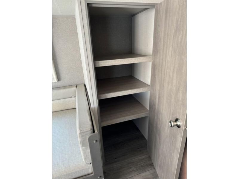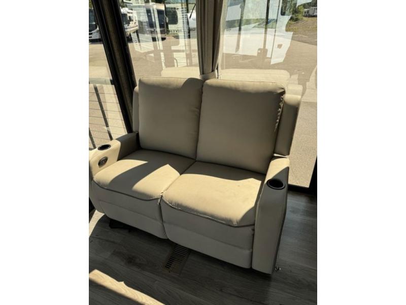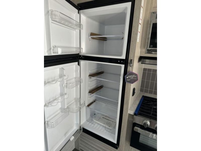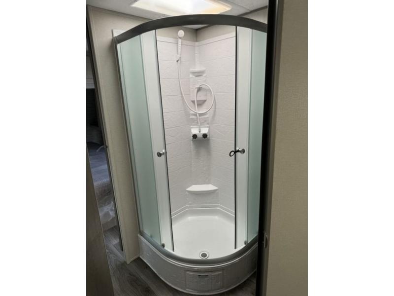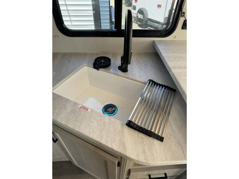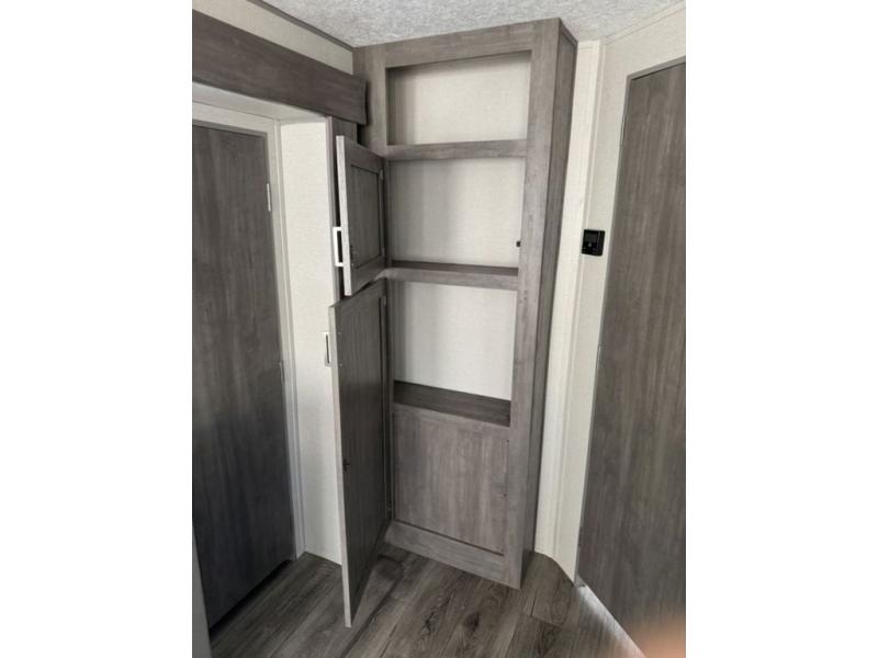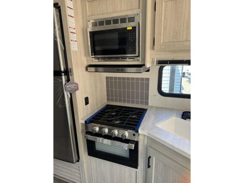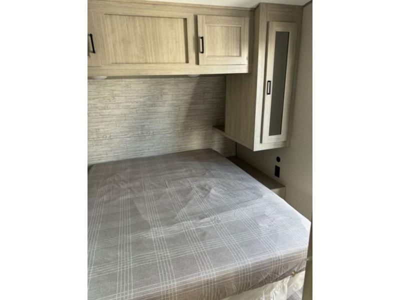 You're bound to love every minute spent in this spacious travel trailer! The rear covered porch includes an exterior entry door here and a patio door to give your unit a more residential feel. There is a sofa that can be switched out for optional theater seating, a U-shaped dinette within the large slide, plus two bar seats at the kitchen counter so everyone has a place to relax. A spacious walk-through bathroom will create a front master bedroom with a 60" x 74" queen bed, dual wardrobes, plus your own exterior entry door for convenience!