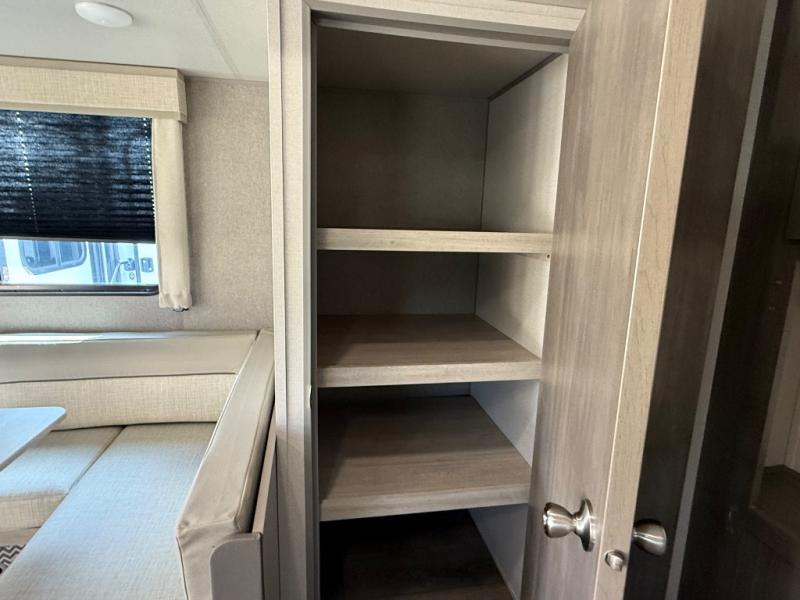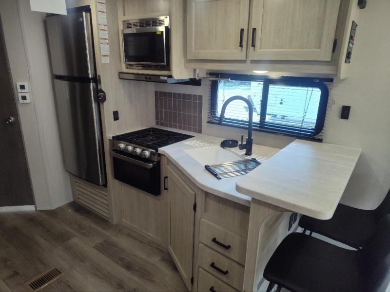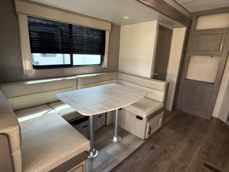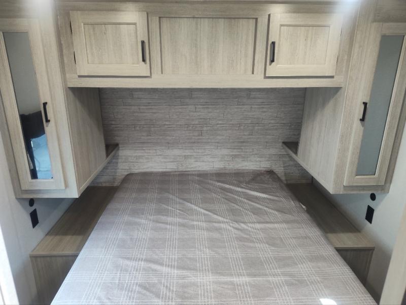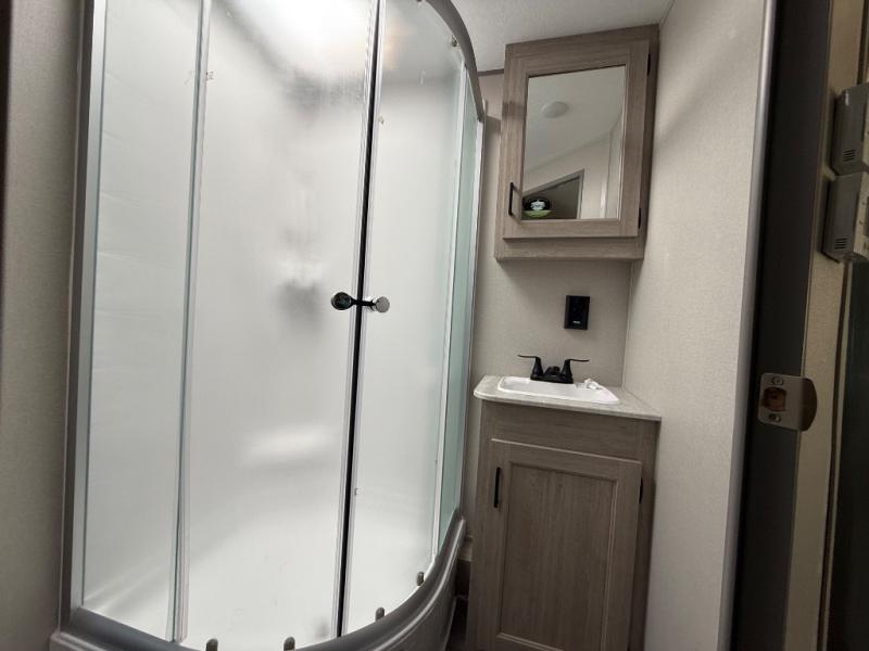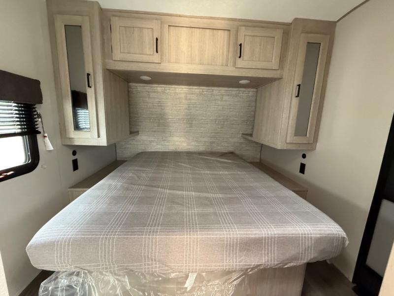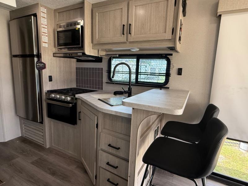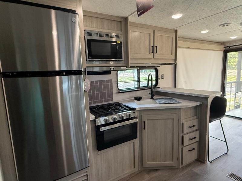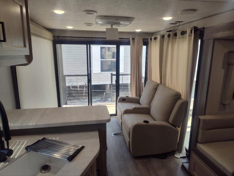 You're bound to love every minute spent in this spacious travel trailer! The rear covered porch includes an exterior entry door here and a patio door to give your unit a more residential feel. There is a sofa that can be switched out for optional theater seating, a U-shaped dinette within the large slide, plus two bar seats at the kitchen counter so everyone has a place to relax. A spacious walk-through bathroom will create a front master bedroom with a 60" x 74" queen bed, dual wardrobes, plus your own exterior entry door for convenience!