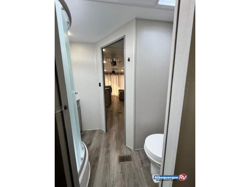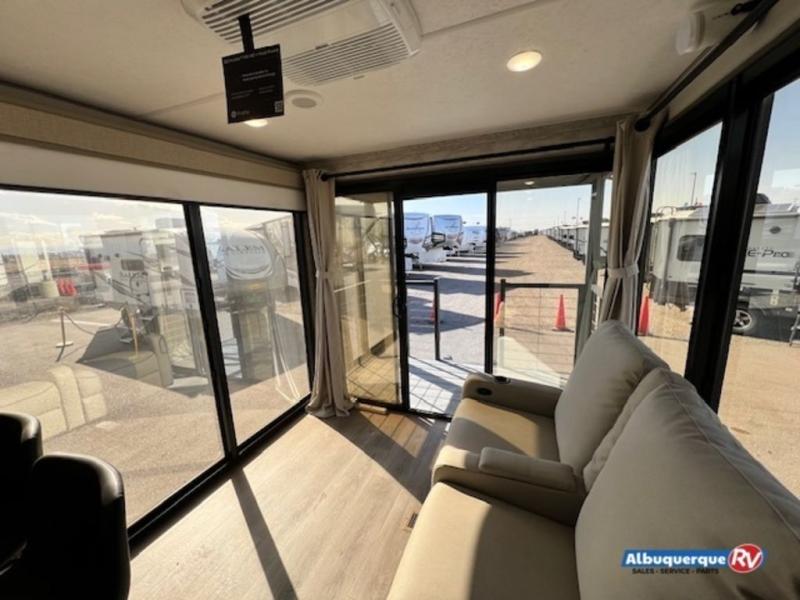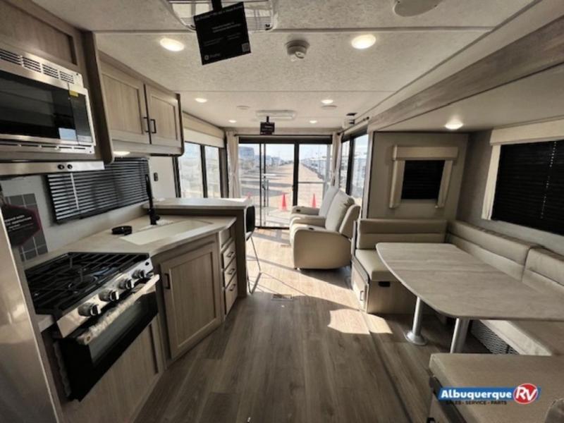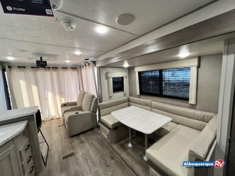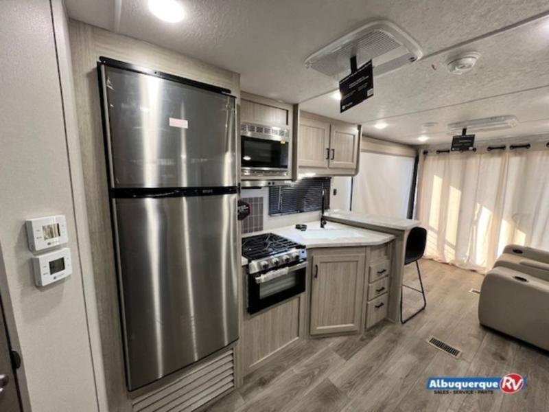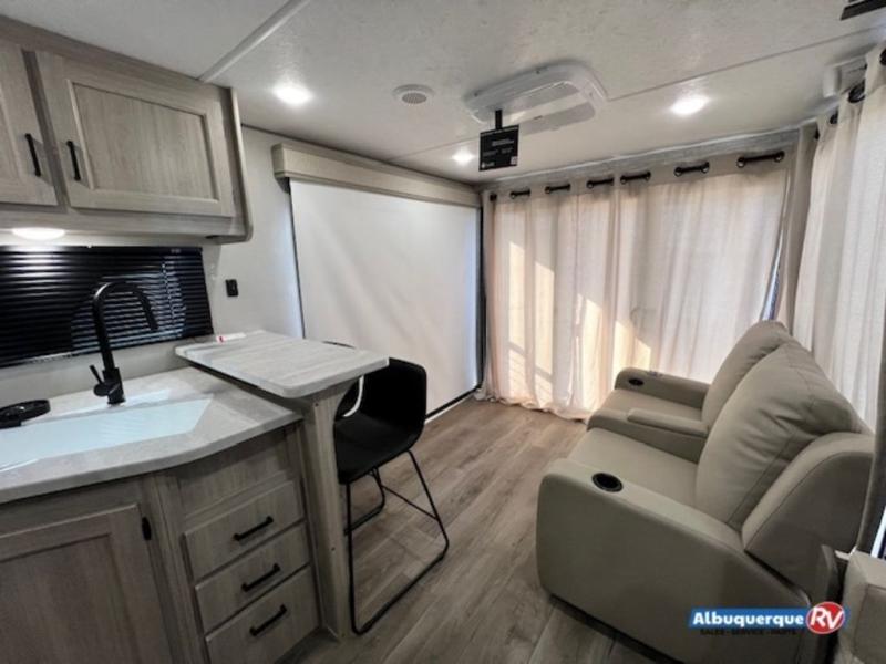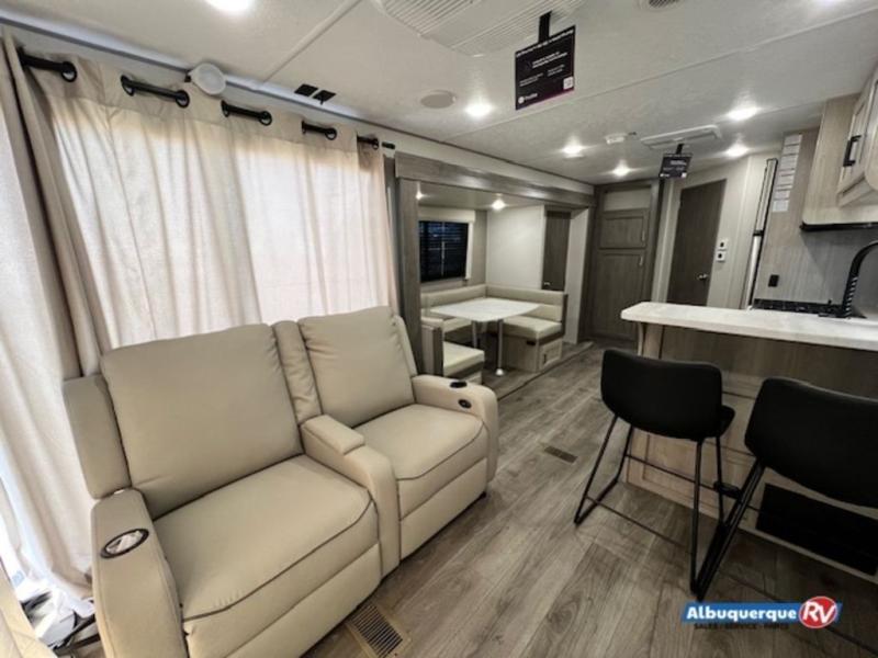 You're bound to love every minute spent in this spacious travel trailer! The rear covered porch includes an exterior entry door here and a patio door to give your unit a more residential feel. There is a sofa that can be switched out for optional theater seating, a U-shaped dinette within the large slide, plus two bar seats at the kitchen counter so everyone has a place to relax. A spacious walk-through bathroom will create a front master bedroom with a 60" x 74" queen bed, dual wardrobes, plus your own exterior entry door for convenience!
