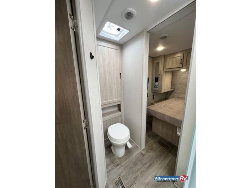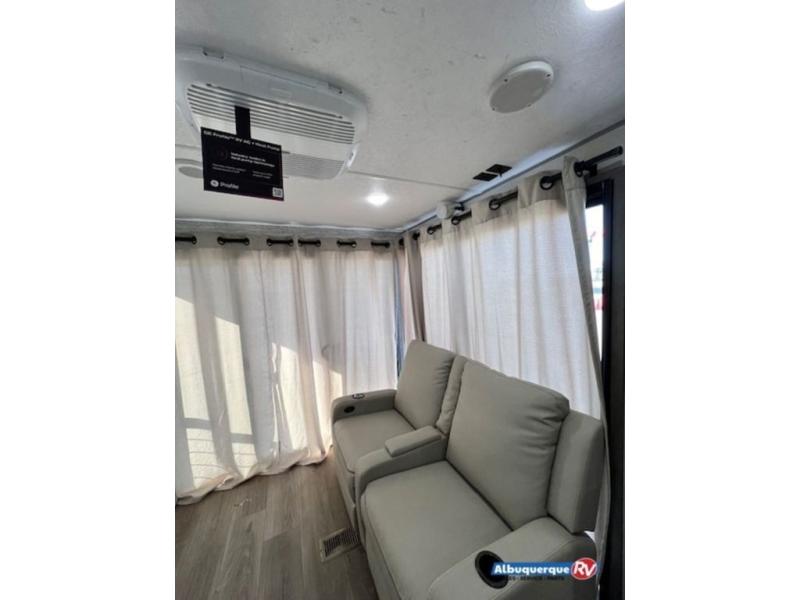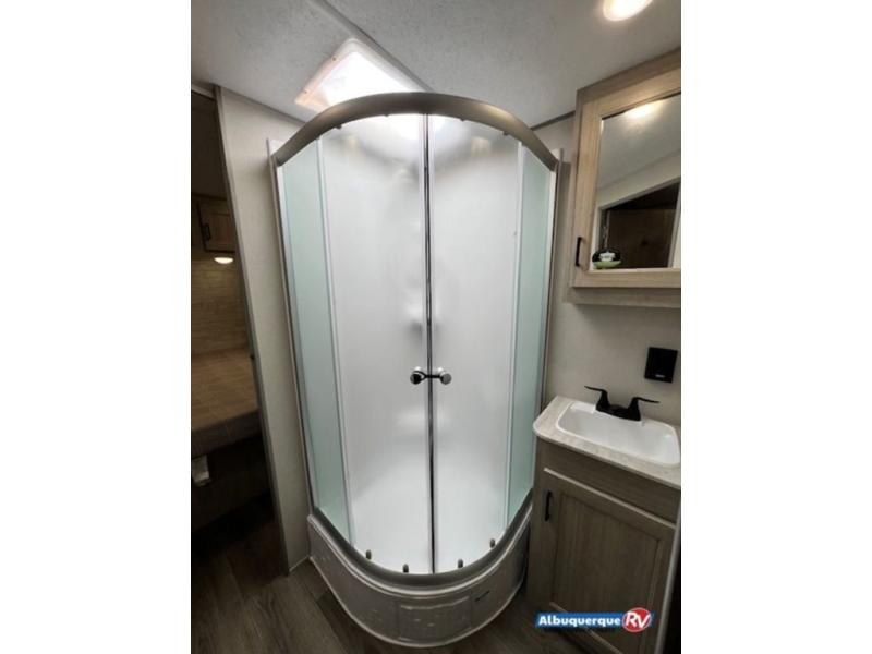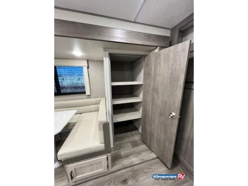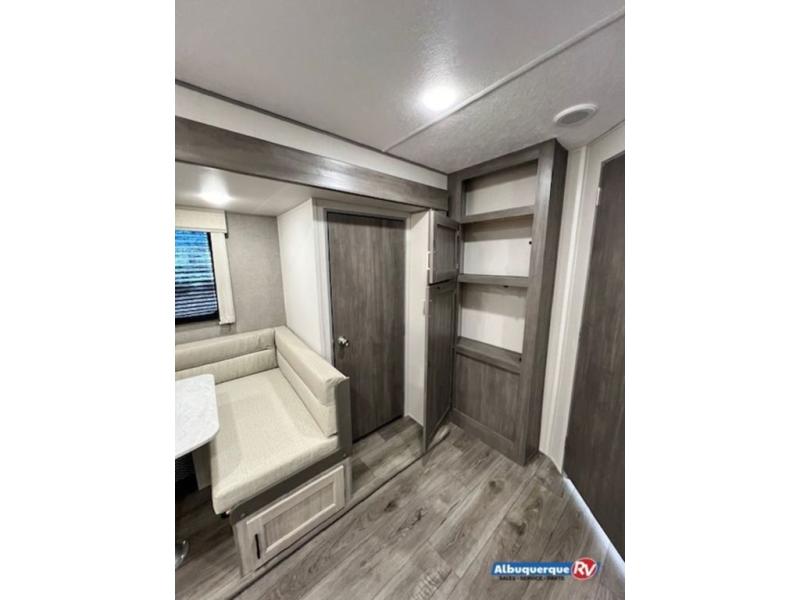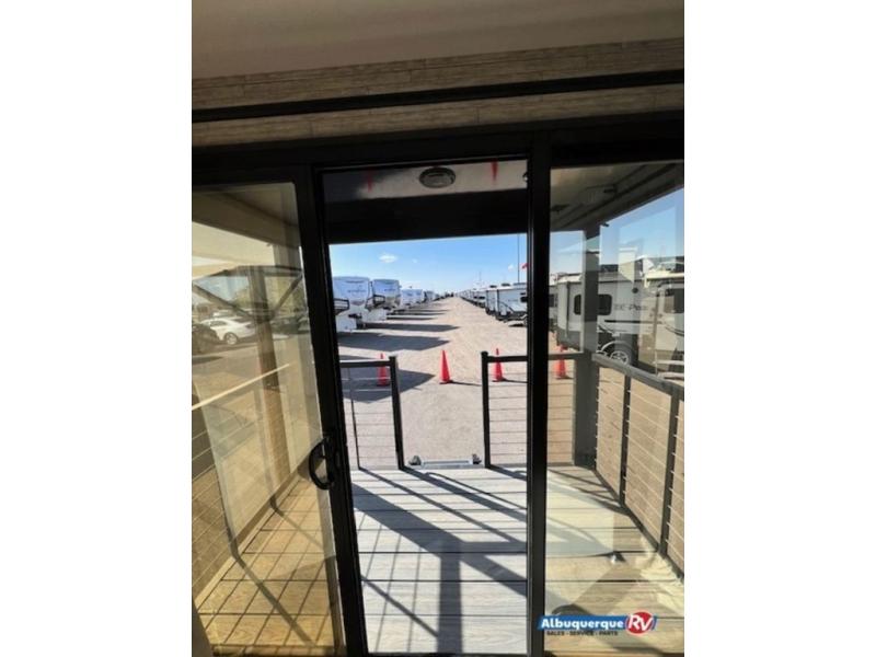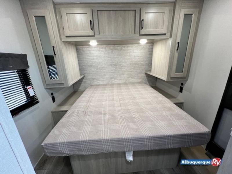 You're bound to love every minute spent in this spacious travel trailer! The rear covered porch includes an exterior entry door here and a patio door to give your unit a more residential feel. There is a sofa that can be switched out for optional theater seating, a U-shaped dinette within the large slide, plus two bar seats at the kitchen counter so everyone has a place to relax. A spacious walk-through bathroom will create a front master bedroom with a 60" x 74" queen bed, dual wardrobes, plus your own exterior entry door for convenience!