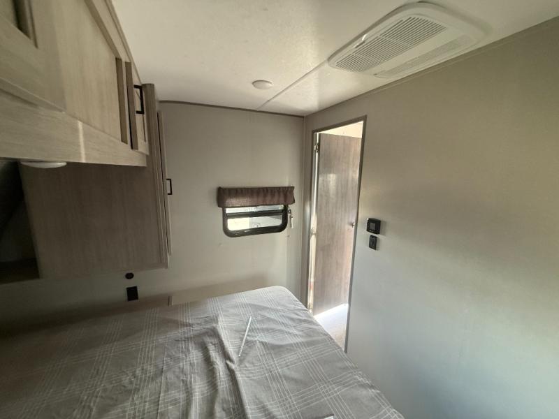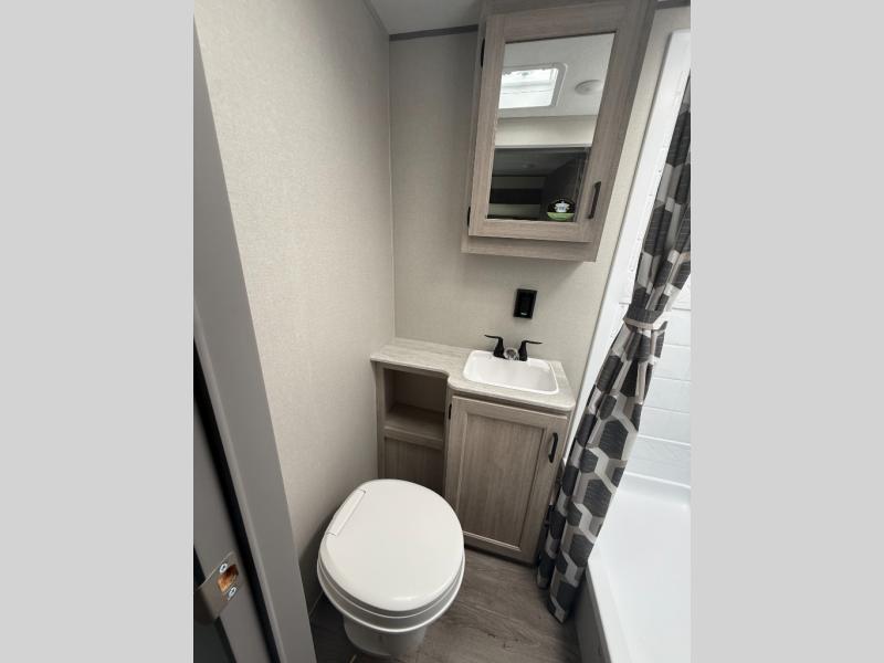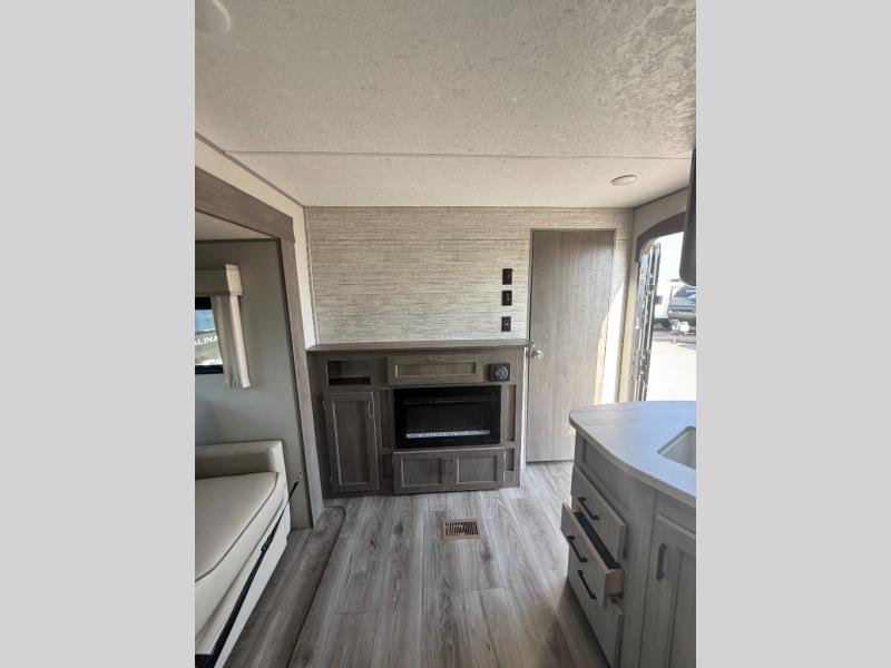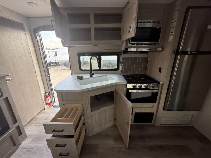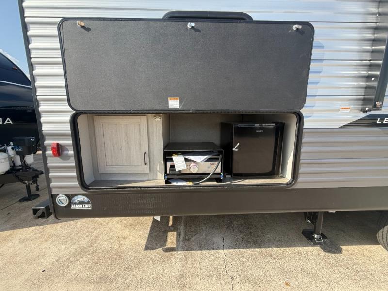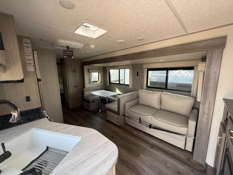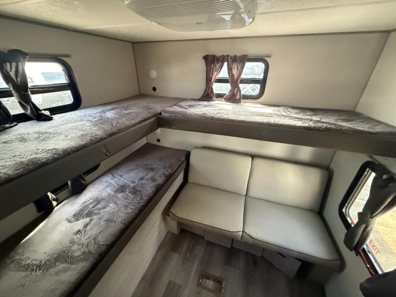 Not only will you be comfortable in this trailer, your friends will have comfort and privacy thanks to having their own bunkhouse, and you'll have a front bedroom where you can sleep like royalty! There are three bunk beds and a jack knife sofa with storage totes below plus a TV cabinet if you want to add a television here. The combined living and kitchen is spacious thanks to the slide out U-shaped dinette and sofa with drink holders. You can even add the fireplace option if you want that feature. The cook will have full amenities to whip up meals including overhead cabinets for dishes and snacks. And the exterior camper kitchen allows the cook to visit with everyone outside under the 18' electric awning that includes multicolor LED lights with a remote.