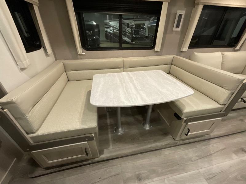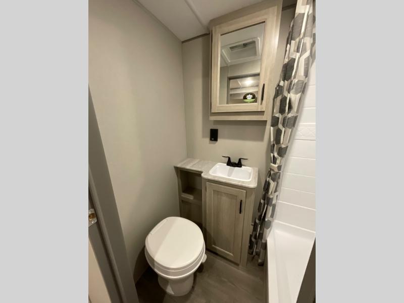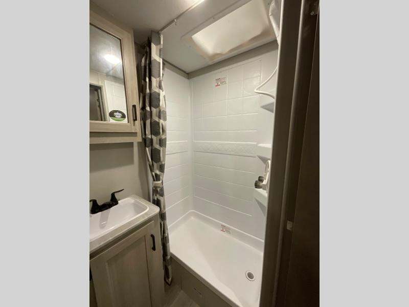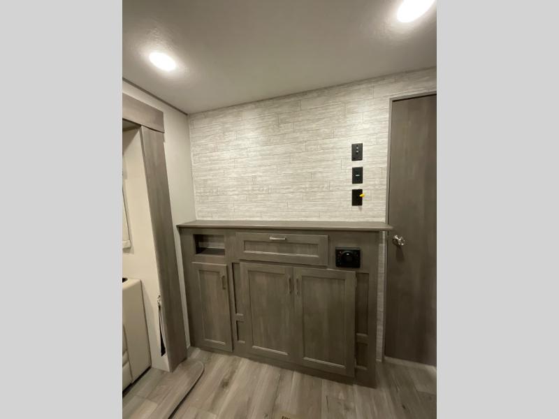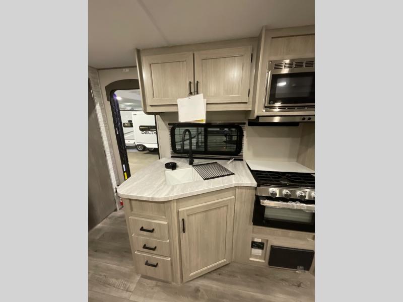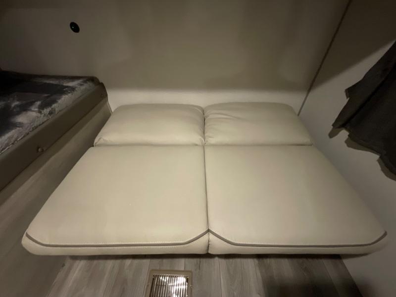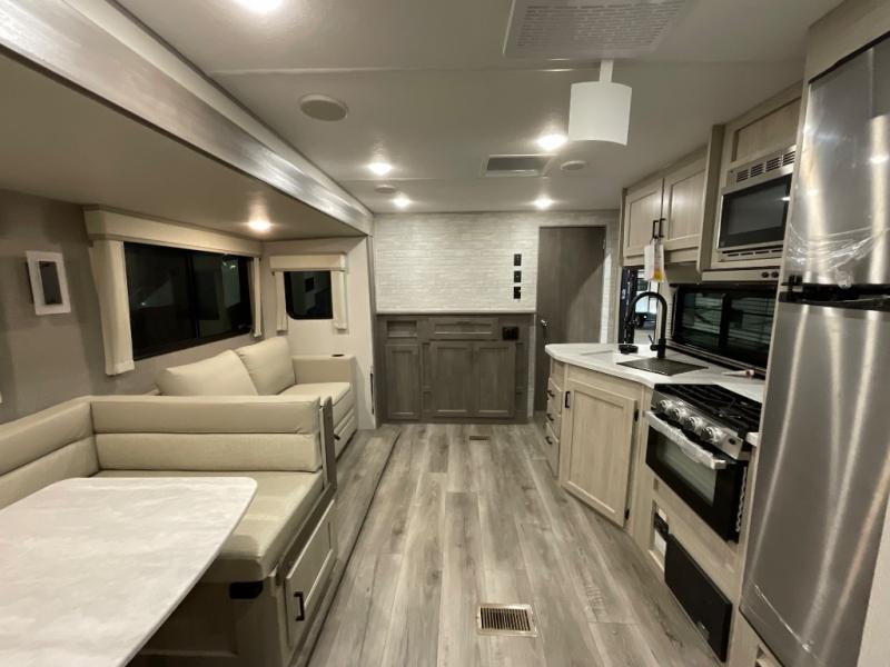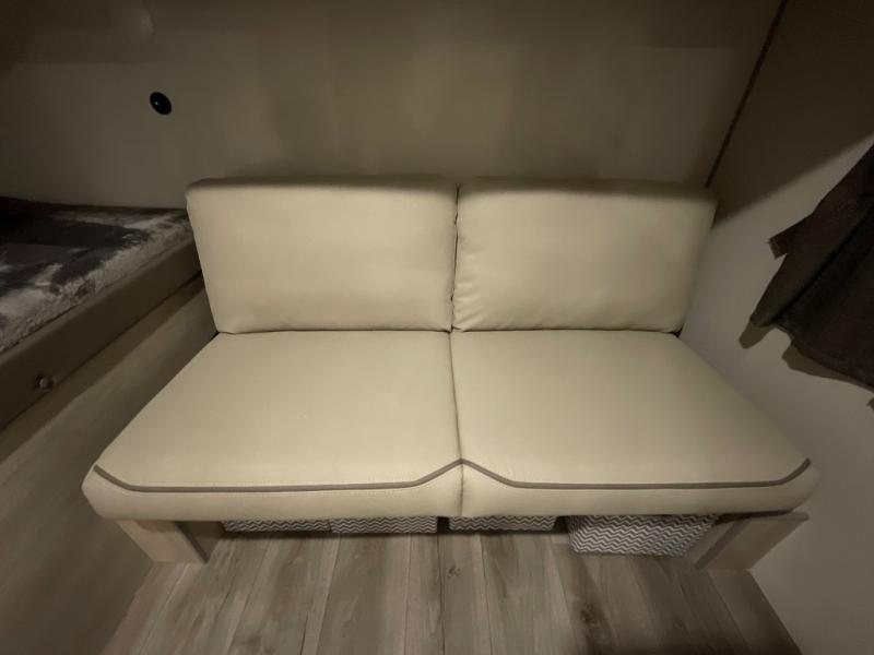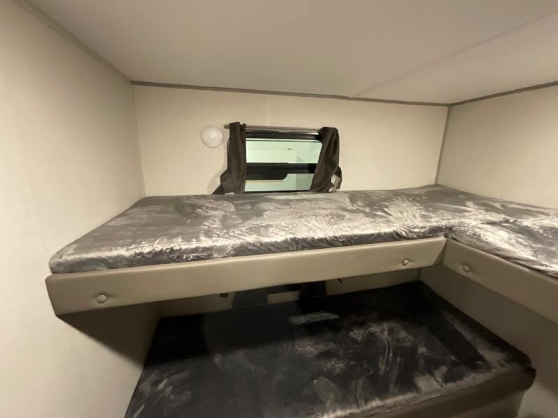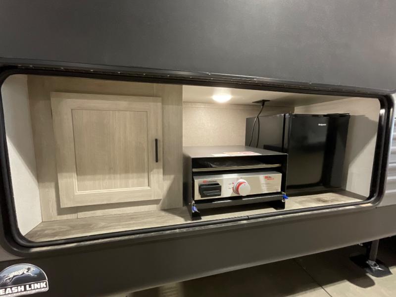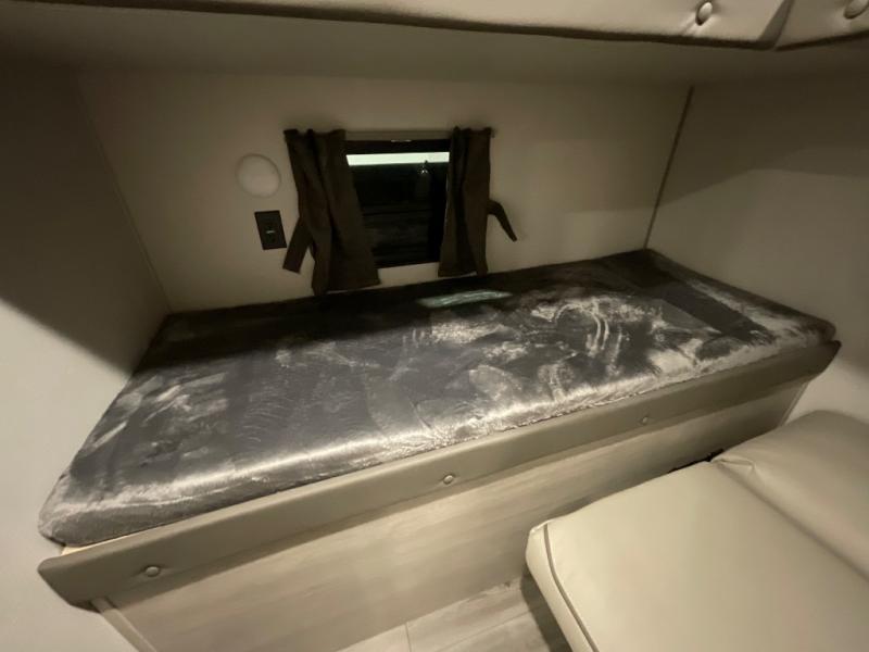 Not only will you be comfortable in this trailer, your friends will have comfort and privacy thanks to having their own bunkhouse, and you'll have a front bedroom where you can sleep like royalty! There are three bunk beds and a jack knife sofa with storage totes below plus a TV cabinet if you want to add a television here. The combined living and kitchen is spacious thanks to the slide out U-shaped dinette and sofa with drink holders. You can even add the fireplace option if you want that feature. The cook will have full amenities to whip up meals including overhead cabinets for dishes and snacks. And the exterior camper kitchen allows the cook to visit with everyone outside under the 18' electric awning that includes multicolor LED lights with a remote.