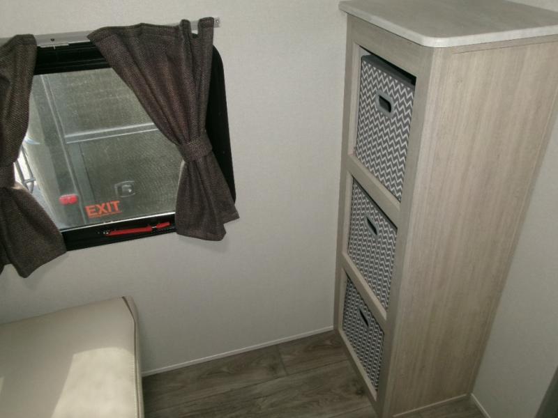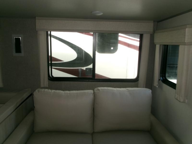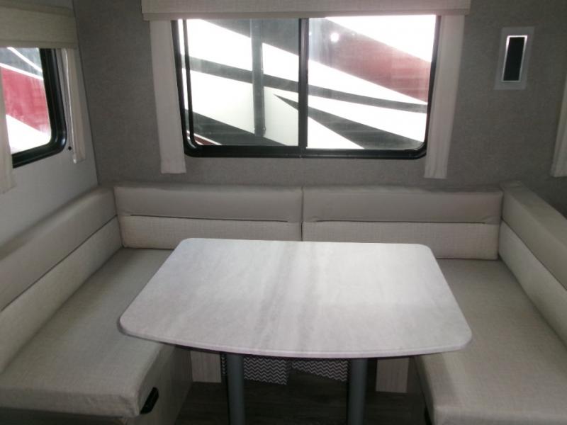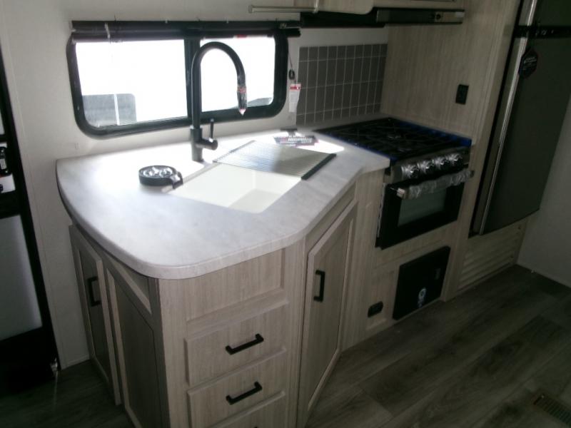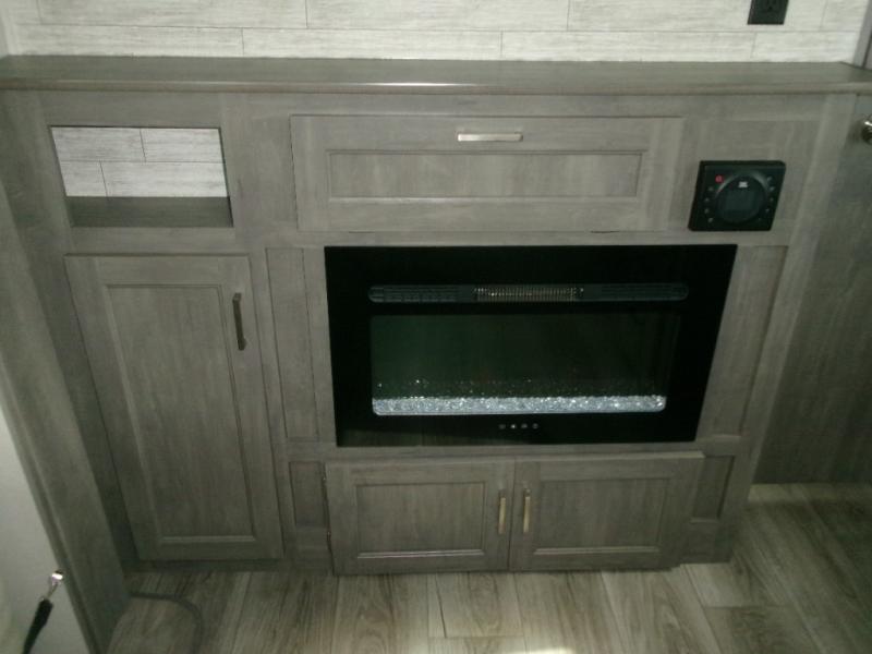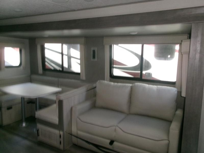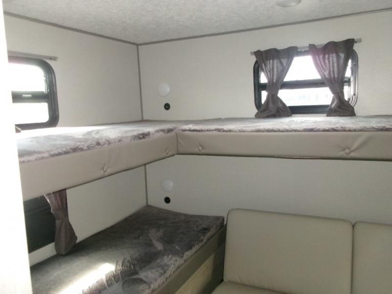 Not only will you be comfortable in this trailer, your friends will have comfort and privacy thanks to having their own bunkhouse, and you'll have a front bedroom where you can sleep like royalty! There are three bunk beds and a jack knife sofa with storage totes below plus a TV cabinet if you want to add a television here. The combined living and kitchen is spacious thanks to the slide out U-shaped dinette and sofa with drink holders. You can even add the fireplace option if you want that feature. The cook will have full amenities to whip up meals including overhead cabinets for dishes and snacks. And the exterior camper kitchen allows the cook to visit with everyone outside under the 18' electric awning that includes multicolor LED lights with a remote.