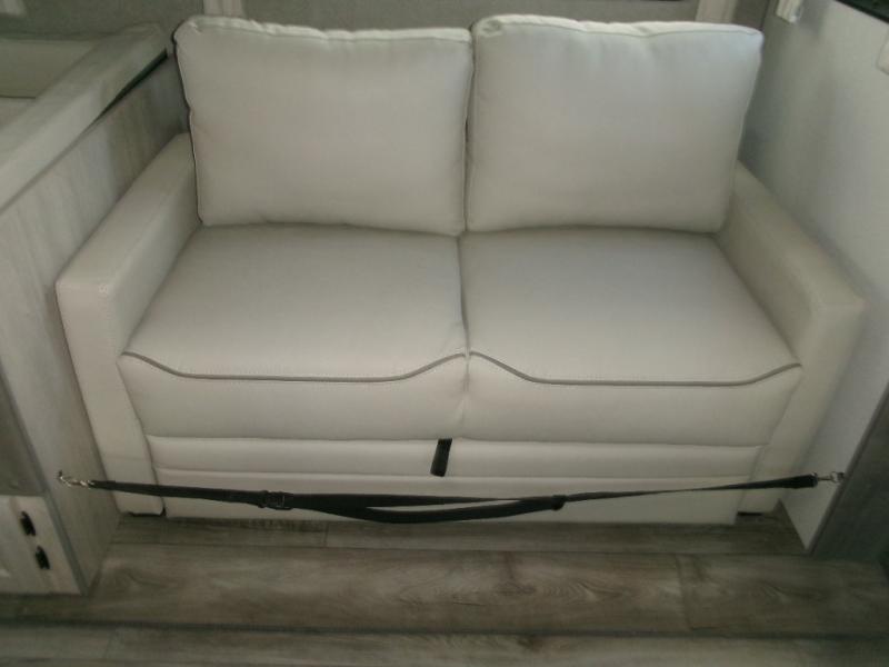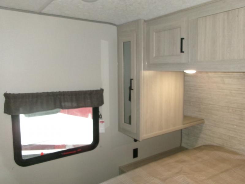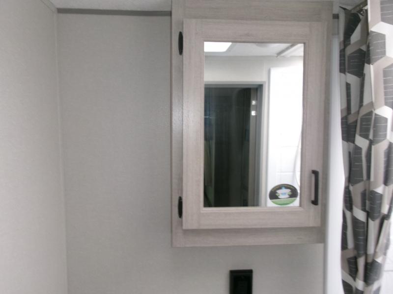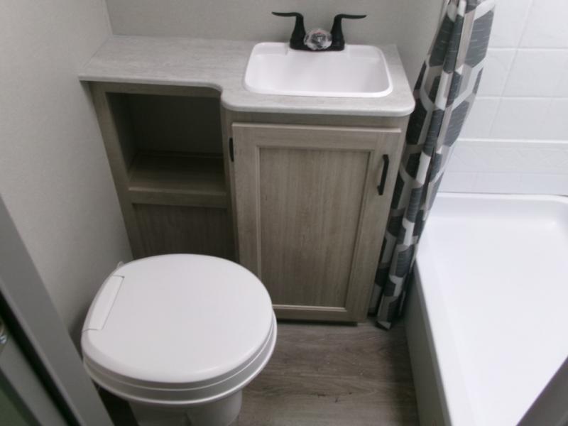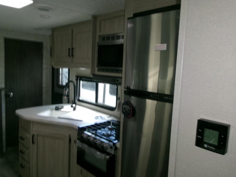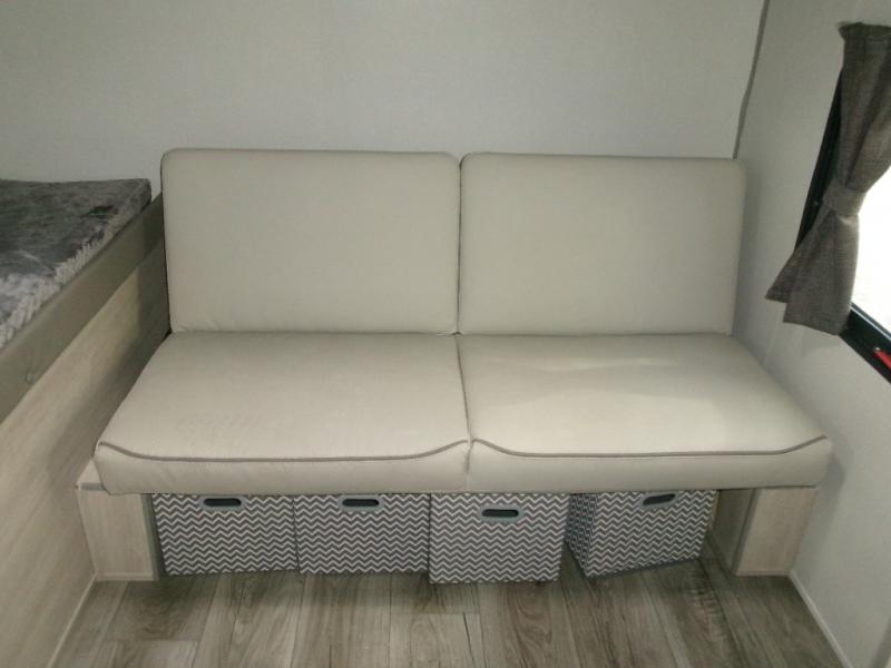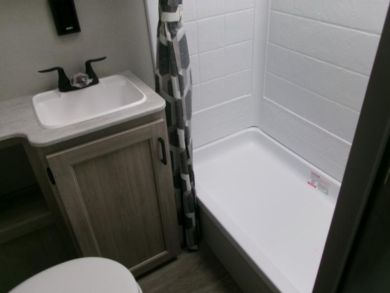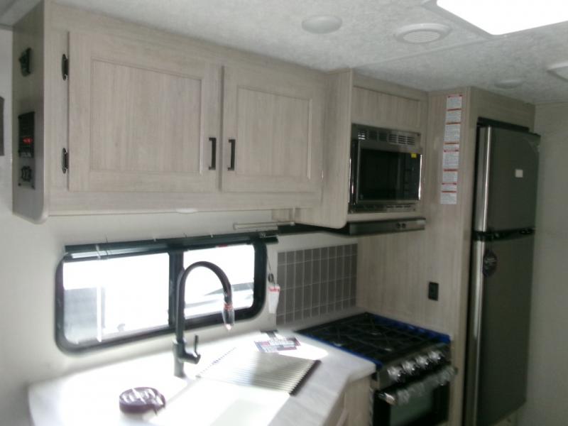 Not only will you be comfortable in this trailer, your friends will have comfort and privacy thanks to having their own bunkhouse, and you'll have a front bedroom where you can sleep like royalty! There are three bunk beds and a jack knife sofa with storage totes below plus a TV cabinet if you want to add a television here. The combined living and kitchen is spacious thanks to the slide out U-shaped dinette and sofa with drink holders. You can even add the fireplace option if you want that feature. The cook will have full amenities to whip up meals including overhead cabinets for dishes and snacks. And the exterior camper kitchen allows the cook to visit with everyone outside under the 18' electric awning that includes multicolor LED lights with a remote.