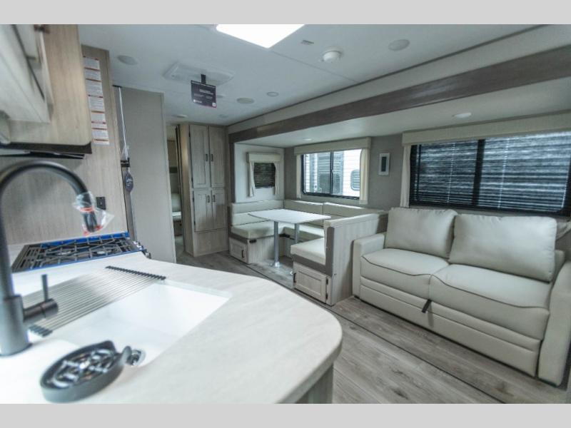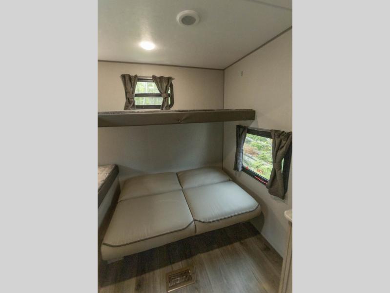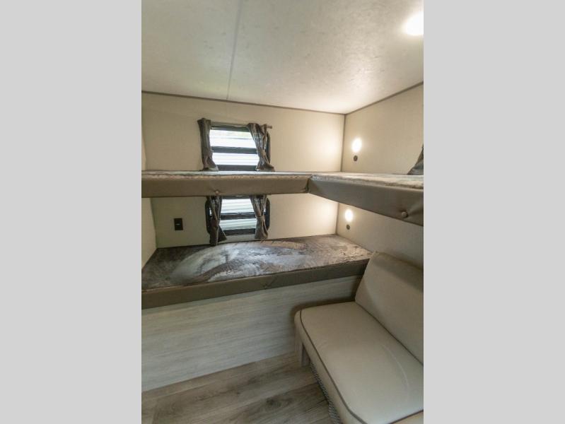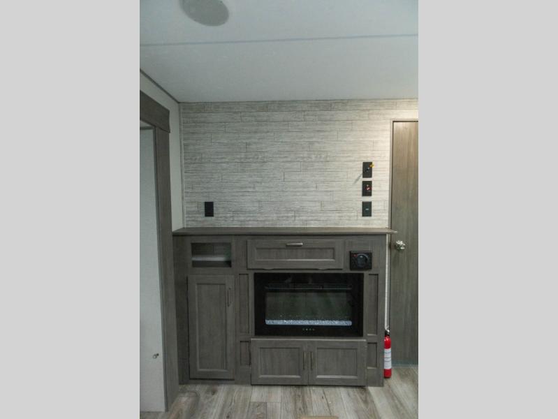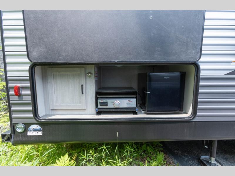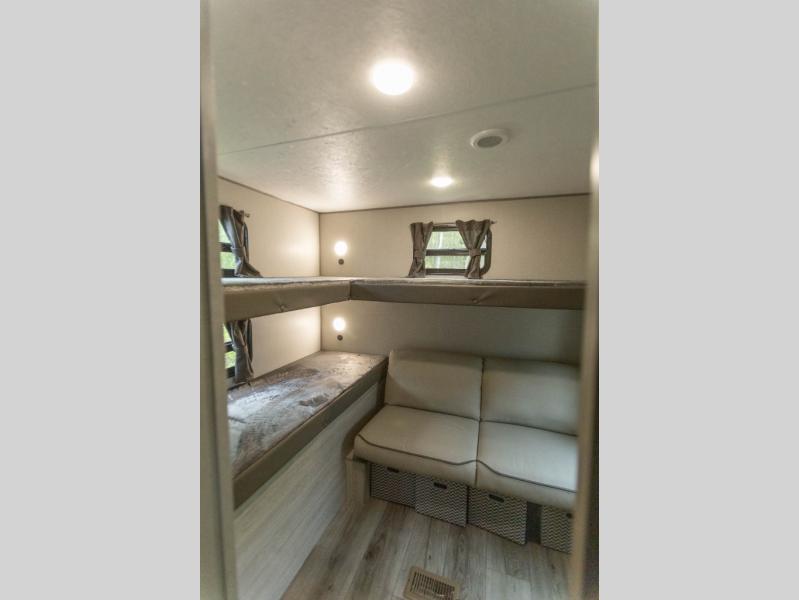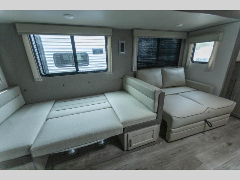 Not only will you be comfortable in this trailer, your friends will have comfort and privacy thanks to having their own bunkhouse, and you'll have a front bedroom where you can sleep like royalty! There are three bunk beds and a jack knife sofa with storage totes below plus a TV cabinet if you want to add a television here. The combined living and kitchen is spacious thanks to the slide out U-shaped dinette and sofa with drink holders. You can even add the fireplace option if you want that feature. The cook will have full amenities to whip up meals including overhead cabinets for dishes and snacks. And the exterior camper kitchen allows the cook to visit with everyone outside under the 18' electric awning that includes multicolor LED lights with a remote.