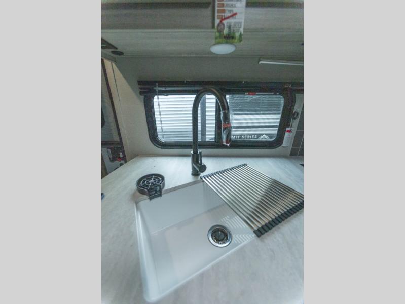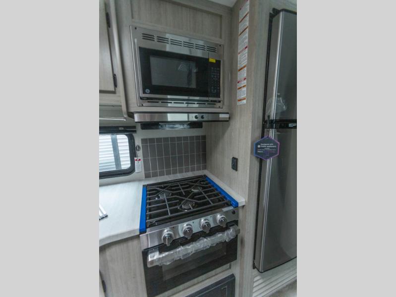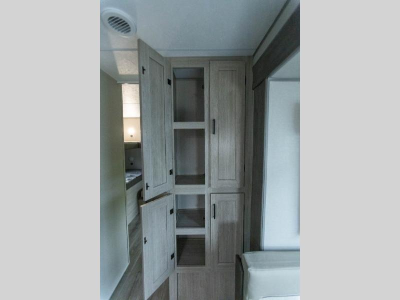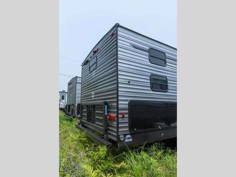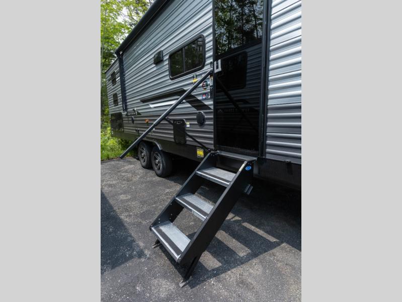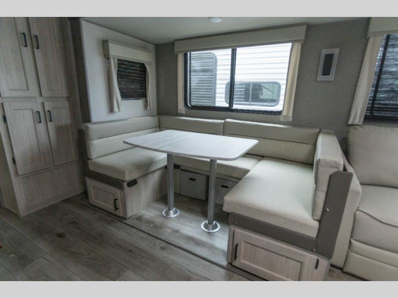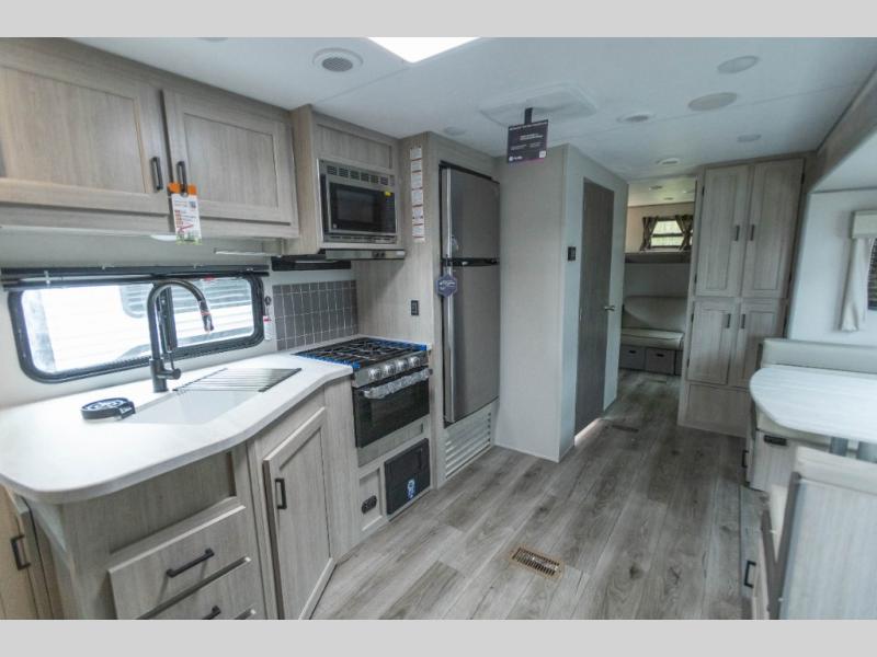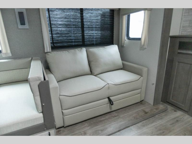 Not only will you be comfortable in this trailer, your friends will have comfort and privacy thanks to having their own bunkhouse, and you'll have a front bedroom where you can sleep like royalty! There are three bunk beds and a jack knife sofa with storage totes below plus a TV cabinet if you want to add a television here. The combined living and kitchen is spacious thanks to the slide out U-shaped dinette and sofa with drink holders. You can even add the fireplace option if you want that feature. The cook will have full amenities to whip up meals including overhead cabinets for dishes and snacks. And the exterior camper kitchen allows the cook to visit with everyone outside under the 18' electric awning that includes multicolor LED lights with a remote.