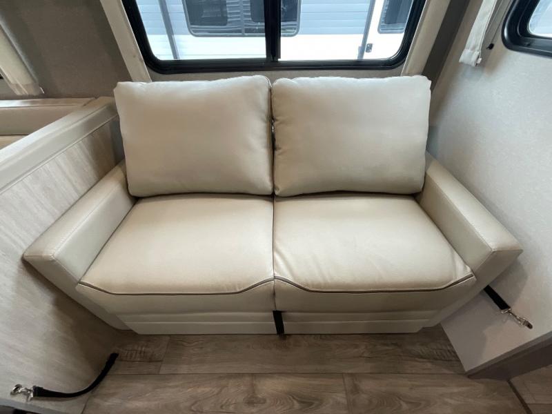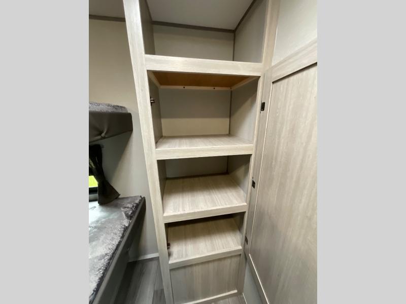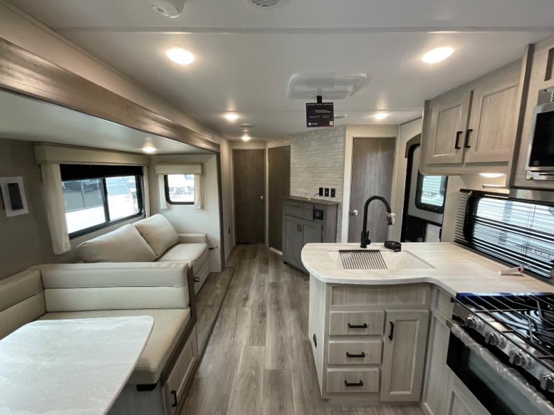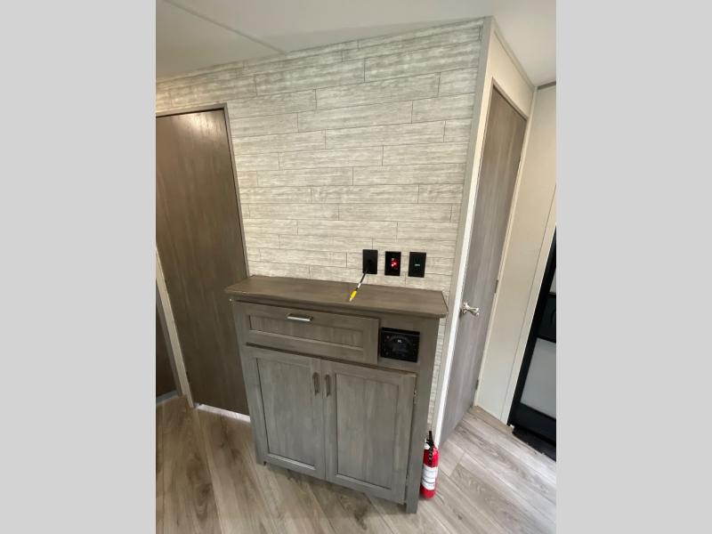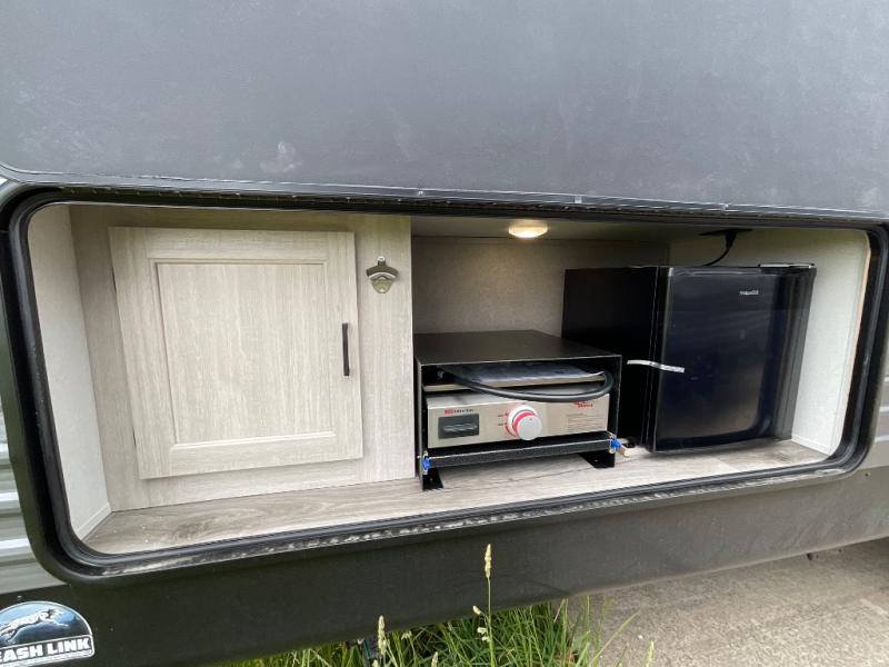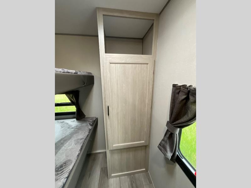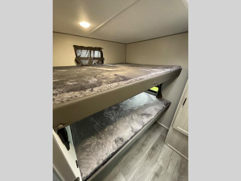 Not only will you be comfortable in this trailer, your friends will have comfort and privacy thanks to having their own bunkhouse with queen-size bunk beds, underbed storage, and a linen closet for clean clothes! The front master bedroom includes a walk-around queen bed, dual wardrobes, plus quick access to the dual entry bath! The combined living and kitchen is spacious thanks to the slide out U-shaped dinette and sofa with drink holders. You can even add the fireplace option if you want that feature. The cook will have full amenities to whip up meals including overhead cabinets for dishes and snacks, plus an outdoor camper kitchen with a pull-out griddle, a cabinet, and a refrigerator!