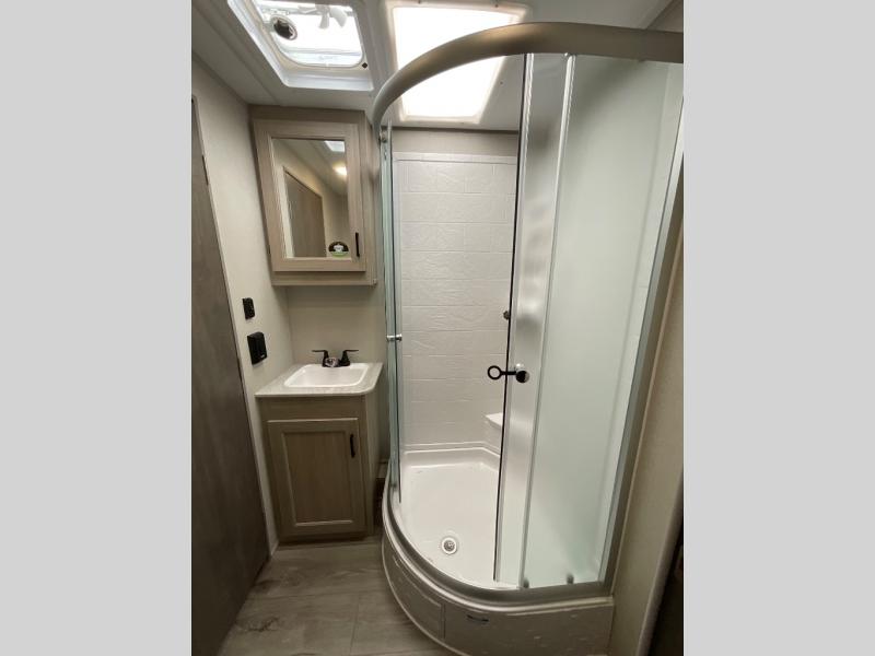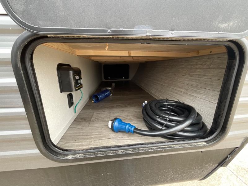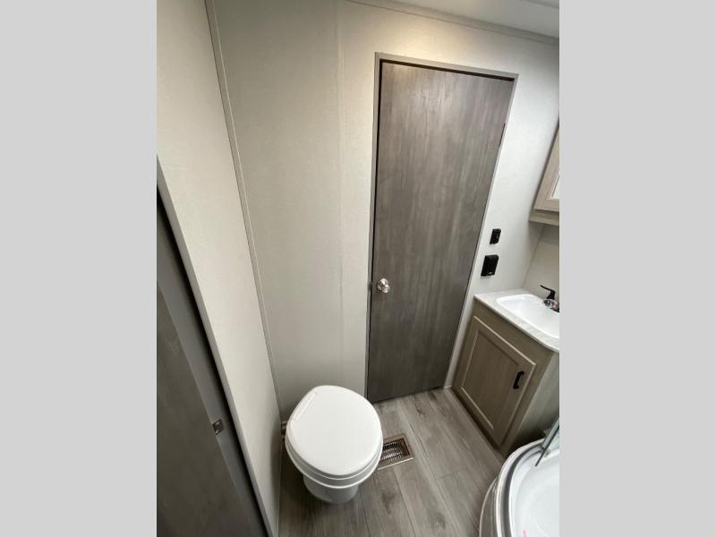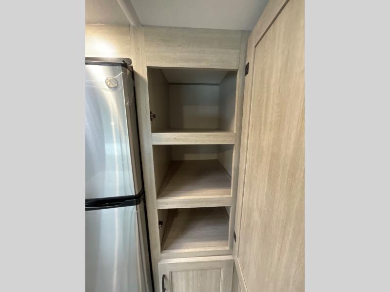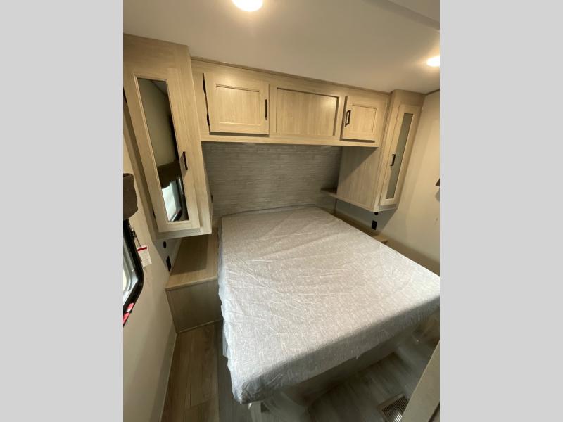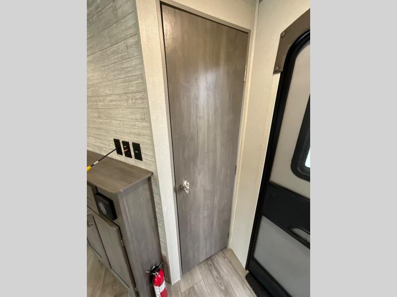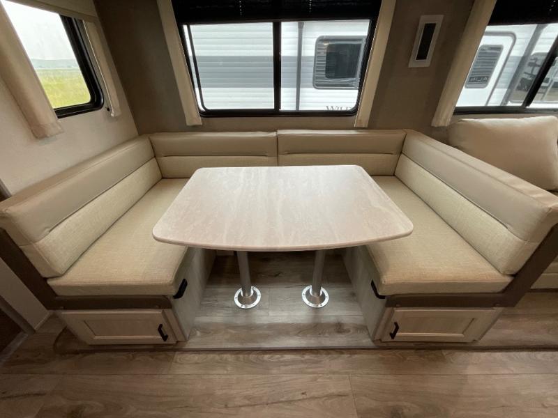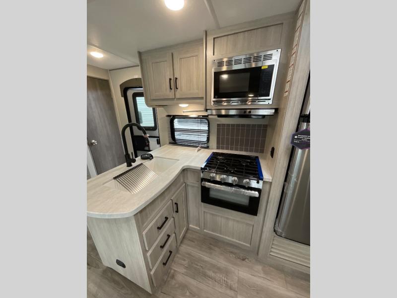 Not only will you be comfortable in this trailer, your friends will have comfort and privacy thanks to having their own bunkhouse with queen-size bunk beds, underbed storage, and a linen closet for clean clothes! The front master bedroom includes a walk-around queen bed, dual wardrobes, plus quick access to the dual entry bath! The combined living and kitchen is spacious thanks to the slide out U-shaped dinette and sofa with drink holders. You can even add the fireplace option if you want that feature. The cook will have full amenities to whip up meals including overhead cabinets for dishes and snacks, plus an outdoor camper kitchen with a pull-out griddle, a cabinet, and a refrigerator!