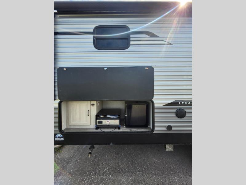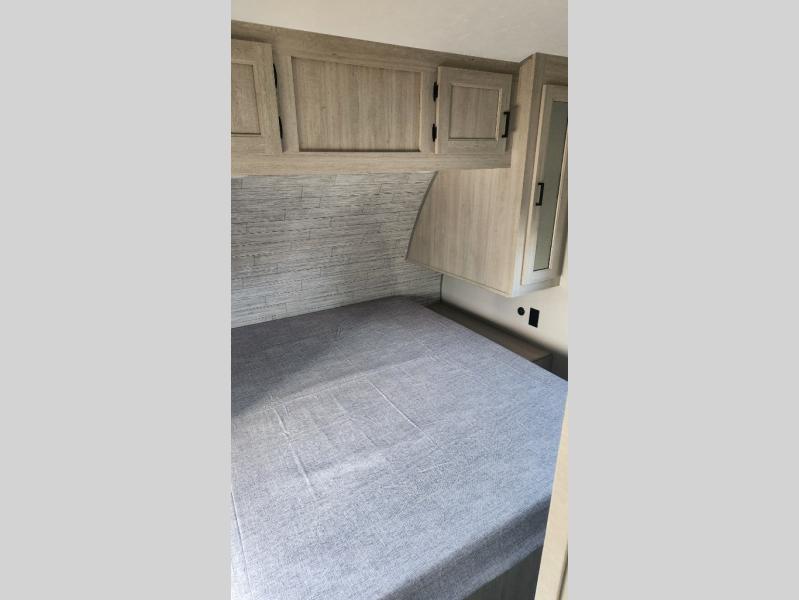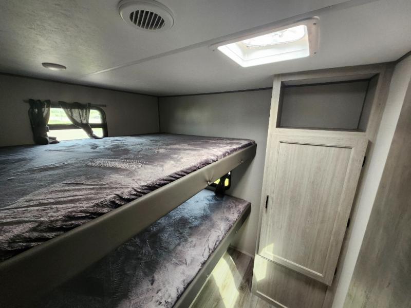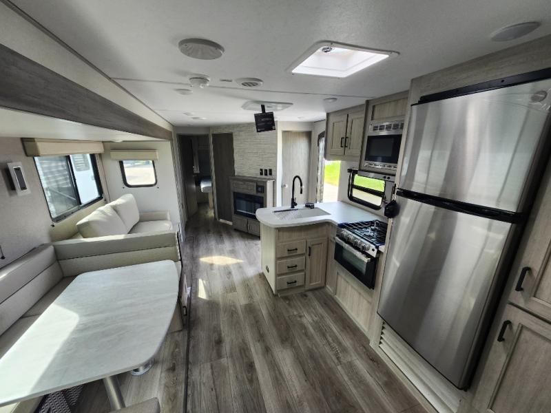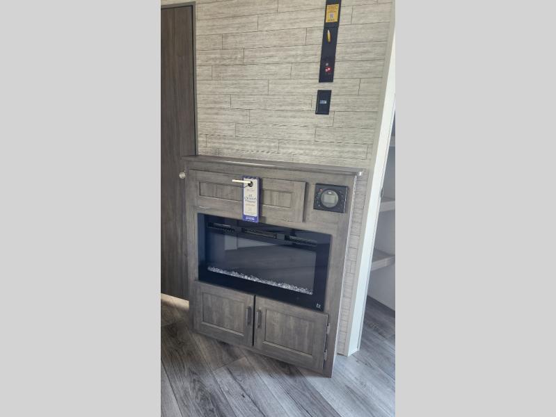 Not only will you be comfortable in this trailer, your friends will have comfort and privacy thanks to having their own bunkhouse with queen-size bunk beds, underbed storage, and a linen closet for clean clothes! The front master bedroom includes a walk-around queen bed, dual wardrobes, plus quick access to the dual entry bath! The combined living and kitchen is spacious thanks to the slide out U-shaped dinette and sofa with drink holders. You can even add the fireplace option if you want that feature. The cook will have full amenities to whip up meals including overhead cabinets for dishes and snacks, plus an outdoor camper kitchen with a pull-out griddle, a cabinet, and a refrigerator!