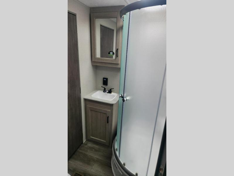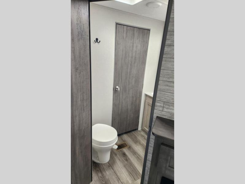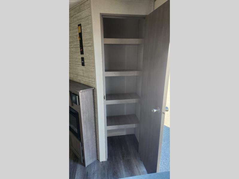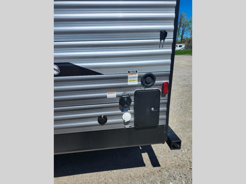 Not only will you be comfortable in this trailer, your friends will have comfort and privacy thanks to having their own bunkhouse with queen-size bunk beds, underbed storage, and a linen closet for clean clothes! The front master bedroom includes a walk-around queen bed, dual wardrobes, plus quick access to the dual entry bath! The combined living and kitchen is spacious thanks to the slide out U-shaped dinette and sofa with drink holders. You can even add the fireplace option if you want that feature. The cook will have full amenities to whip up meals including overhead cabinets for dishes and snacks, plus an outdoor camper kitchen with a pull-out griddle, a cabinet, and a refrigerator!