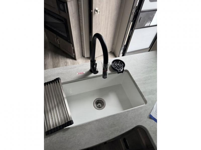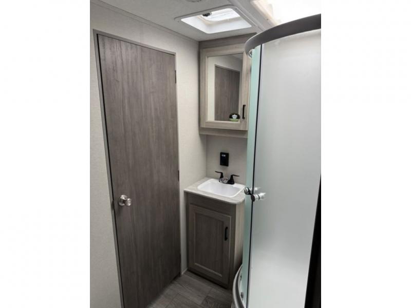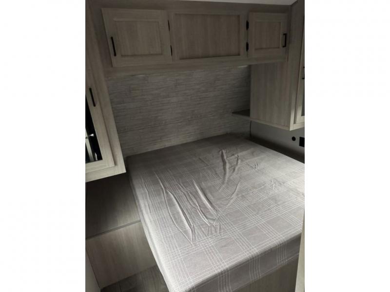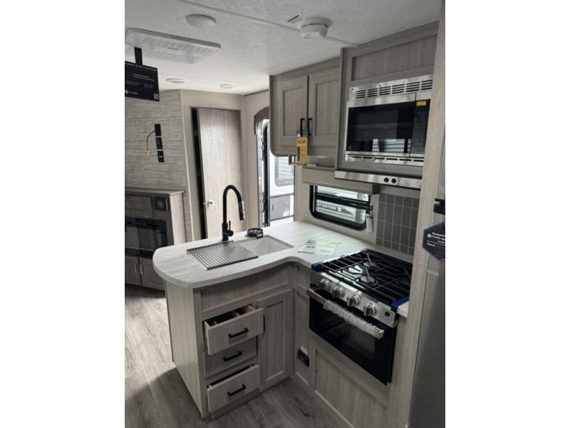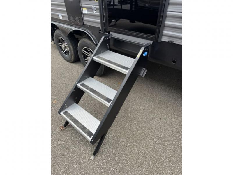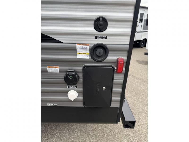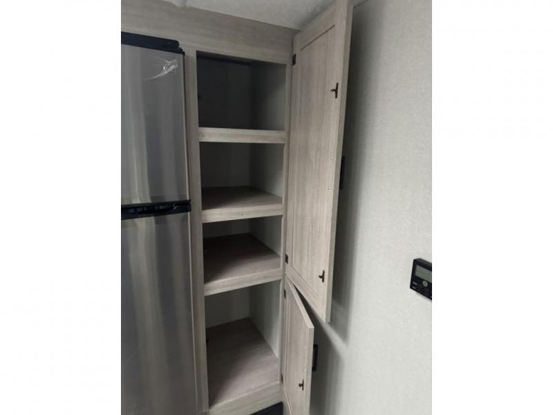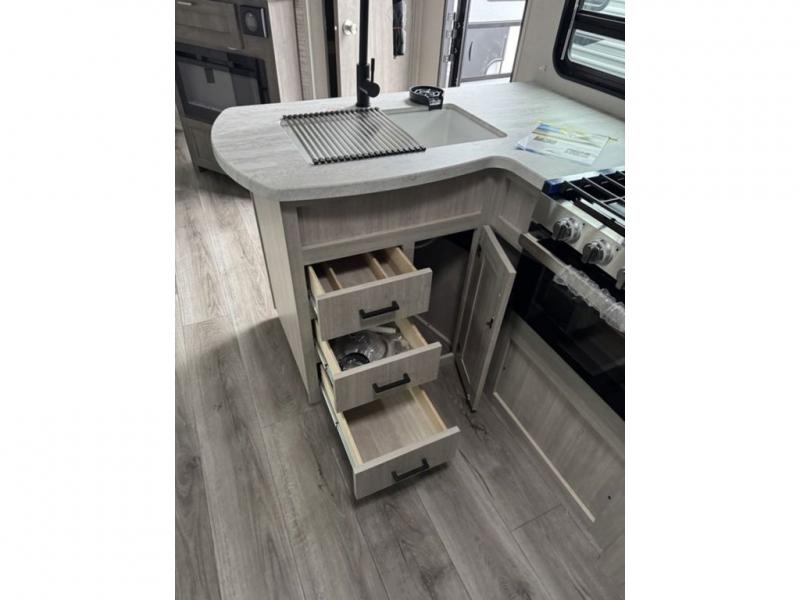 Not only will you be comfortable in this trailer, your friends will have comfort and privacy thanks to having their own bunkhouse with queen-size bunk beds, underbed storage, and a linen closet for clean clothes! The front master bedroom includes a walk-around queen bed, dual wardrobes, plus quick access to the dual entry bath! The combined living and kitchen is spacious thanks to the slide out U-shaped dinette and sofa with drink holders. You can even add the fireplace option if you want that feature. The cook will have full amenities to whip up meals including overhead cabinets for dishes and snacks, plus an outdoor camper kitchen with a pull-out griddle, a cabinet, and a refrigerator!