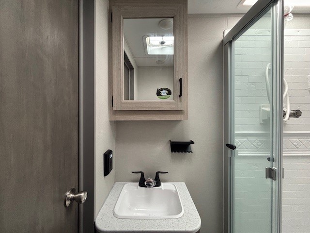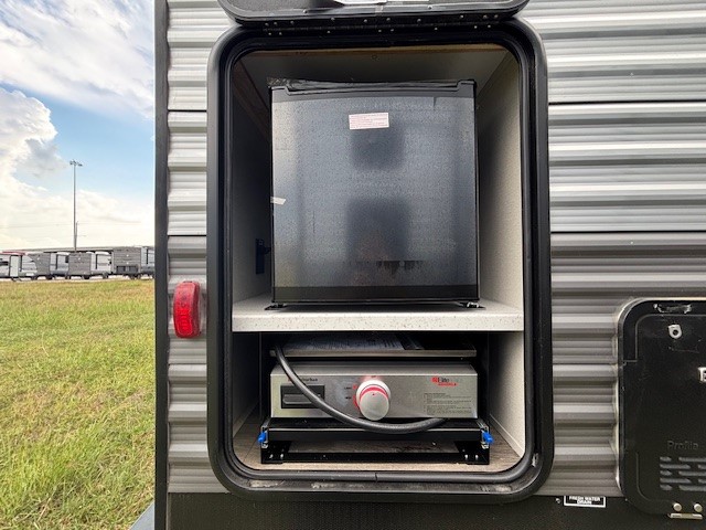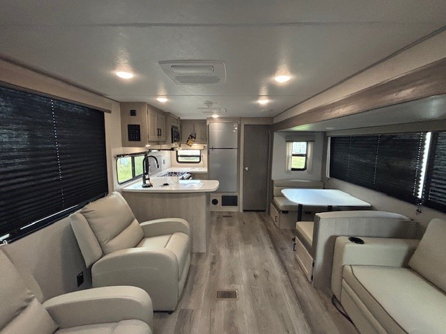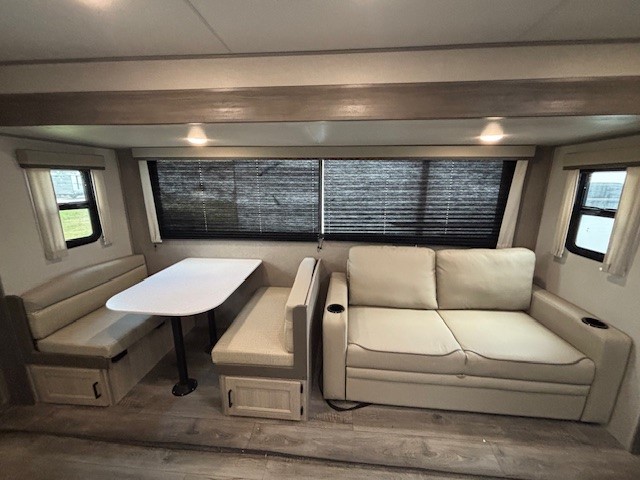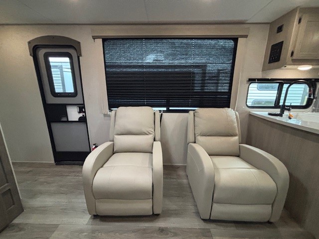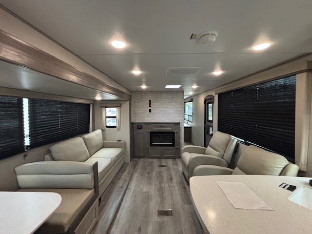 Enjoy relaxing under the 21' electric awning during the daytime for some protection from the sun, and at night with multicolor LED lights to set the mood for the evening. You can store beverages in the exterior mini fridge for convenience, and there is exterior storage for outdoor games and such. The interior is spacious with a large slide out booth dinette and sofa with drink holders, yet you might like to choose the free standing dinette option in place of the booth dinette. There is also a fireplace option under the entertainment center for a more cozy feel. The two recliner lounges are sure to be a favorite spot, and the cook will love the rear kitchen including the U-shaped counter when preparing meals and drying the dishes. The front bedroom features a queen bed slide, a large closet and a dresser, plus second closet with washer and dryer prep.