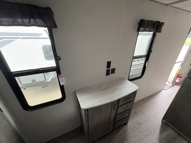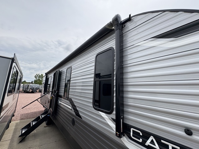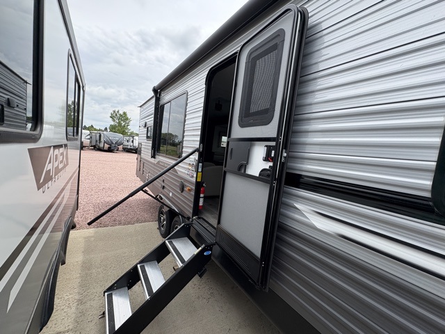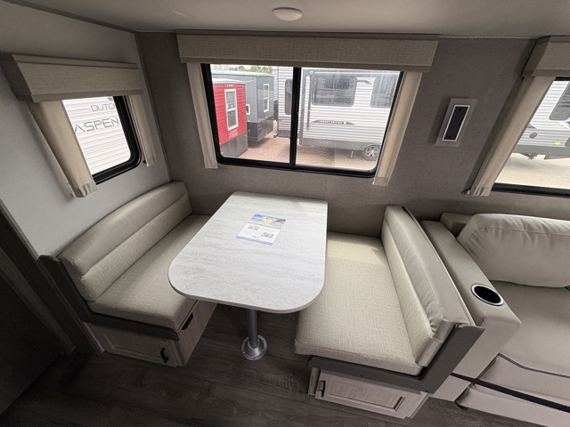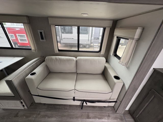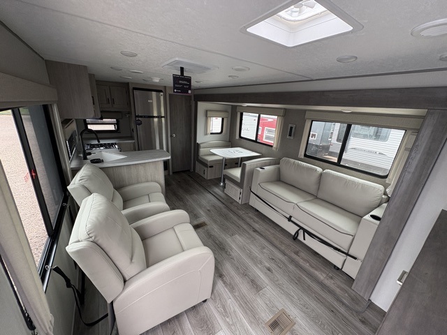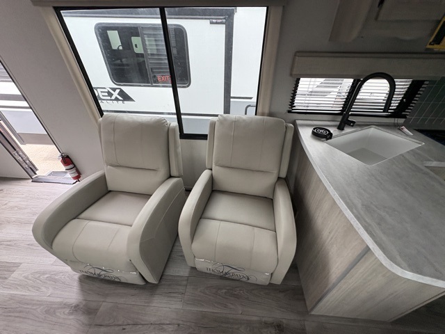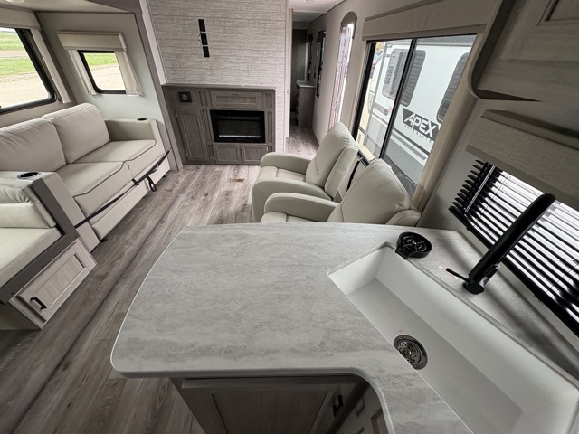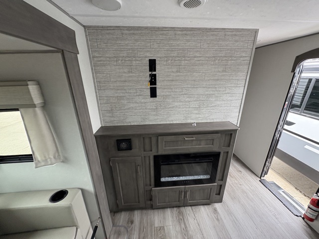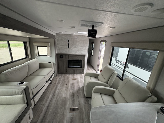 Enjoy relaxing under the 21' electric awning during the daytime for some protection from the sun, and at night with multicolor LED lights to set the mood for the evening. You can store beverages in the exterior mini fridge for convenience, and there is exterior storage for outdoor games and such. The interior is spacious with a large slide out booth dinette and sofa with drink holders, yet you might like to choose the free standing dinette option in place of the booth dinette. There is also a fireplace option under the entertainment center for a more cozy feel. The two recliner lounges are sure to be a favorite spot, and the cook will love the rear kitchen including the U-shaped counter when preparing meals and drying the dishes. The front bedroom features a queen bed slide, a large closet and a dresser, plus second closet with washer and dryer prep.
