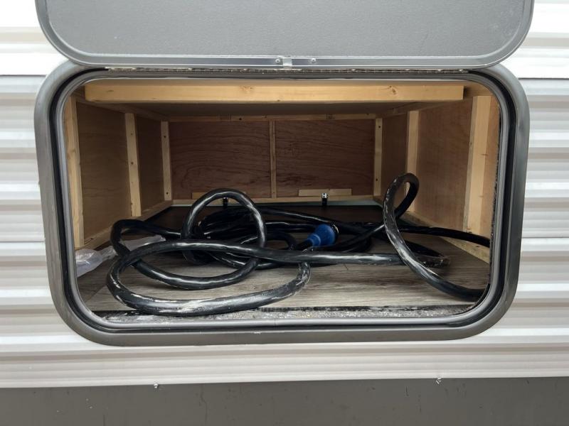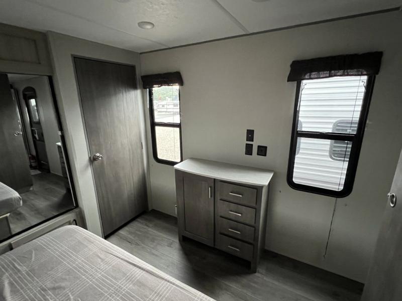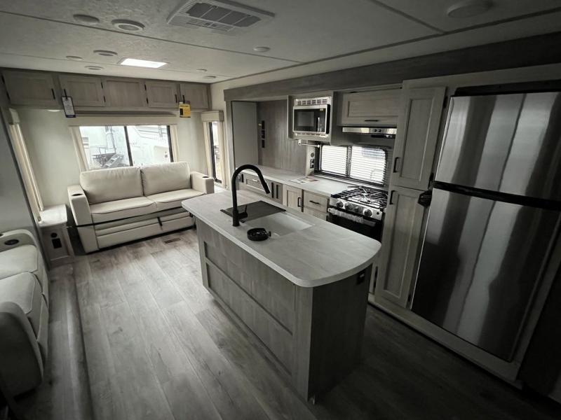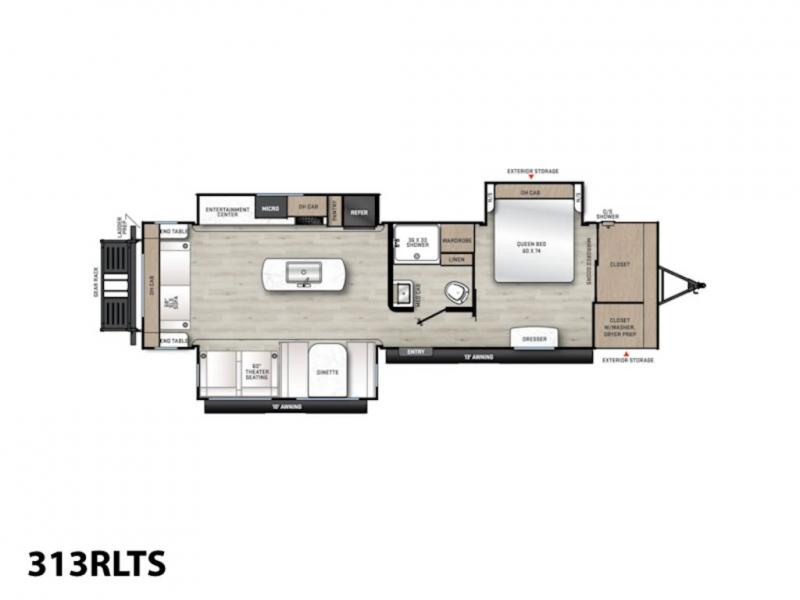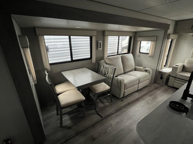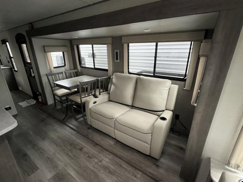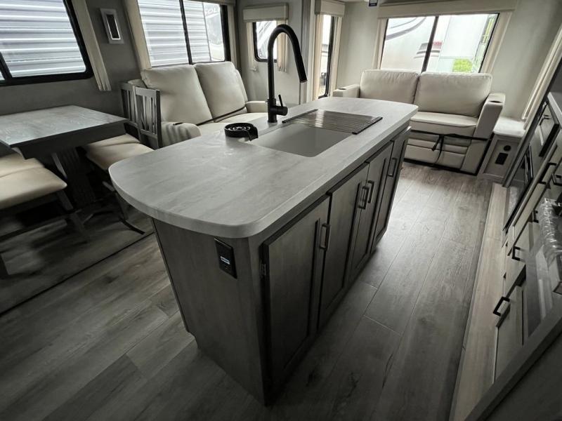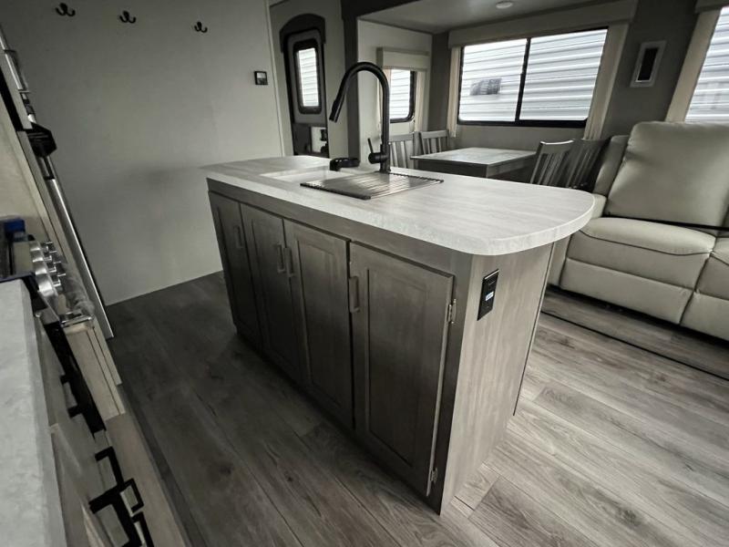 It's not hard to find comfort in this travel trailer with its triple slides, theater seating, and spacious full bath. Once your crew is settled and unpacked, head outdoors to relax under the two power awnings with multicolored LED lights, or grab the fishing poles from the exterior storage and head to the water. If you'd rather spend your day inside you'll find all the comforts of home; theater seating, a sofa and booth dinette, plus a fully equipped kitchen, complete with a kitchen island! You will love having your own space in the front bedroom that includes a queen bed slide out, a dresser, plus two closets. There is even washer and dryer prep if you plan to go full-time!