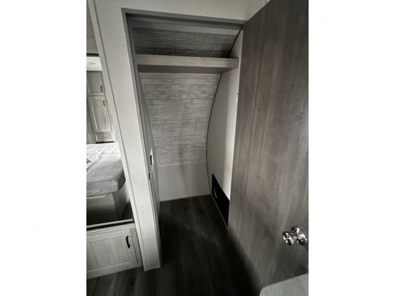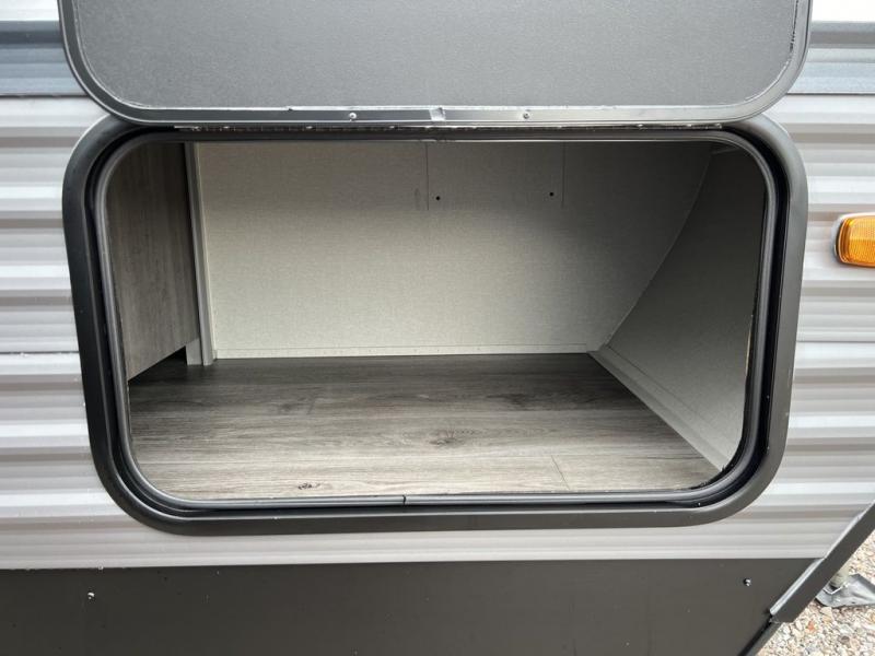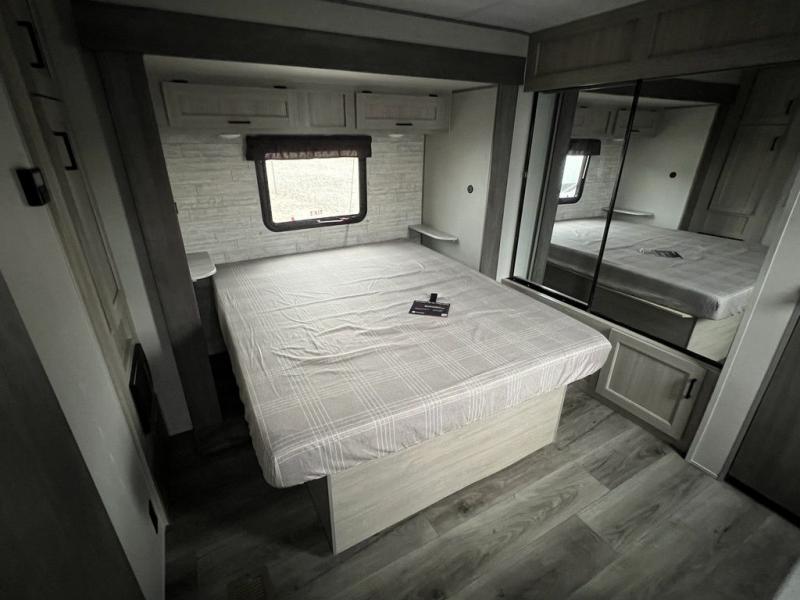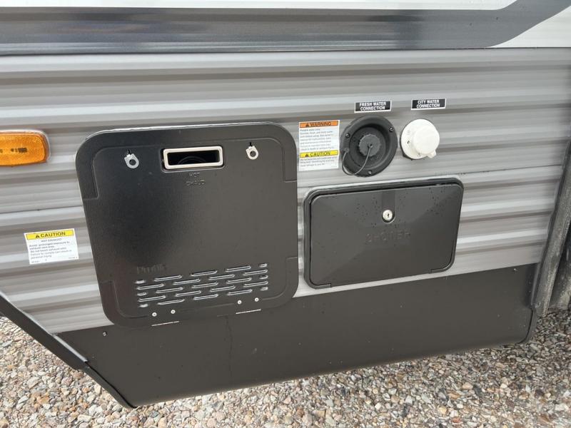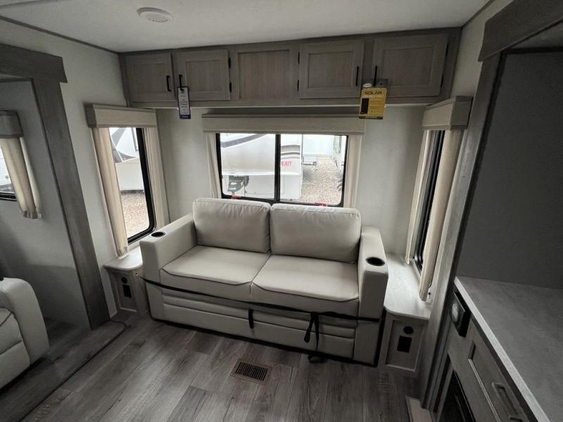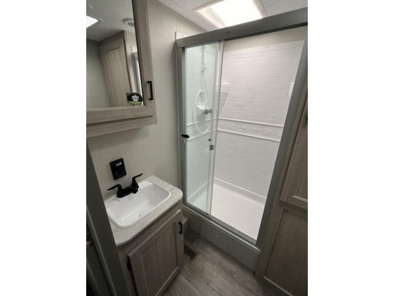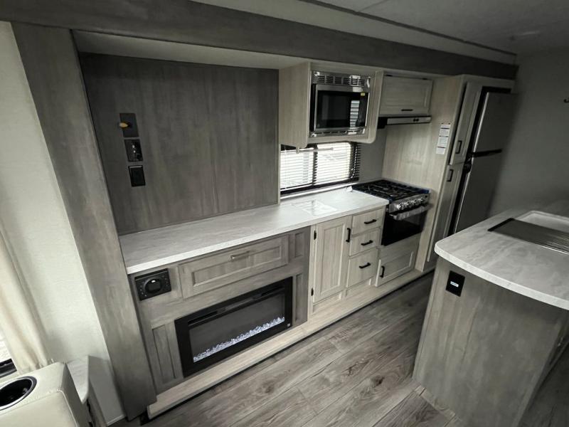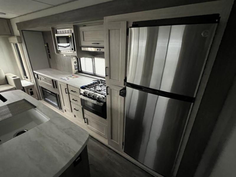It's not hard to find comfort in this travel trailer with its triple slides, theater seating, and spacious full bath. Once your crew is settled and unpacked, head outdoors to relax under the two power awnings with multicolored LED lights, or grab the fishing poles from the exterior storage and head to the water. If you'd rather spend your day inside you'll find all the comforts of home; theater seating, a sofa and booth dinette, plus a fully equipped kitchen, complete with a kitchen island! You will love having your own space in the front bedroom that includes a queen bed slide out, a dresser, plus two closets. There is even washer and dryer prep if you plan to go full-time!