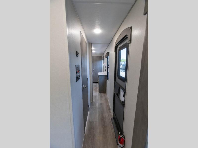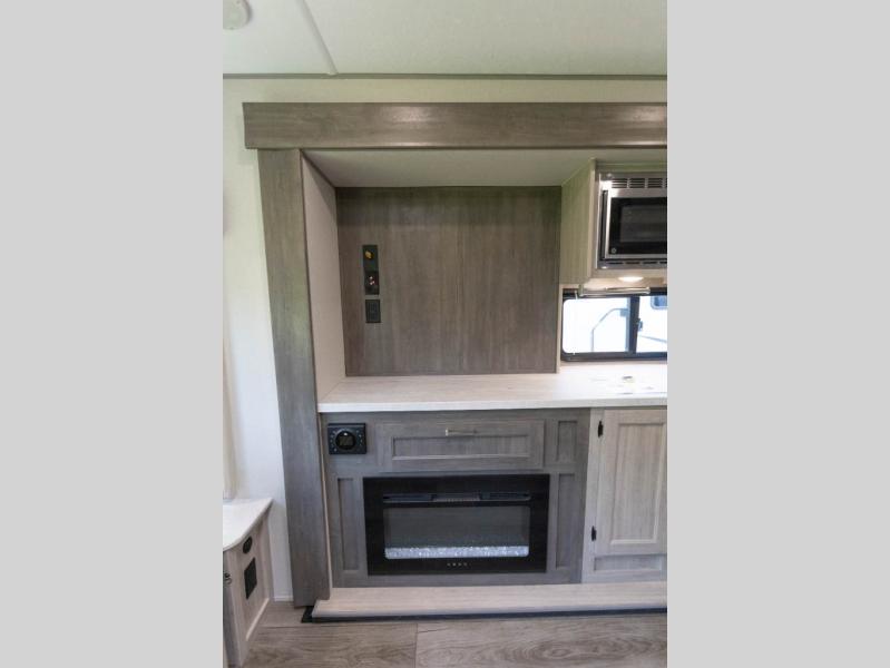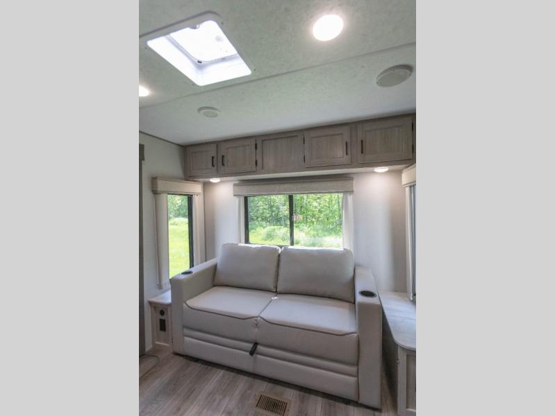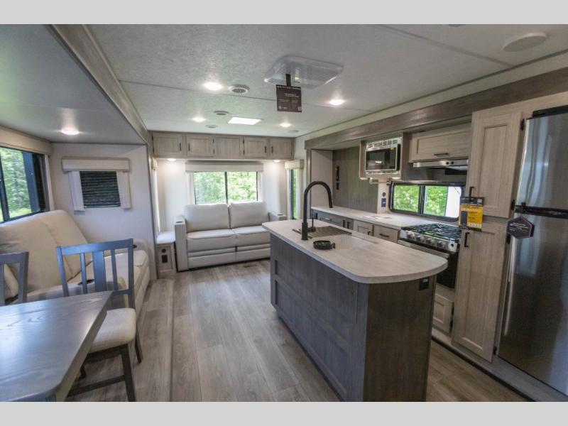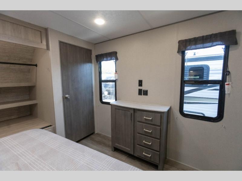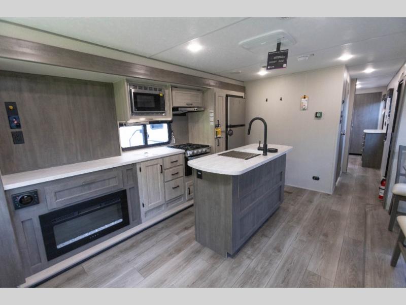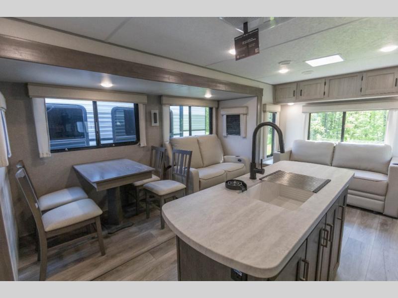 It's not hard to find comfort in this travel trailer with its triple slides, theater seating, and spacious full bath. Once your crew is settled and unpacked, head outdoors to relax under the two power awnings with multicolored LED lights, or grab the fishing poles from the exterior storage and head to the water. If you'd rather spend your day inside you'll find all the comforts of home; theater seating, a sofa and booth dinette, plus a fully equipped kitchen, complete with a kitchen island! You will love having your own space in the front bedroom that includes a queen bed slide out, a dresser, plus two closets. There is even washer and dryer prep if you plan to go full-time!