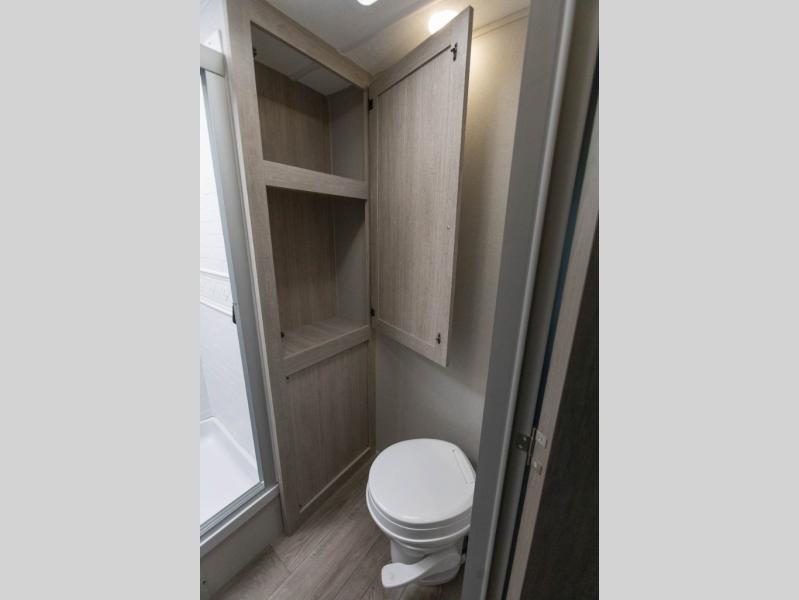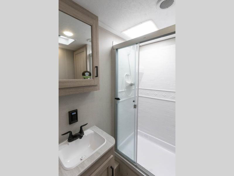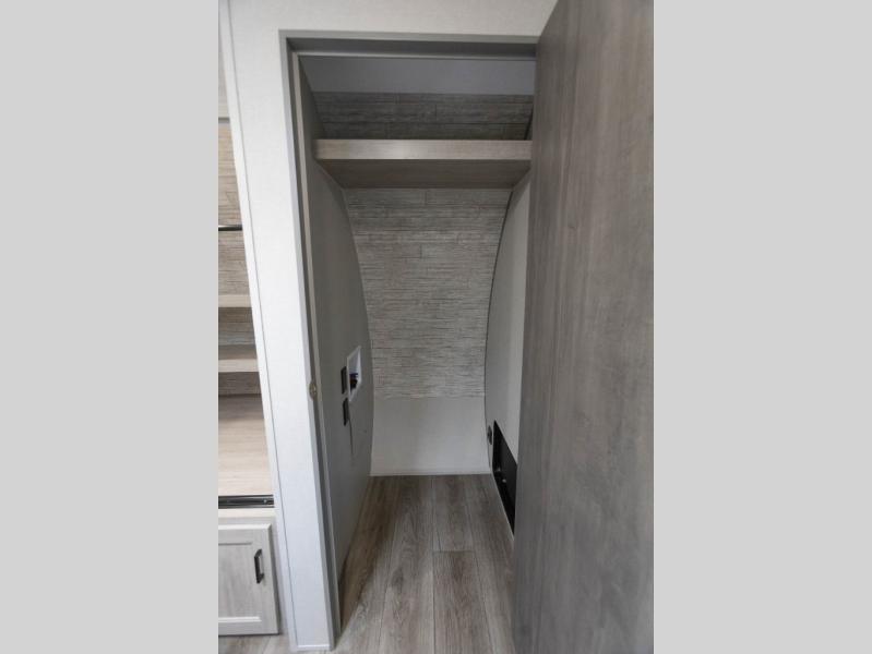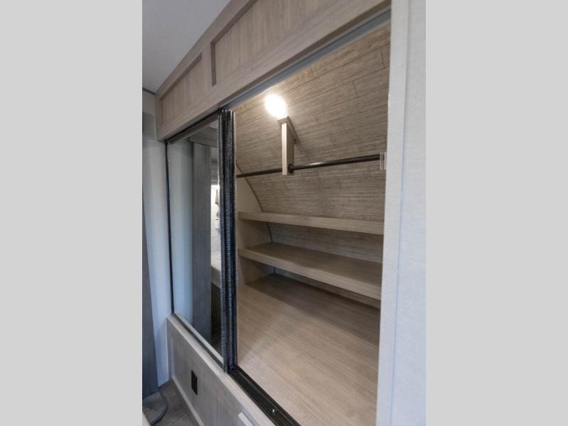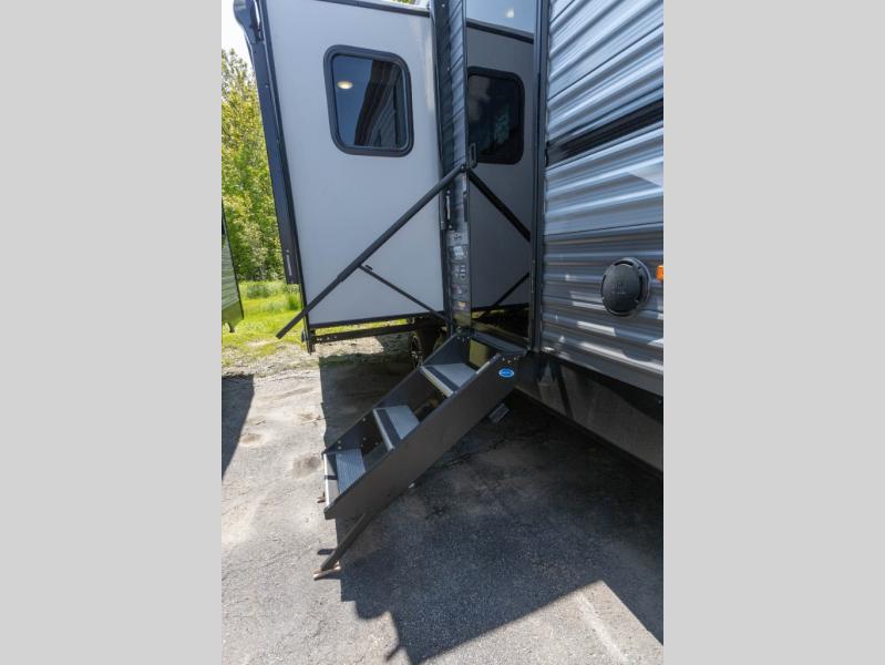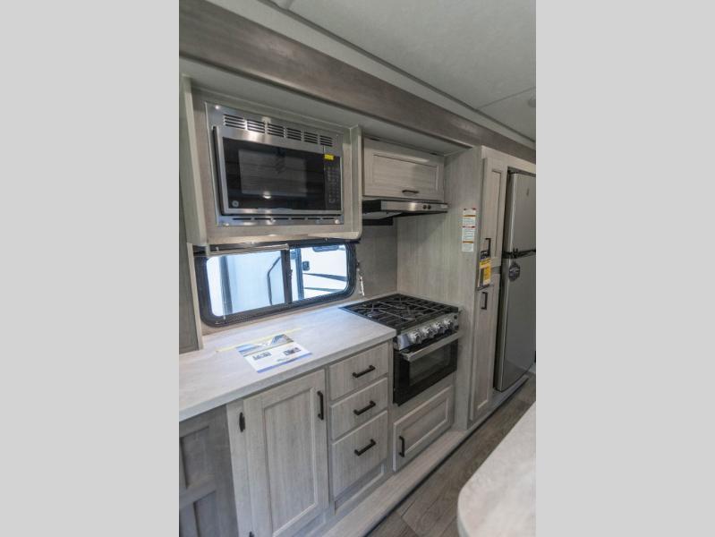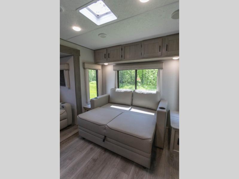 It's not hard to find comfort in this travel trailer with its triple slides, theater seating, and spacious full bath. Once your crew is settled and unpacked, head outdoors to relax under the two power awnings with multicolored LED lights, or grab the fishing poles from the exterior storage and head to the water. If you'd rather spend your day inside you'll find all the comforts of home; theater seating, a sofa and booth dinette, plus a fully equipped kitchen, complete with a kitchen island! You will love having your own space in the front bedroom that includes a queen bed slide out, a dresser, plus two closets. There is even washer and dryer prep if you plan to go full-time!