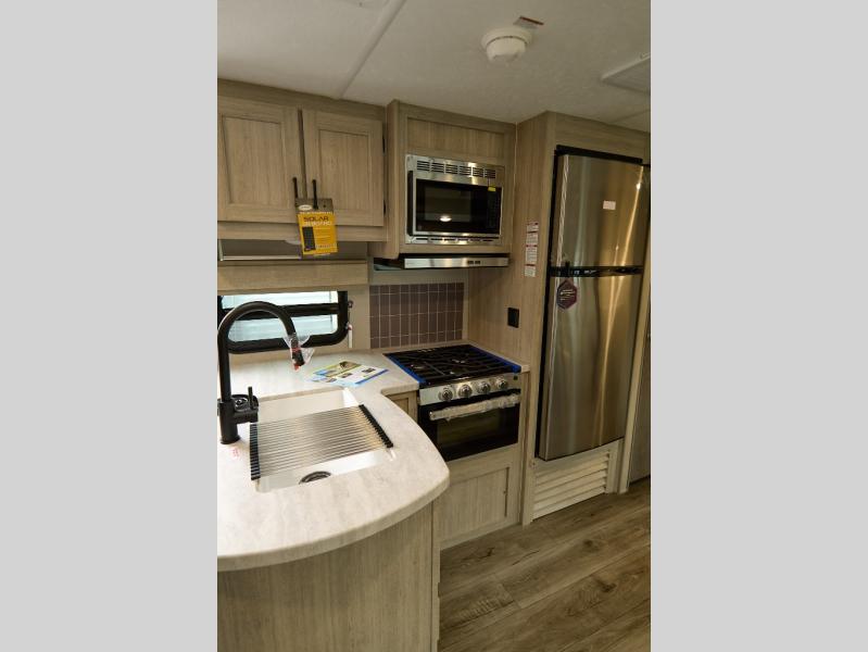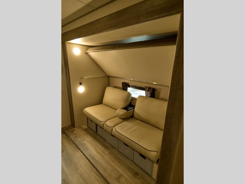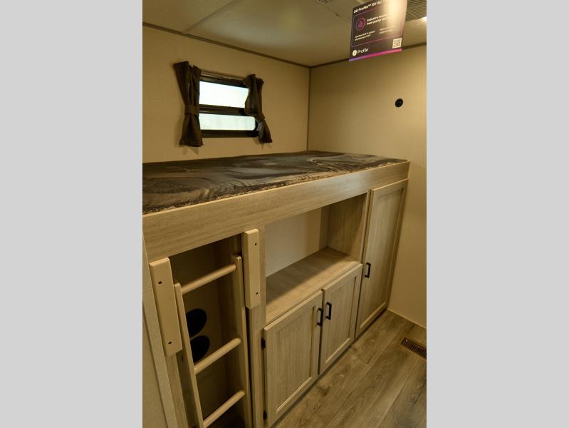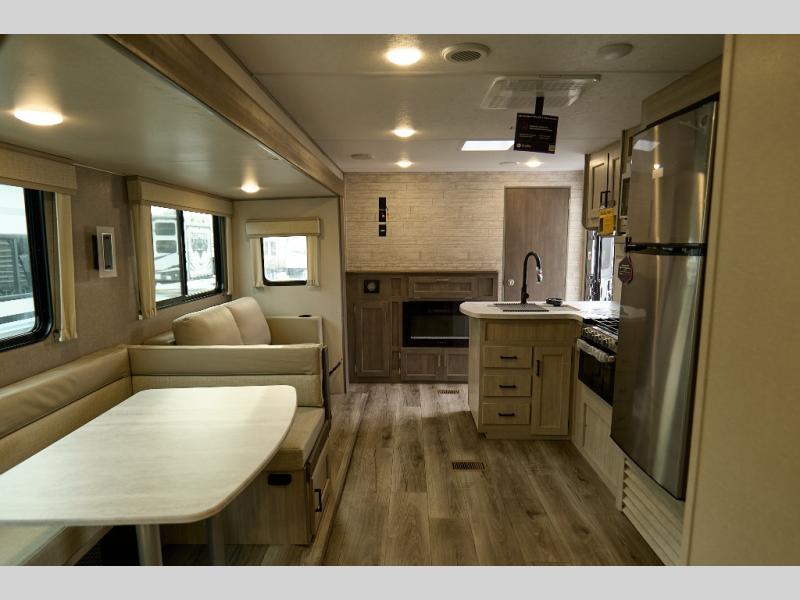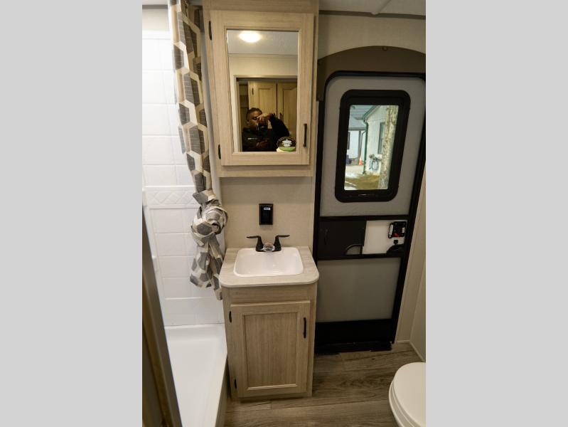 If you enjoy hiking, biking, and fishing, and waking up to beautiful scenery from your own comforts, then start camping with this trailer at the campsite! You will be able to sleep like a queen on the walk-around bed with dual wardrobes and overhead storage for more items in the front private bedroom while your family or friends have their own privacy in the bunkhouse complete with two bunks, a jack knife sofa with storage totes below and a TV/wardrobe cabinet for even more storage. The full bathroom includes the second entry/exit door for convenience when outside under the 21' electric awning with multicolor LED lights, or while cooking using the full size camper kitchen along the exterior. There are full kitchen amenities inside including a 10 cu. ft. refrigerator and a pantry.