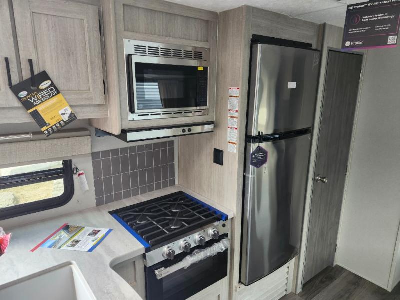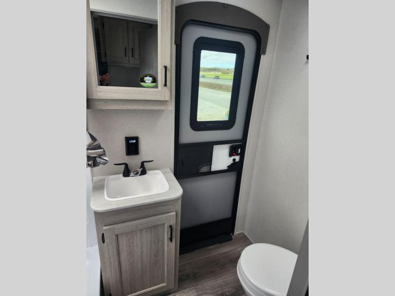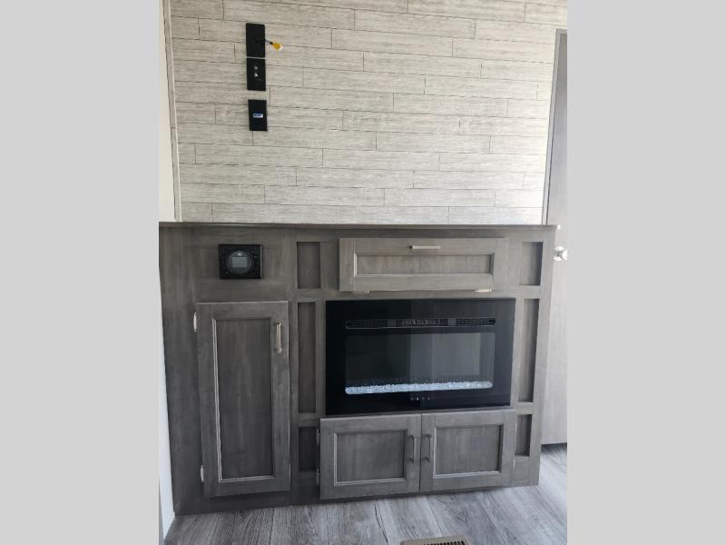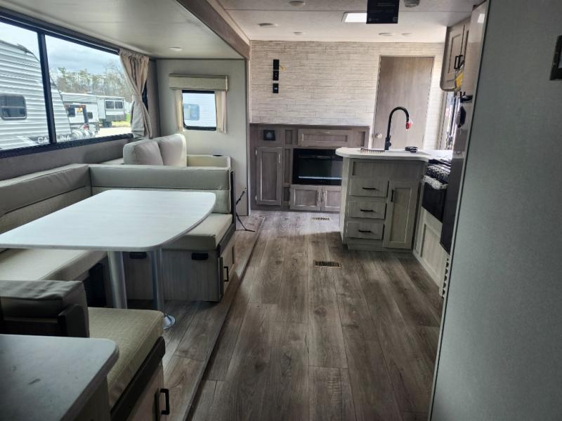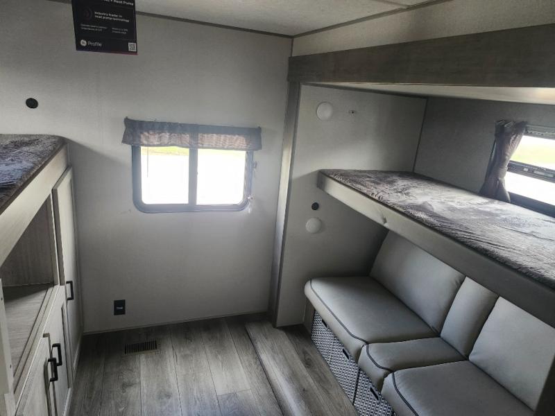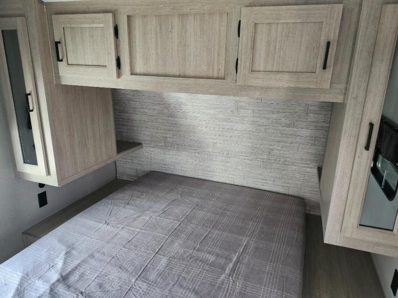 If you enjoy hiking, biking, and fishing, and waking up to beautiful scenery from your own comforts, then start camping with this trailer at the campsite! You will be able to sleep like a queen on the walk-around bed with dual wardrobes and overhead storage for more items in the front private bedroom while your family or friends have their own privacy in the bunkhouse complete with two bunks, a jack knife sofa with storage totes below and a TV/wardrobe cabinet for even more storage. The full bathroom includes the second entry/exit door for convenience when outside under the 21' electric awning with multicolor LED lights, or while cooking using the full size camper kitchen along the exterior. There are full kitchen amenities inside including a 10 cu. ft. refrigerator and a pantry.