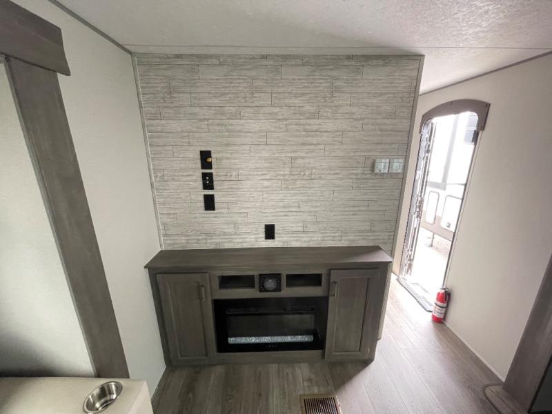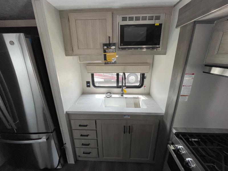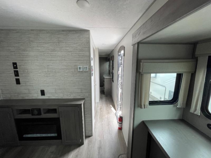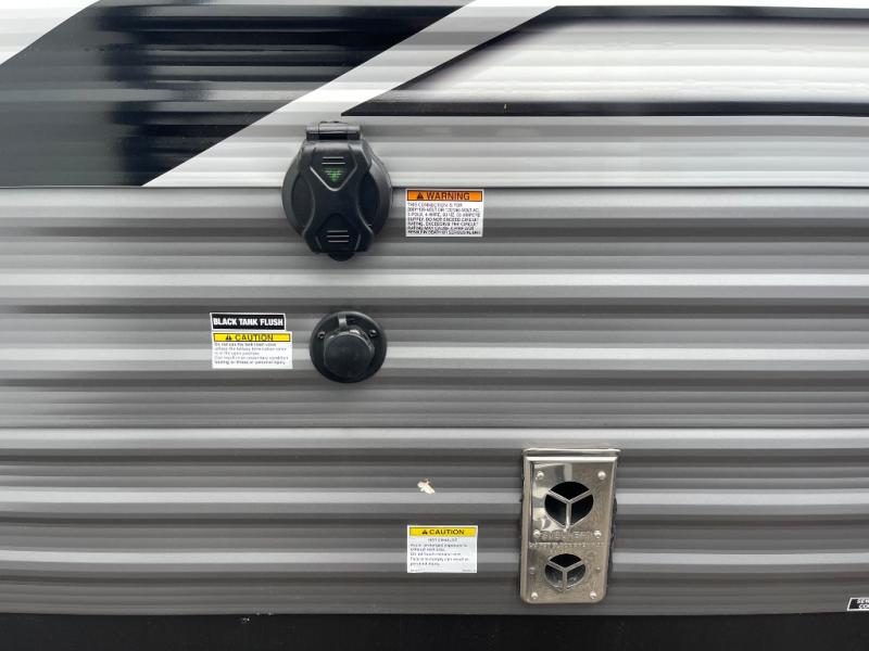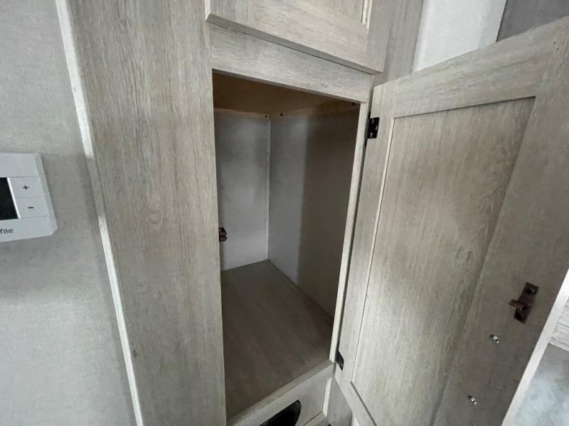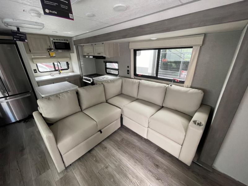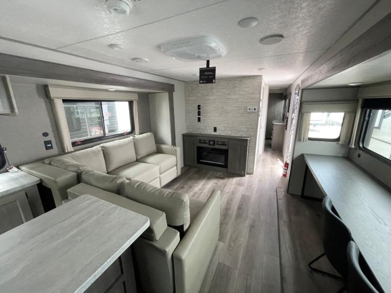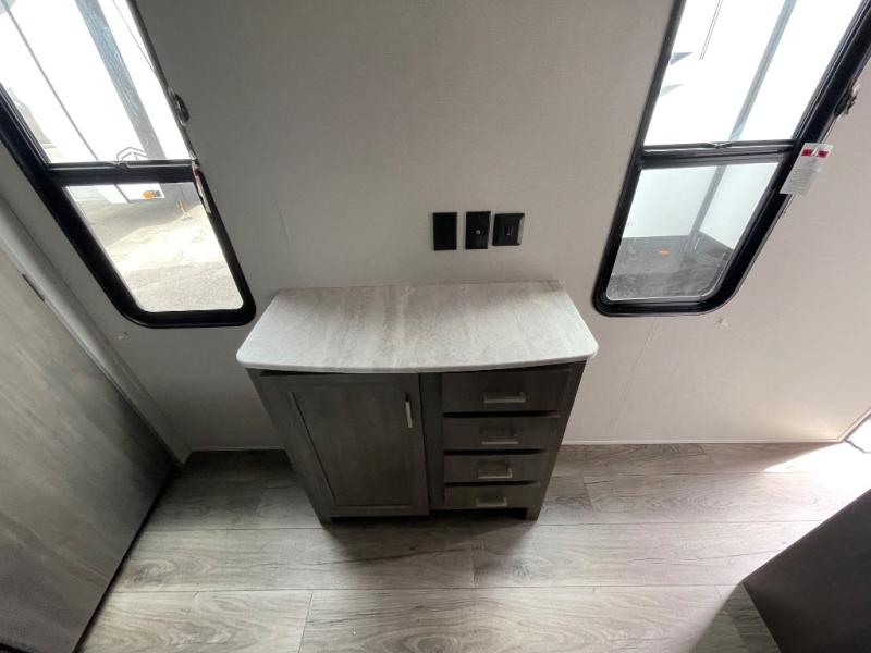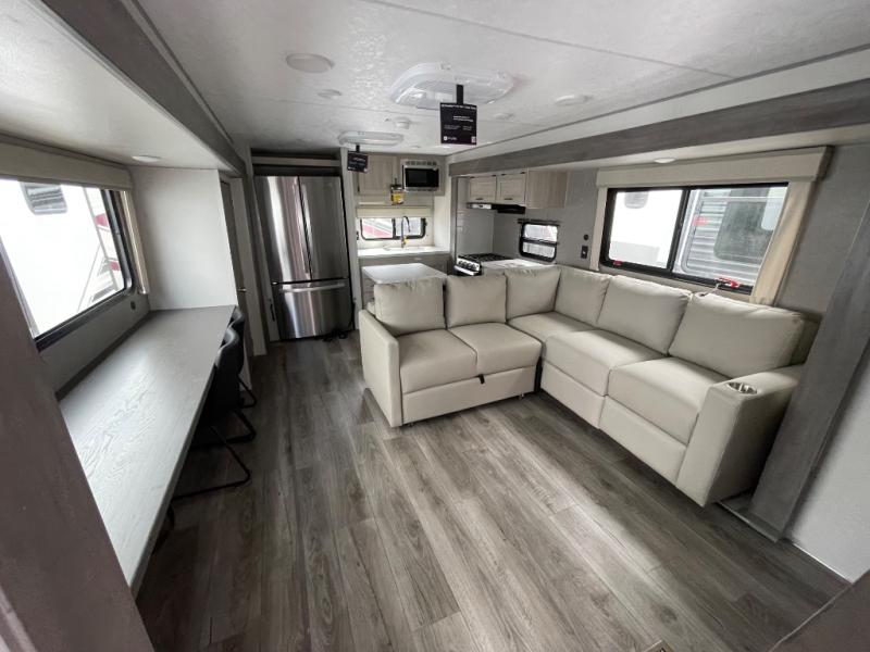 This travel trailer rear kitchen will make you feel like home is on the road, featuring a spacious pantry, residential refrigerator, overhead cabinets, microwave, kitchen island, and sliding desk/table for all your cooking and dining needs. The dining counter and chairs provide the perfect place to enjoy meals with family and friends. The living room boasts a comfortable sectional sofa and TV/entertainment center for relaxing and having fun with your favorite person, whether you're watching your favorite movie, playing games, or simply enjoying quality time with loved ones, this space has everything you need. Moreover, the full bathroom is super complete with a wardrobe, linen closet, and all the amenities you need to freshen up and feel at home. Plus, you and your partner will love this front bedroom, since it is private, featuring a comfortable queen bed, and dresser ideal for keeping your clothes organized, overhead cabinets, closet, and washer/dryer prep for all your laundry needs, making this space the perfect place to rest and recharge after a long day of adventure. Outside, you'll appreciate the two awnings (10' and 13') for shade and protection from the elements, as well as the exterior storage for all your gear and toys.