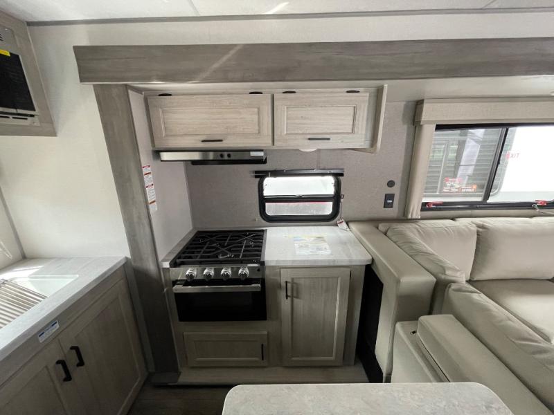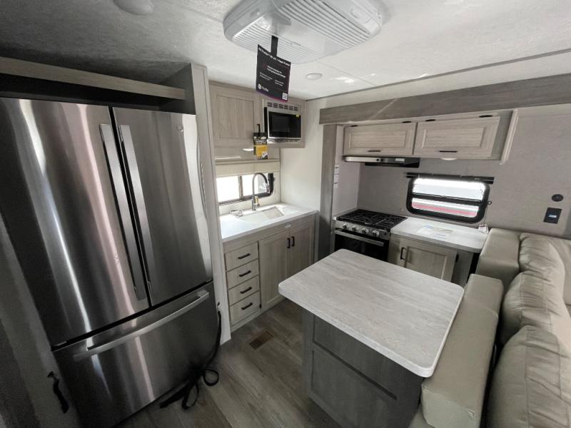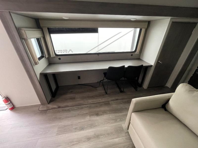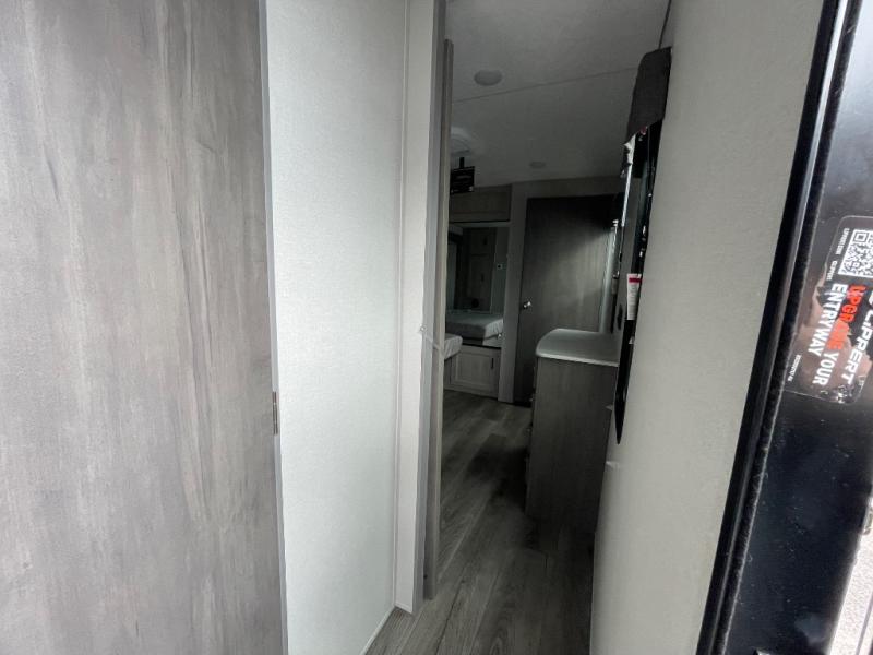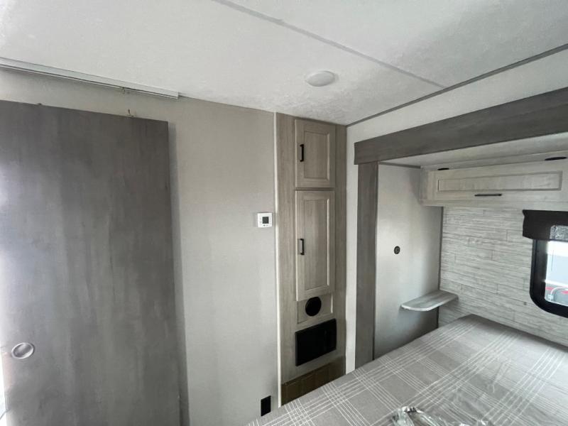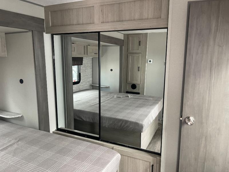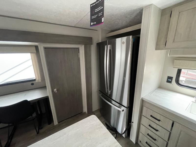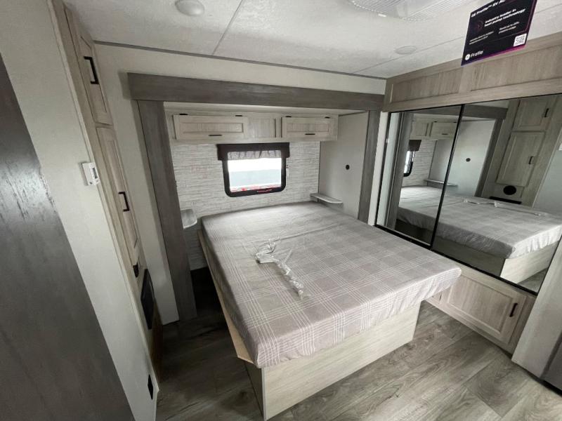 This travel trailer rear kitchen will make you feel like home is on the road, featuring a spacious pantry, residential refrigerator, overhead cabinets, microwave, kitchen island, and sliding desk/table for all your cooking and dining needs. The dining counter and chairs provide the perfect place to enjoy meals with family and friends. The living room boasts a comfortable sectional sofa and TV/entertainment center for relaxing and having fun with your favorite person, whether you're watching your favorite movie, playing games, or simply enjoying quality time with loved ones, this space has everything you need. Moreover, the full bathroom is super complete with a wardrobe, linen closet, and all the amenities you need to freshen up and feel at home. Plus, you and your partner will love this front bedroom, since it is private, featuring a comfortable queen bed, and dresser ideal for keeping your clothes organized, overhead cabinets, closet, and washer/dryer prep for all your laundry needs, making this space the perfect place to rest and recharge after a long day of adventure. Outside, you'll appreciate the two awnings (10' and 13') for shade and protection from the elements, as well as the exterior storage for all your gear and toys.
