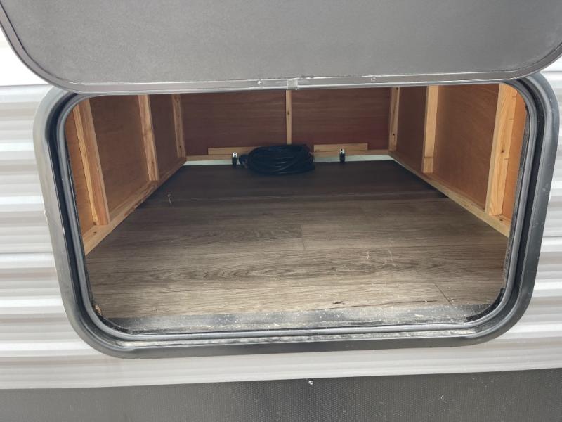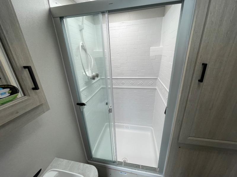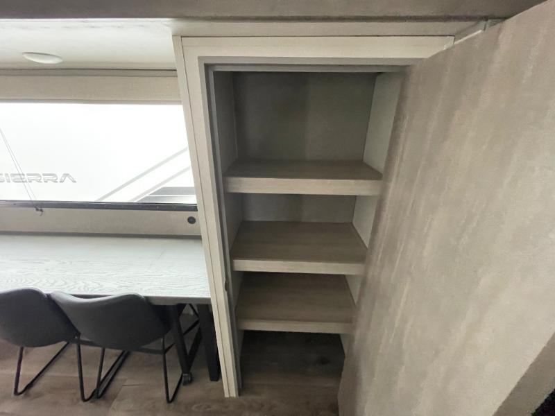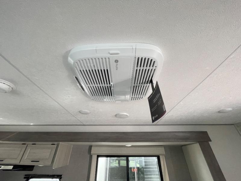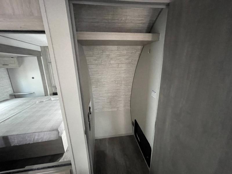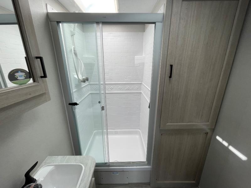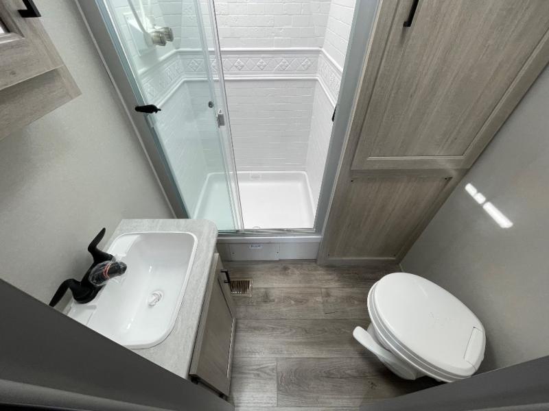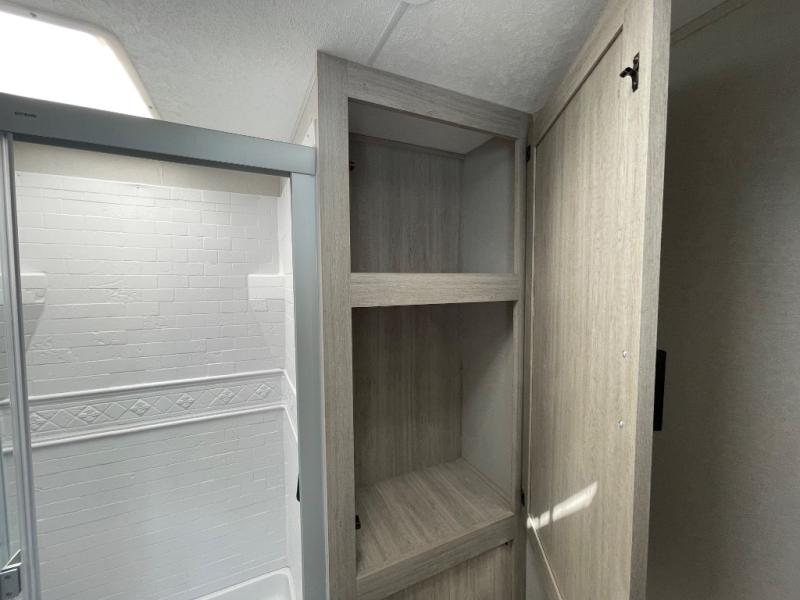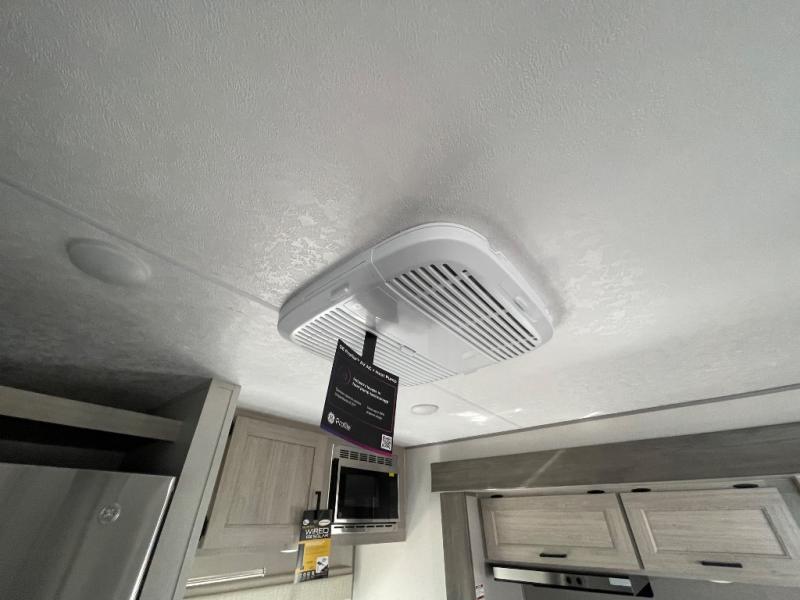 This travel trailer rear kitchen will make you feel like home is on the road, featuring a spacious pantry, residential refrigerator, overhead cabinets, microwave, kitchen island, and sliding desk/table for all your cooking and dining needs. The dining counter and chairs provide the perfect place to enjoy meals with family and friends. The living room boasts a comfortable sectional sofa and TV/entertainment center for relaxing and having fun with your favorite person, whether you're watching your favorite movie, playing games, or simply enjoying quality time with loved ones, this space has everything you need. Moreover, the full bathroom is super complete with a wardrobe, linen closet, and all the amenities you need to freshen up and feel at home. Plus, you and your partner will love this front bedroom, since it is private, featuring a comfortable queen bed, and dresser ideal for keeping your clothes organized, overhead cabinets, closet, and washer/dryer prep for all your laundry needs, making this space the perfect place to rest and recharge after a long day of adventure. Outside, you'll appreciate the two awnings (10' and 13') for shade and protection from the elements, as well as the exterior storage for all your gear and toys.