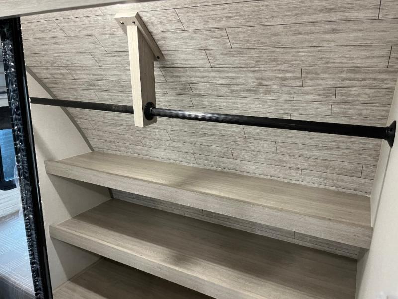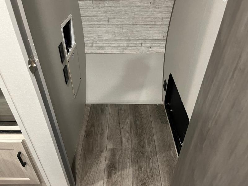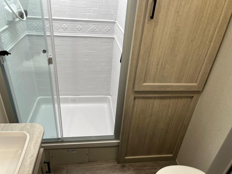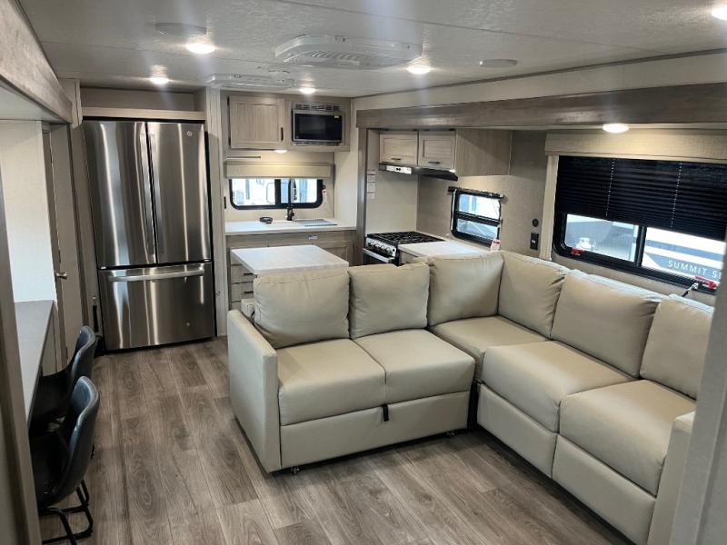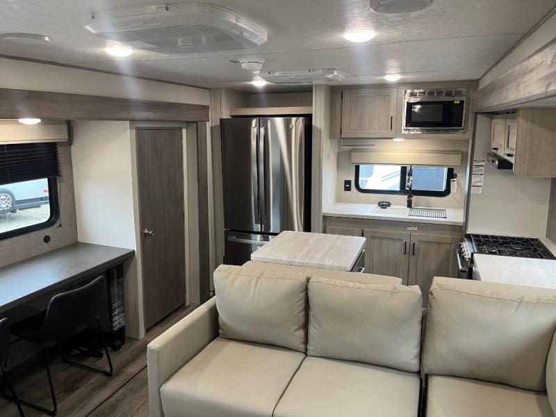 This travel trailer rear kitchen will make you feel like home is on the road, featuring a spacious pantry, residential refrigerator, overhead cabinets, microwave, kitchen island, and sliding desk/table for all your cooking and dining needs. The dining counter and chairs provide the perfect place to enjoy meals with family and friends. The living room boasts a comfortable sectional sofa and TV/entertainment center for relaxing and having fun with your favorite person, whether you're watching your favorite movie, playing games, or simply enjoying quality time with loved ones, this space has everything you need. Moreover, the full bathroom is super complete with a wardrobe, linen closet, and all the amenities you need to freshen up and feel at home. Plus, you and your partner will love this front bedroom, since it is private, featuring a comfortable queen bed, and dresser ideal for keeping your clothes organized, overhead cabinets, closet, and washer/dryer prep for all your laundry needs, making this space the perfect place to rest and recharge after a long day of adventure. Outside, you'll appreciate the two awnings (10' and 13') for shade and protection from the elements, as well as the exterior storage for all your gear and toys.