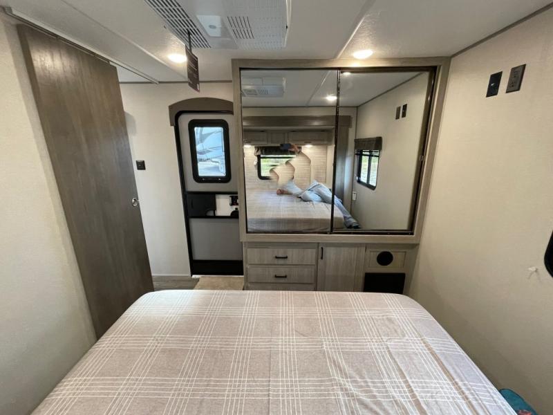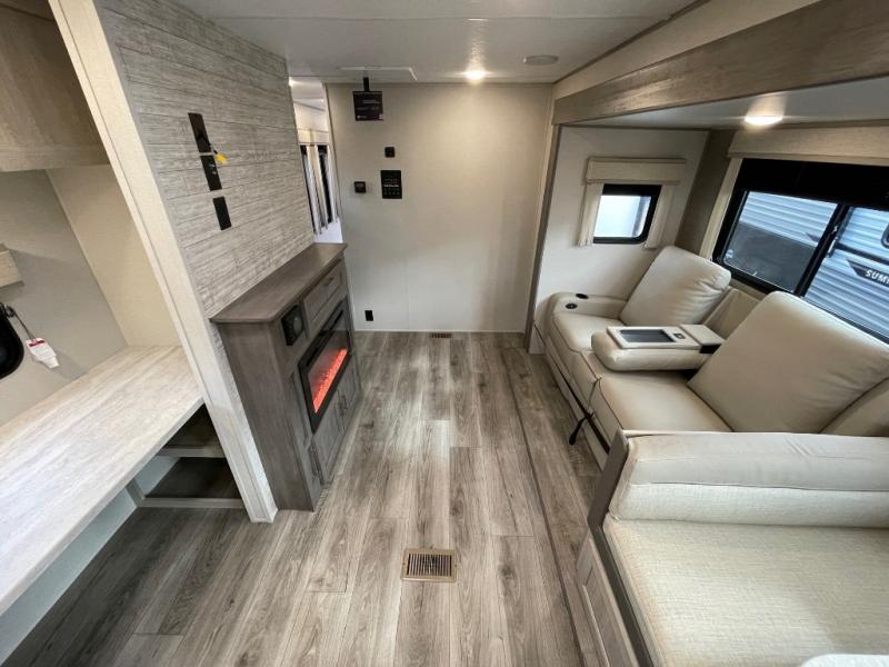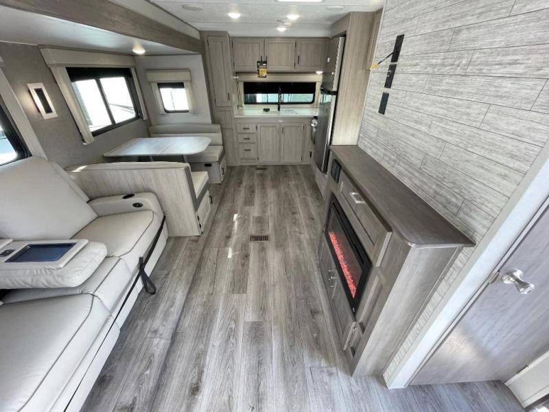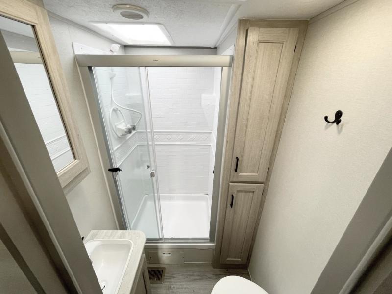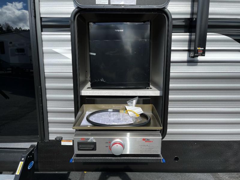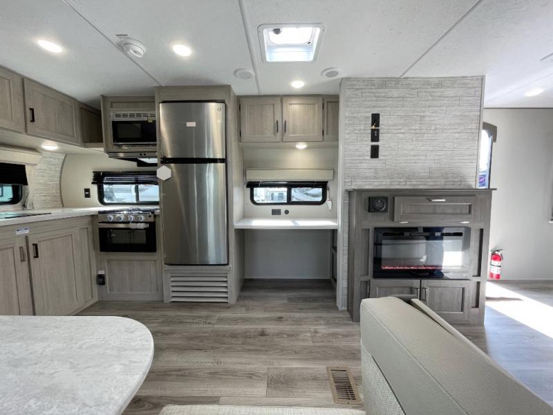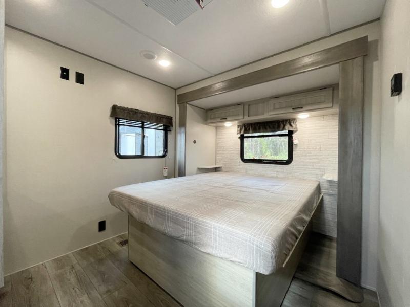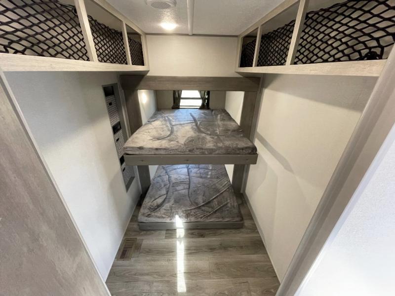 Your whole crew will love camping in this triple slide out travel trailer! The front kitchen includes generous counter space, two pantries, with one being a walk-in, plus a work station if you need to telecommute. The large slide out includes a sofa and booth dinette where you can relax, eat, and even sleep guests who aren't staying in the mid-bunk room. Here, you'll find slide out double-size bunks, convenient bunk storage, and overhead shelves to keep this space neat and clean. A full bath with a 36" x 30" shower will let you clean up each day, and the rear private bedroom will have you feeling right at home. There is an RV queen bed slide out here, along with dual nightstands, and a spacious wardrobe with mirrored doors for a more residential look. And don't overlook the exterior with its ample storage space, 21' awning, plus a camper kitchen with a mini refrigerator and griddle!