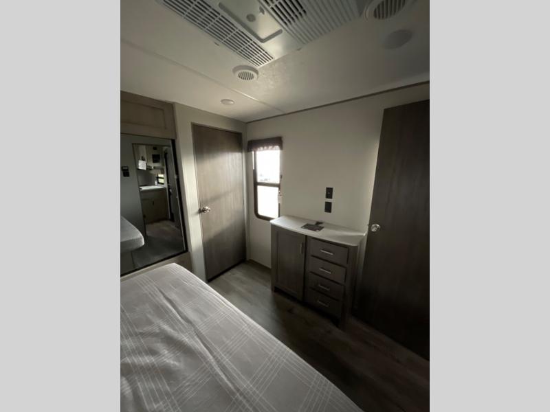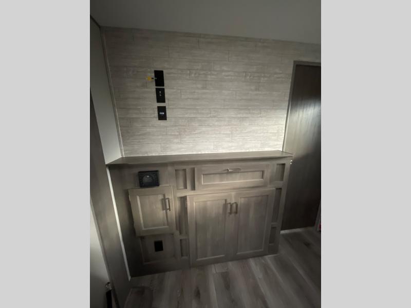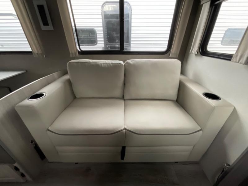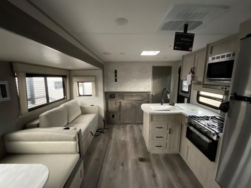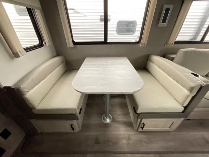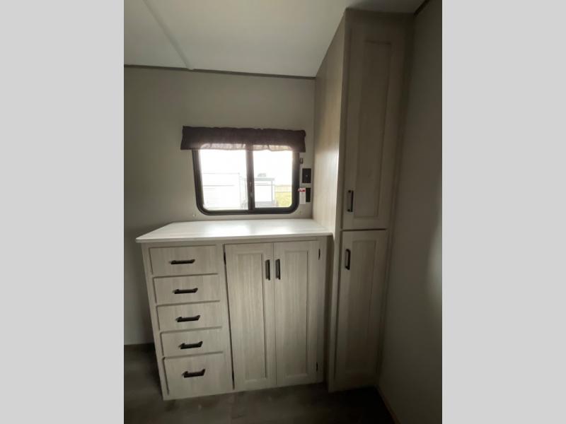 This unique travel trailer offers two bedrooms complete with a slide out queen beds with nightstands, and clothing storage. You can choose from the front bedroom with a large closet and a second closet prepped for a washer and dryer, or the rear bedroom with a wardrobe and TV cabinet. With three total slides throughout there is space for everyone! You and your family will love the combined living and kitchen area with a slide out booth dinette and sofa with drink holders, and maybe you'll decide to add the fireplace option. The L-shaped kitchen counter allows the cook to make meals without moving for anyone trying to get to the full bathroom or either bedroom. And when you want to relax outdoors, the 21' power awning with multicolor LED lights allows you to choose the color you like best.
