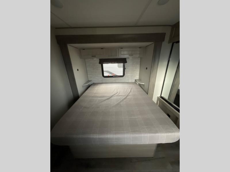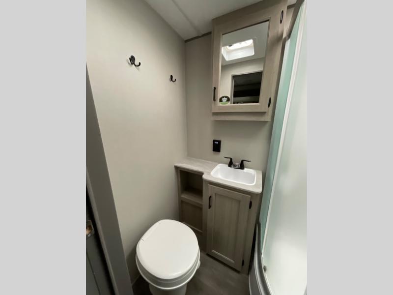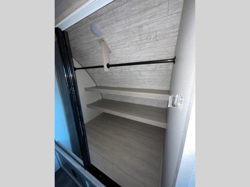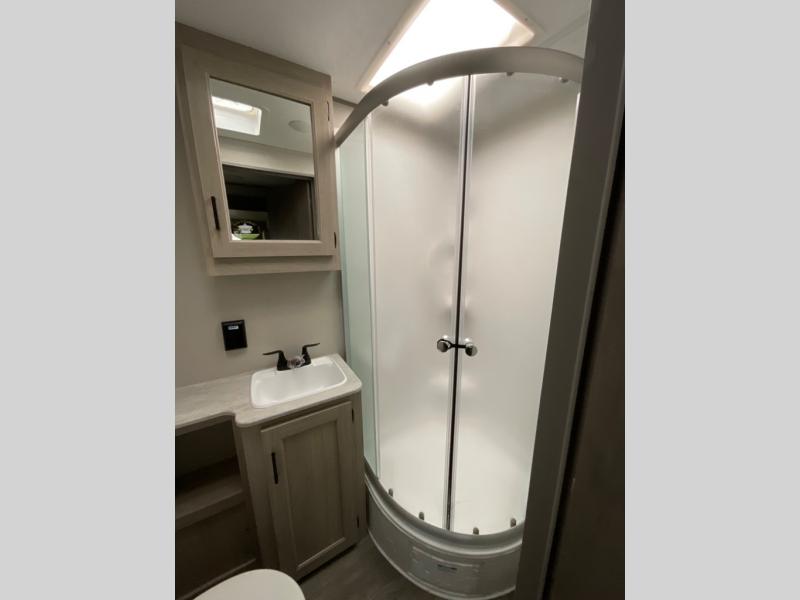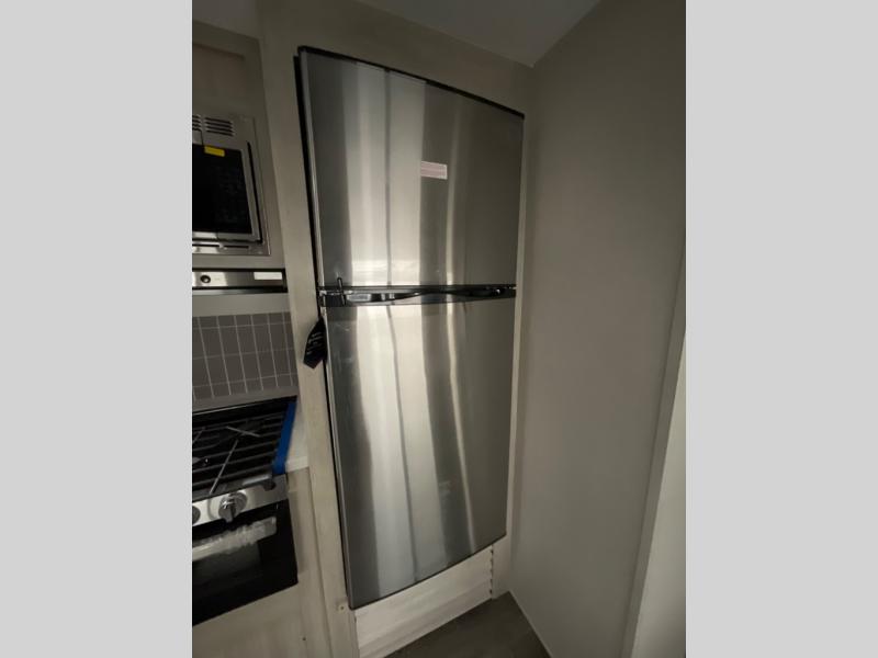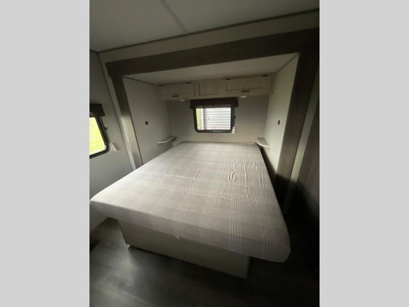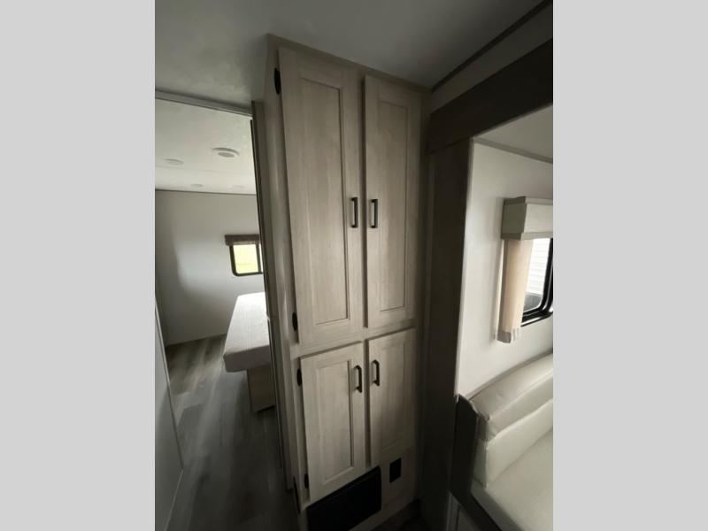 This unique travel trailer offers two bedrooms complete with a slide out queen beds with nightstands, and clothing storage. You can choose from the front bedroom with a large closet and a second closet prepped for a washer and dryer, or the rear bedroom with a wardrobe and TV cabinet. With three total slides throughout there is space for everyone! You and your family will love the combined living and kitchen area with a slide out booth dinette and sofa with drink holders, and maybe you'll decide to add the fireplace option. The L-shaped kitchen counter allows the cook to make meals without moving for anyone trying to get to the full bathroom or either bedroom. And when you want to relax outdoors, the 21' power awning with multicolor LED lights allows you to choose the color you like best.