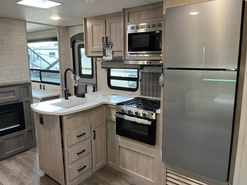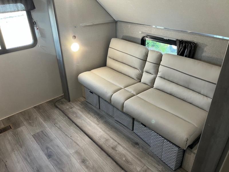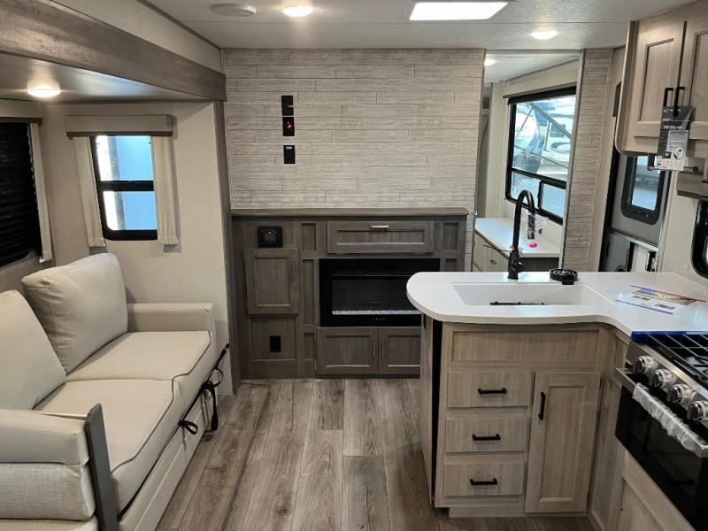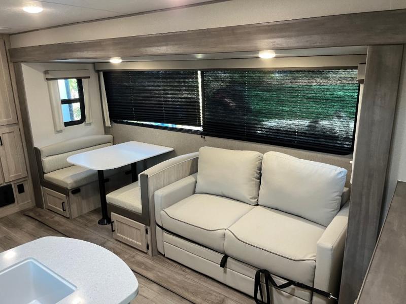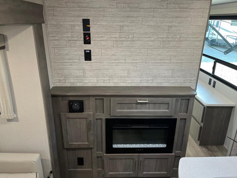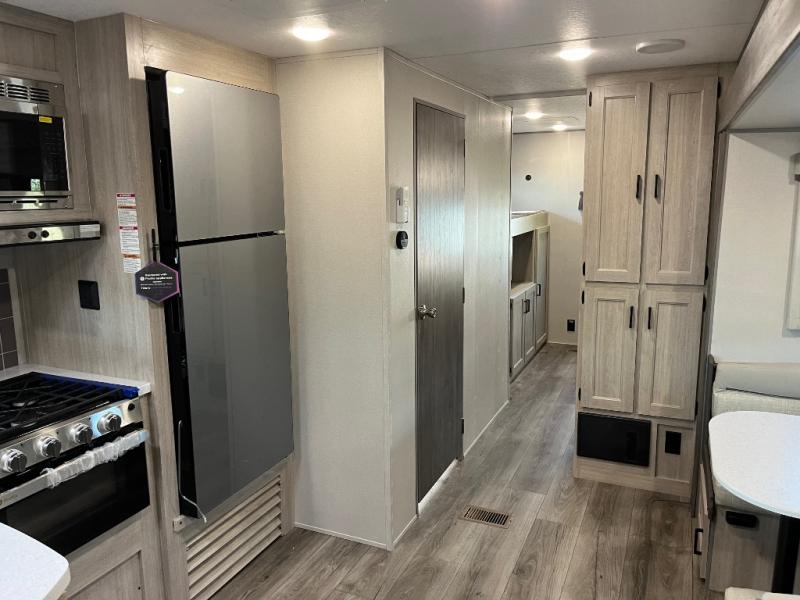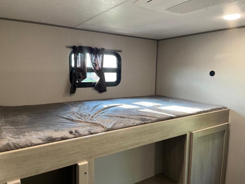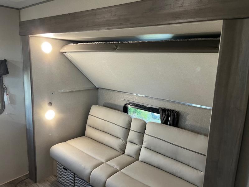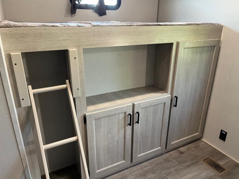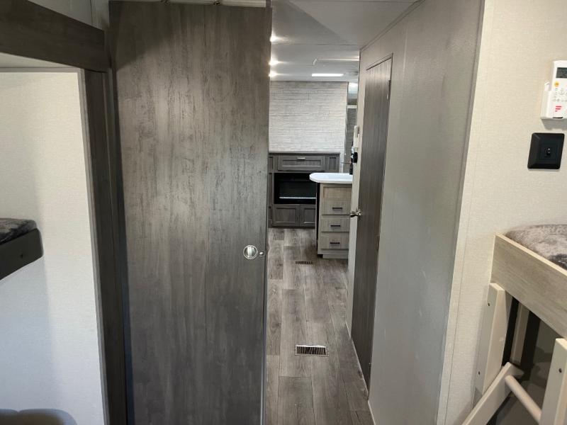 This family-friendly trailer offers lots of floor space thanks to the triple slides throughout! You and your family will love the combined living and kitchen area with a slide out booth dinette and a sofa with drink holders. The L-shaped kitchen counter allows the cook to make meals without moving for anyone trying to get to the full bathroom or the rear bunkhouse. The kids will have their own privacy, two bunk beds, a jack knife sofa with storage totes below plus a TV/wardrobe cabinet. The front private bedroom allows you to sleep like royalty, and offers a large closet for your clothing and another closet prepped for a washer/dryer. And don't forget about the full size camper kitchen and the 21' power awning with multicolor LED lights when you are outside.