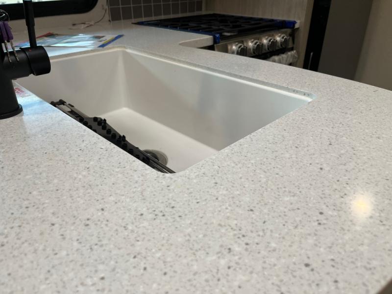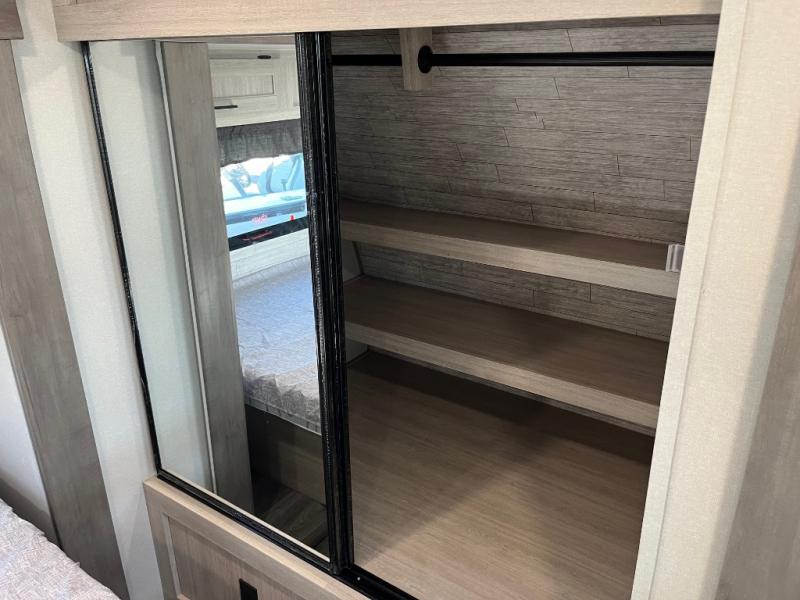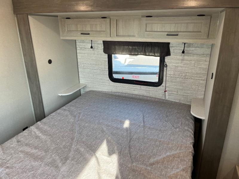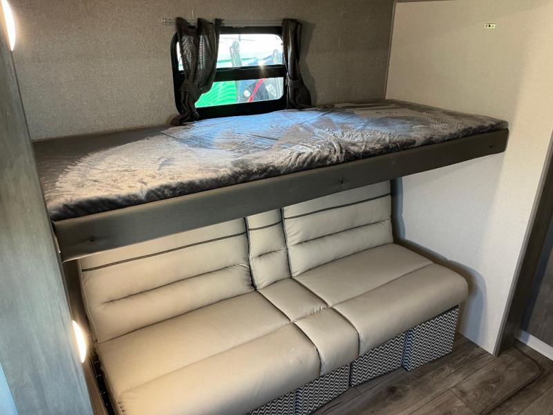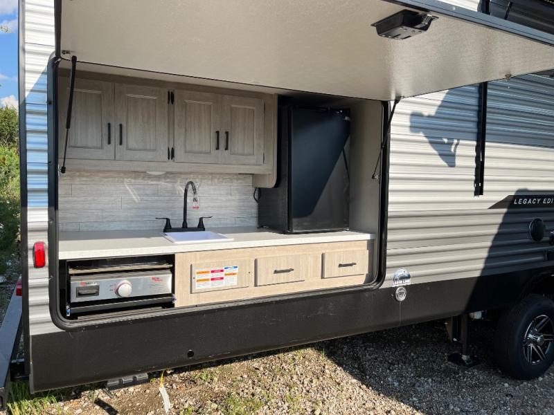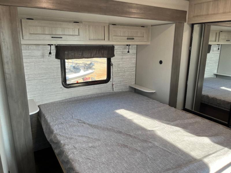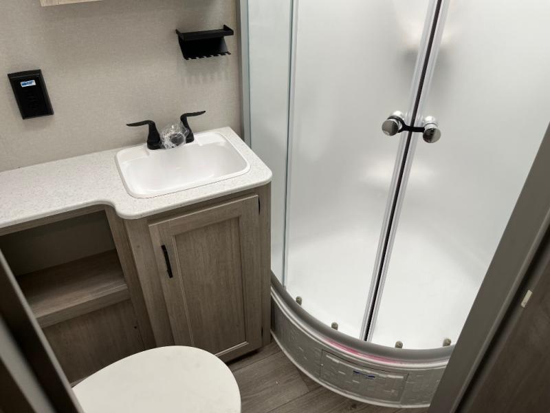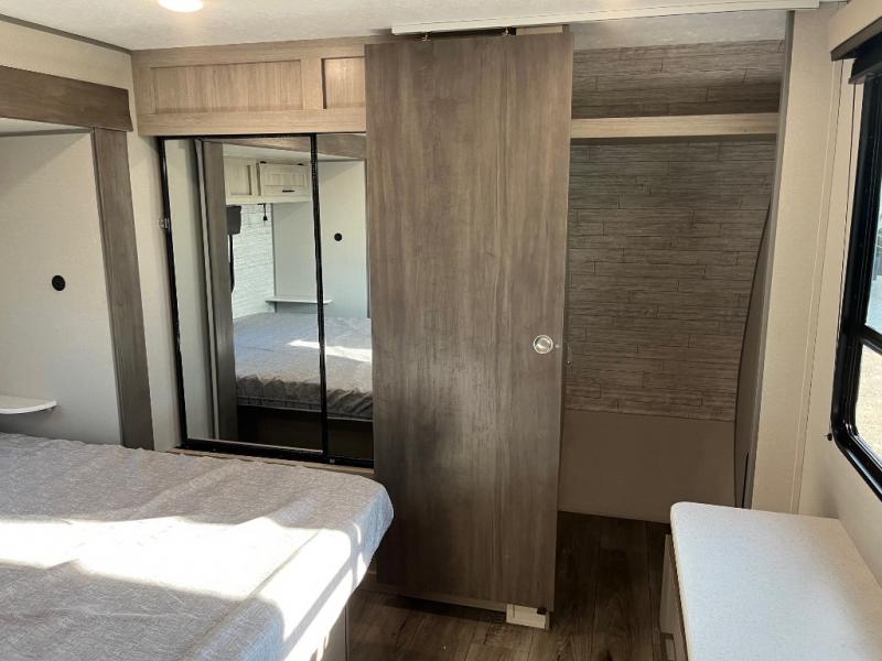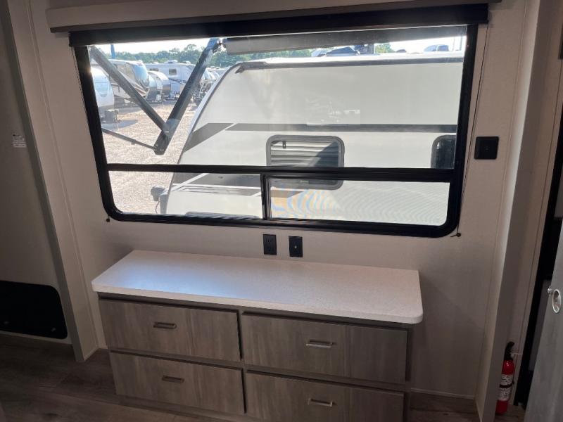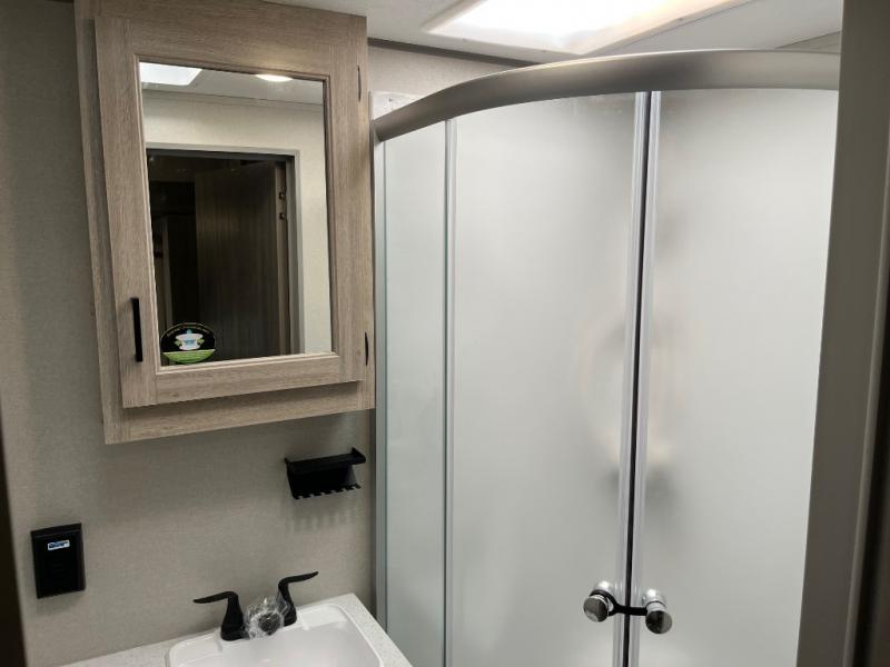This family-friendly trailer offers lots of floor space thanks to the triple slides throughout! You and your family will love the combined living and kitchen area with a slide out booth dinette and a sofa with drink holders. The L-shaped kitchen counter allows the cook to make meals without moving for anyone trying to get to the full bathroom or the rear bunkhouse. The kids will have their own privacy, two bunk beds, a jack knife sofa with storage totes below plus a TV/wardrobe cabinet. The front private bedroom allows you to sleep like royalty, and offers a large closet for your clothing and another closet prepped for a washer/dryer. And don't forget about the full size camper kitchen and the 21' power awning with multicolor LED lights when you are outside.
