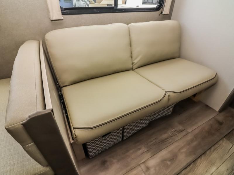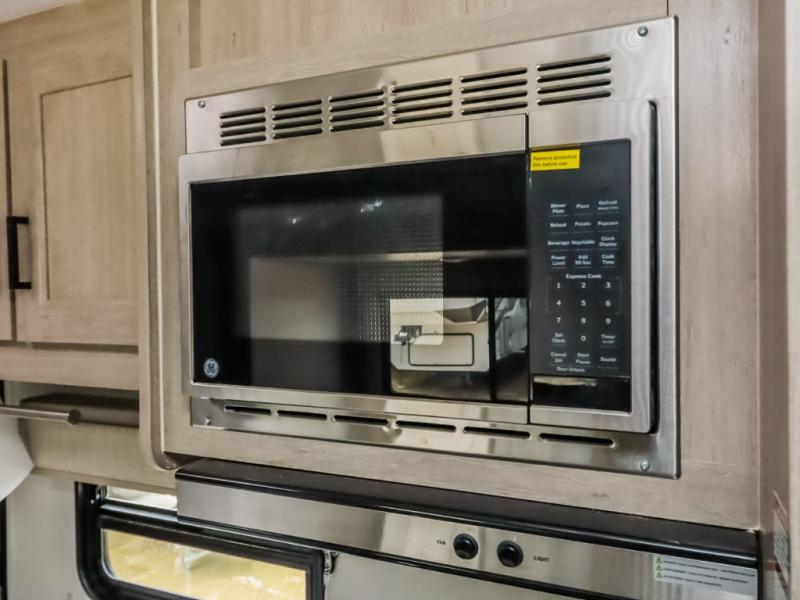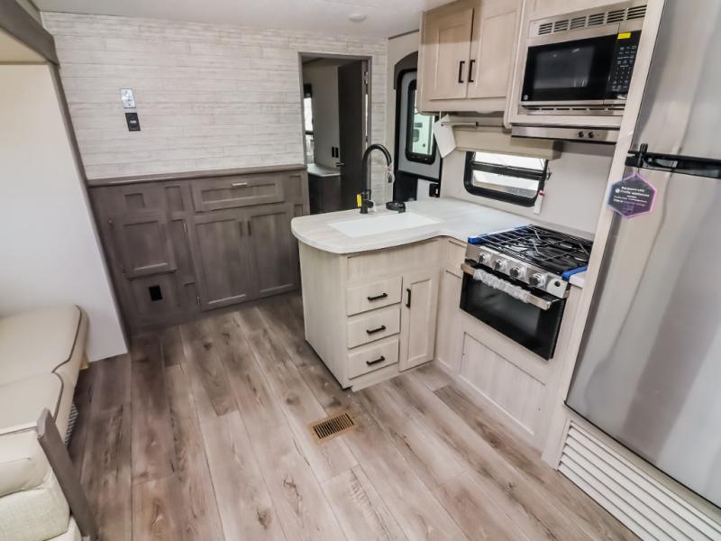 This family-friendly trailer offers lots of floor space thanks to the triple slides throughout! You and your family will love the combined living and kitchen area with a slide out booth dinette and a sofa with drink holders. The L-shaped kitchen counter allows the cook to make meals without moving for anyone trying to get to the full bathroom or the rear bunkhouse. The kids will have their own privacy, two bunk beds, a jack knife sofa with storage totes below plus a TV/wardrobe cabinet. The front private bedroom allows you to sleep like royalty, and offers a large closet for your clothing and another closet prepped for a washer/dryer. And don't forget about the full size camper kitchen and the 21' power awning with multicolor LED lights when you are outside.