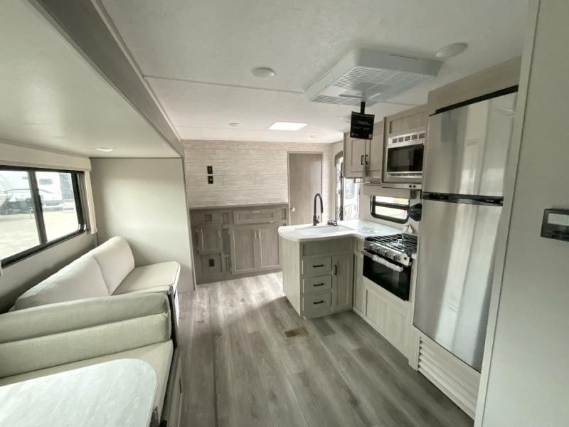 This family-friendly trailer offers lots of floor space thanks to the triple slides throughout! You and your family will love the combined living and kitchen area with a slide out booth dinette and a sofa with drink holders. The L-shaped kitchen counter allows the cook to make meals without moving for anyone trying to get to the full bathroom or the rear bunkhouse. The kids will have their own privacy, two bunk beds, a jack knife sofa with storage totes below plus a TV/wardrobe cabinet. The front private bedroom allows you to sleep like royalty, and offers a large closet for your clothing and another closet prepped for a washer/dryer. And don't forget about the full size camper kitchen and the 21' power awning with multicolor LED lights when you are outside.