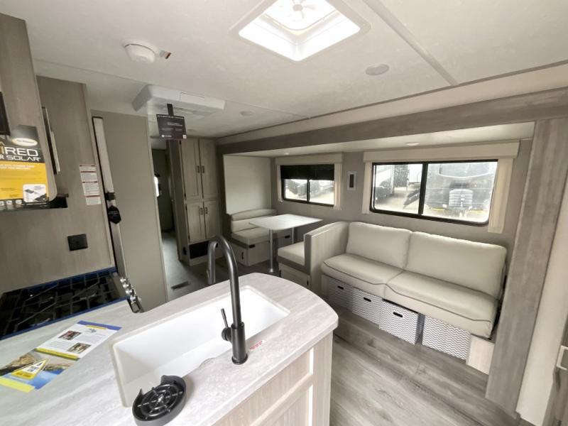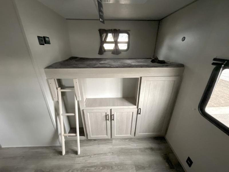 This family-friendly trailer offers lots of floor space thanks to the triple slides throughout! You and your family will love the combined living and kitchen area with a slide out booth dinette and a sofa with drink holders. The L-shaped kitchen counter allows the cook to make meals without moving for anyone trying to get to the full bathroom or the rear bunkhouse. The kids will have their own privacy, two bunk beds, a jack knife sofa with storage totes below plus a TV/wardrobe cabinet. The front private bedroom allows you to sleep like royalty, and offers a large closet for your clothing and another closet prepped for a washer/dryer. And don't forget about the full size camper kitchen and the 21' power awning with multicolor LED lights when you are outside.