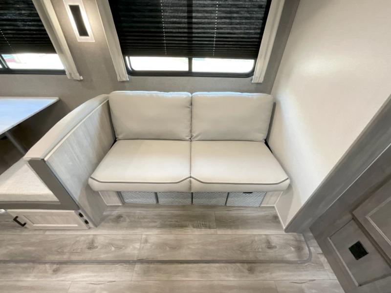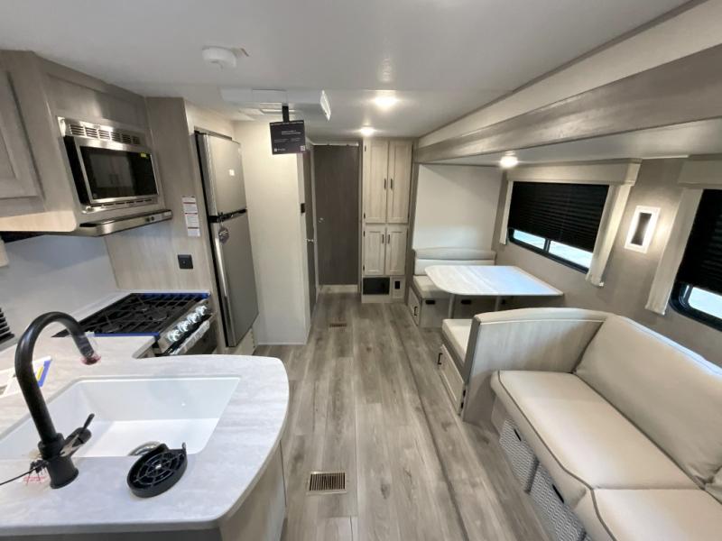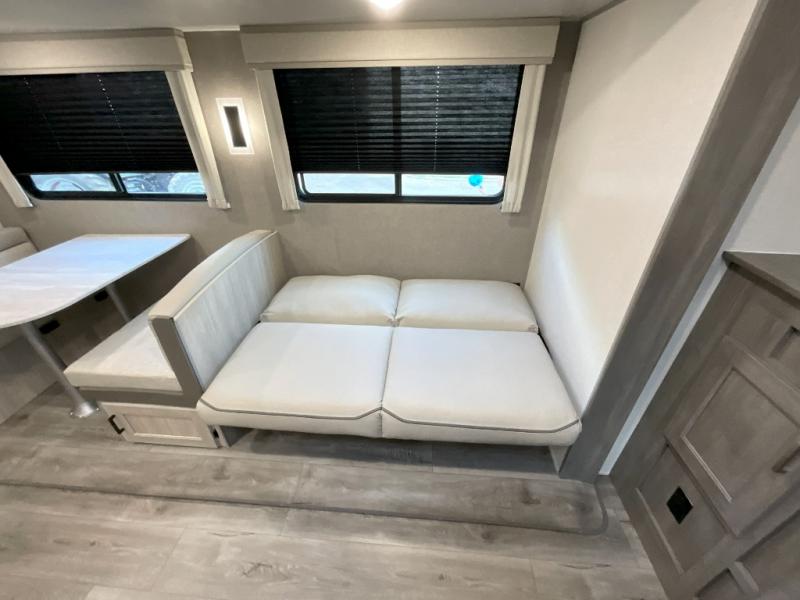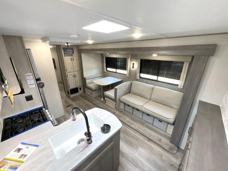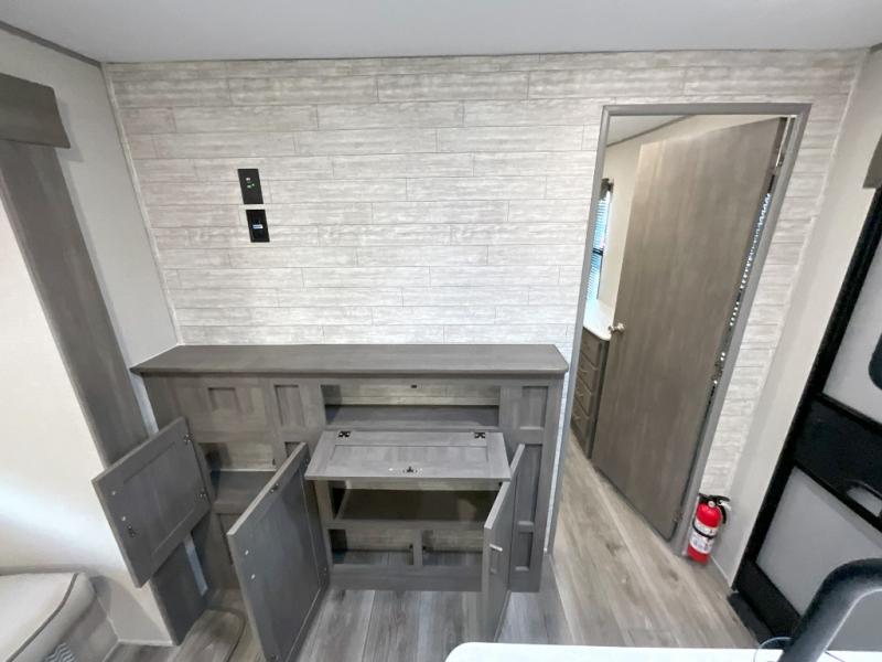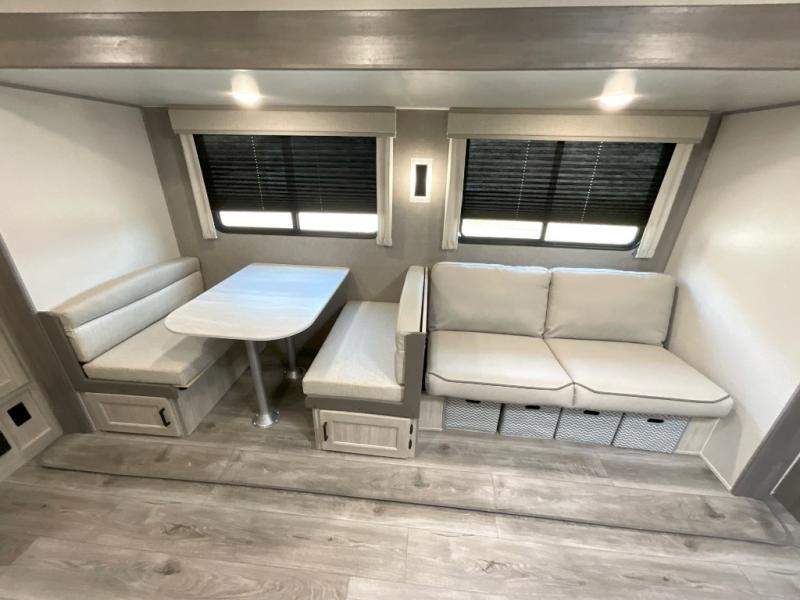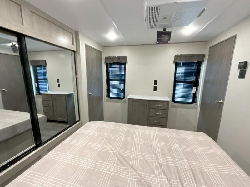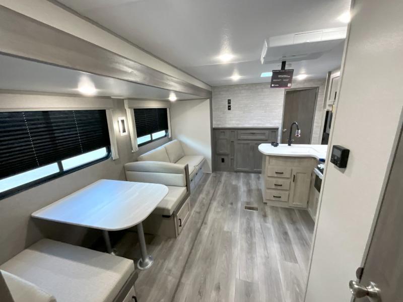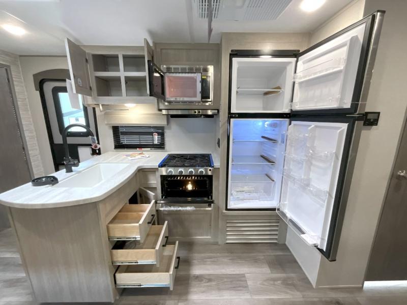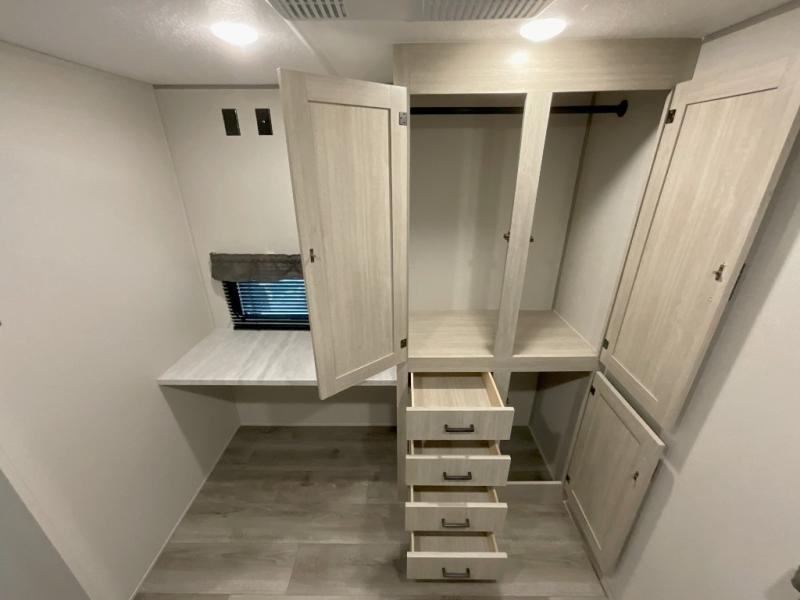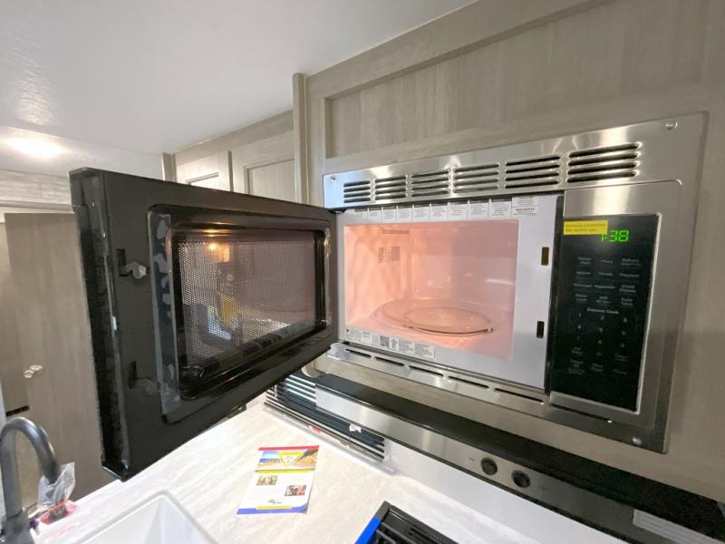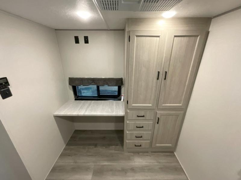 This trailer offers lots of floor space thanks to the triple slides throughout! You and your family will love the combined living and kitchen area with a slide out booth dinette and a sofa with drink holders. The L-shaped kitchen counter allows the cook to make meals without moving for anyone trying to get to the full bathroom and rear den. Here, you'll find a Murphy bed slide, a wardrobe and a workstation with TV hookups if you want to add entertainment. The front private bedroom allows you to sleep like royalty, and offers a large closet for your clothing and another closet prepped for a washer/dryer.