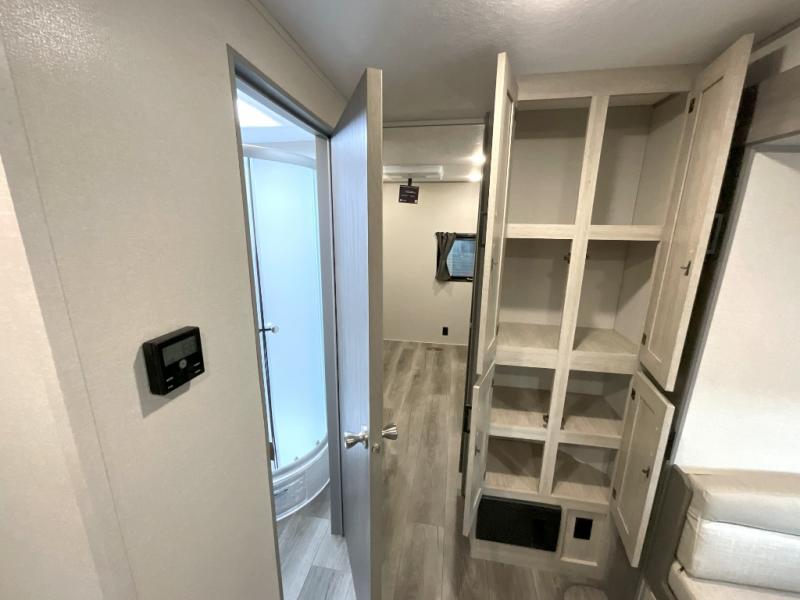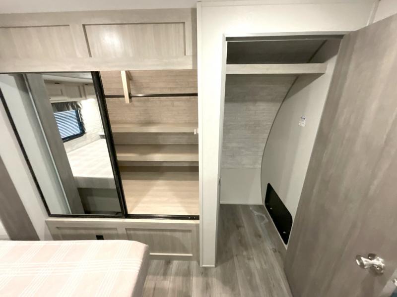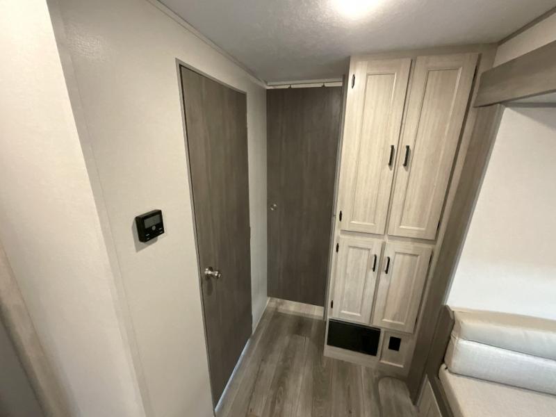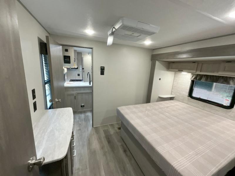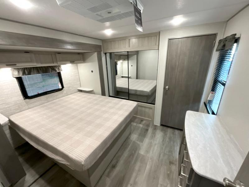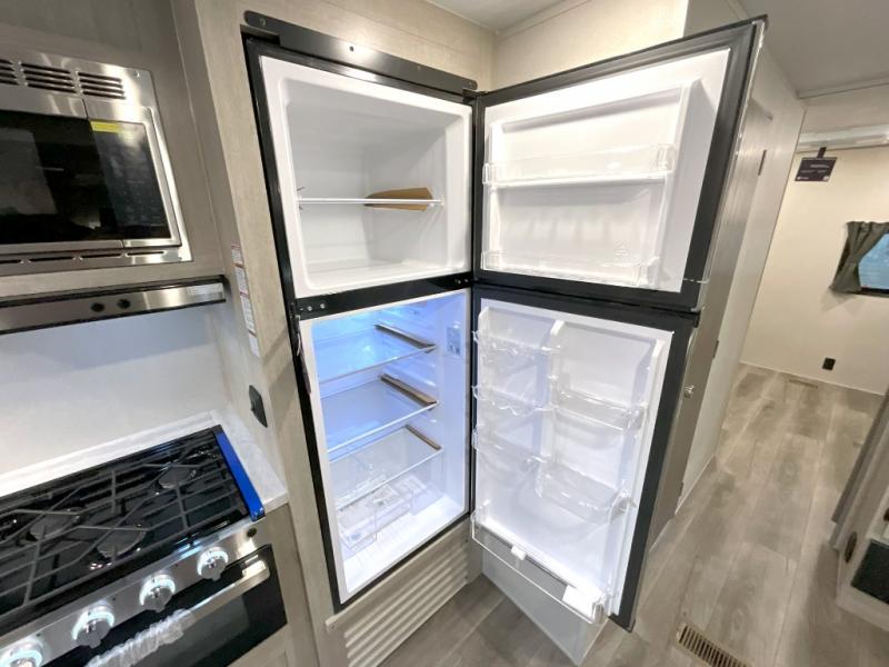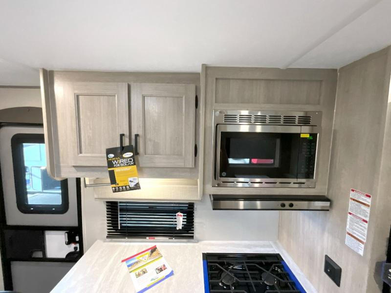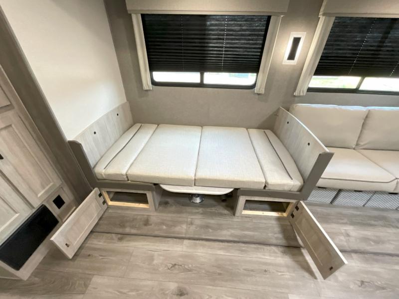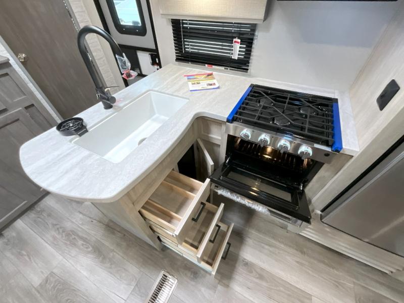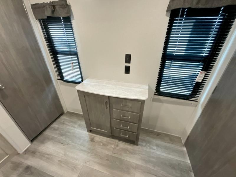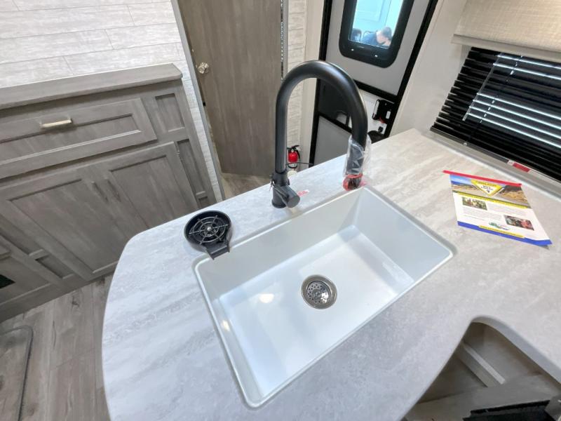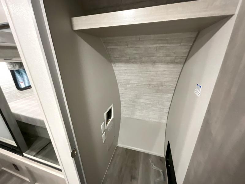 This trailer offers lots of floor space thanks to the triple slides throughout! You and your family will love the combined living and kitchen area with a slide out booth dinette and a sofa with drink holders. The L-shaped kitchen counter allows the cook to make meals without moving for anyone trying to get to the full bathroom and rear den. Here, you'll find a Murphy bed slide, a wardrobe and a workstation with TV hookups if you want to add entertainment. The front private bedroom allows you to sleep like royalty, and offers a large closet for your clothing and another closet prepped for a washer/dryer.