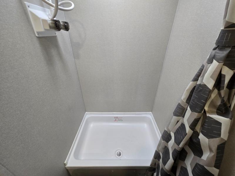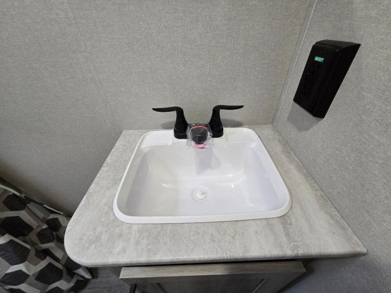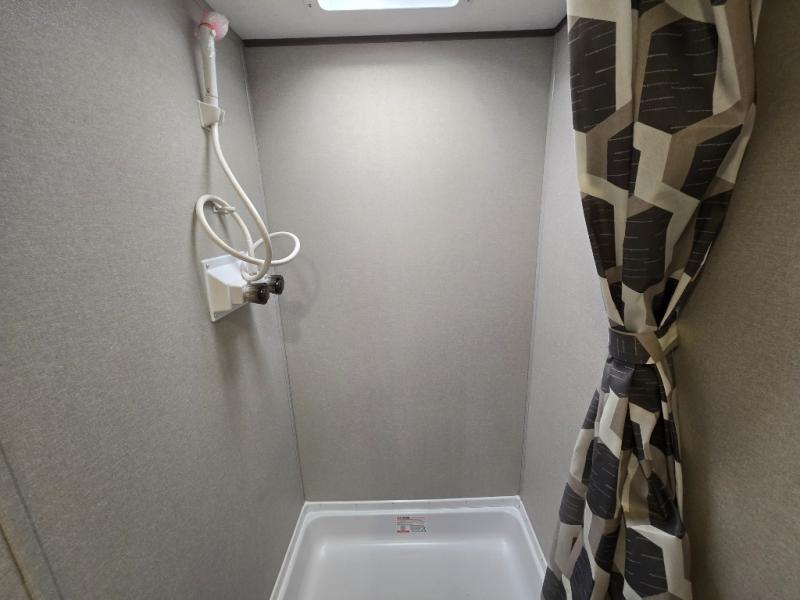Full bathroom with shower, toilet, and sink for campground convenience
