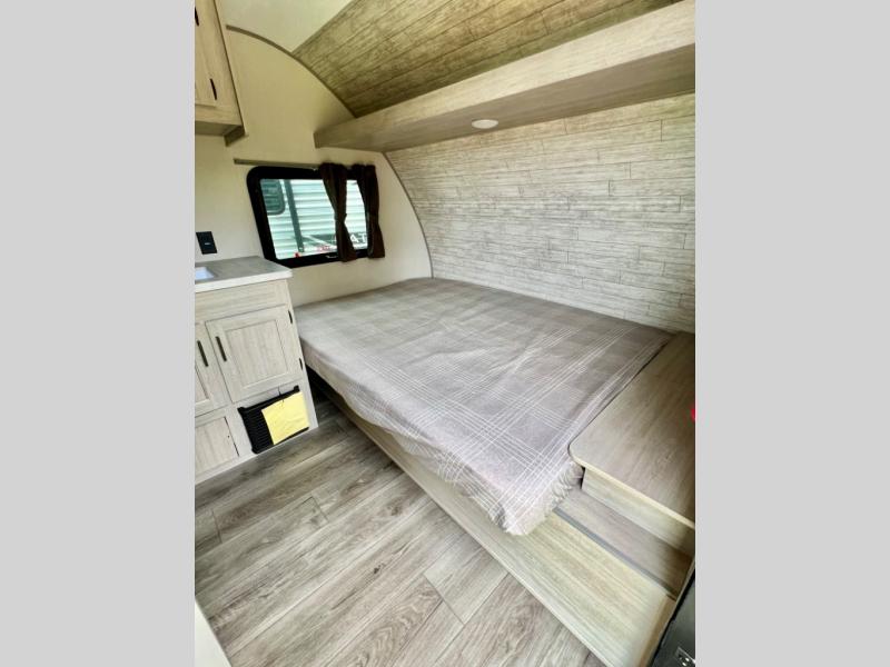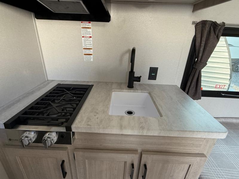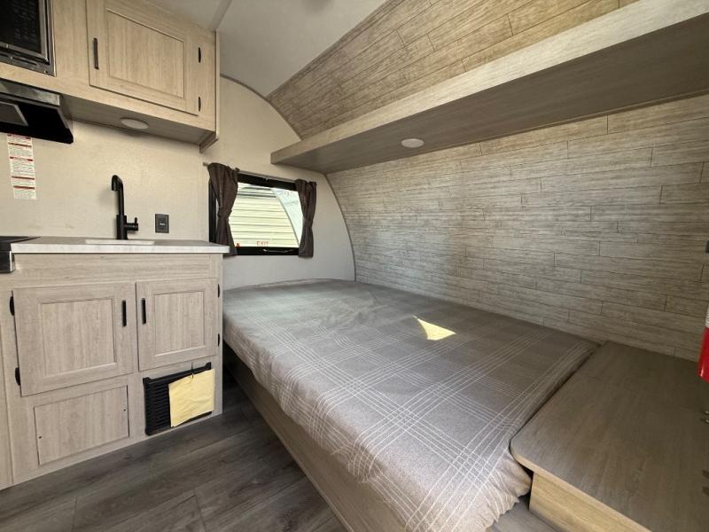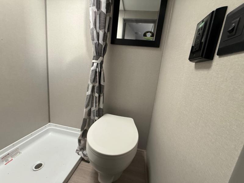 Lightweight camping is easier than you think with this travel trailer in tow! The front 54" x 74" queen bed will provide a great night's rest each night, while the little ones or your guests take the bunk beds. There is a handy shelf above the front bed for your belongings plus additional bedroom storage. A private bath includes a 24" x 32" shower and a toilet with a mirror behind it so you can freshen up each day. You'll also find a two-burner cooktop and microwave oven to make meals each day plus a 3.3 cu. ft. 12V refrigerator for food storage!