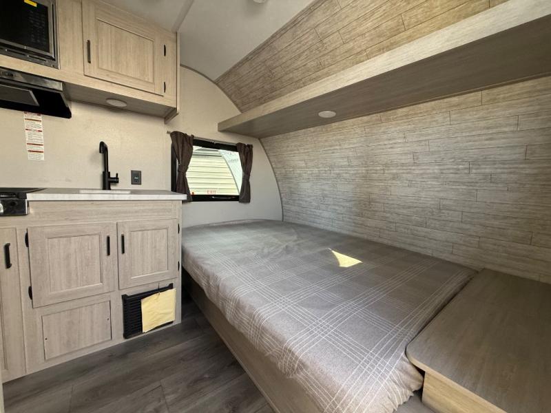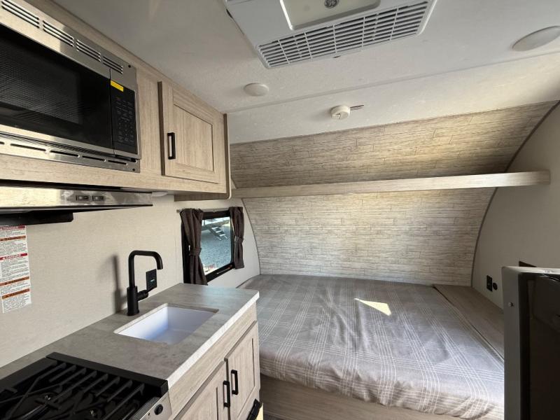 Lightweight camping is easier than you think with this travel trailer in tow! The front 54" x 74" queen bed will provide a great night's rest each night, while the little ones or your guests take the bunk beds. There is a handy shelf above the front bed for your belongings plus additional bedroom storage. A private bath includes a 24" x 32" shower and a toilet with a mirror behind it so you can freshen up each day. You'll also find a two-burner cooktop and microwave oven to make meals each day plus a 3.3 cu. ft. 12V refrigerator for food storage!