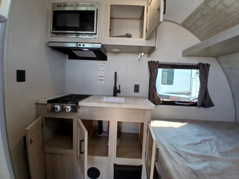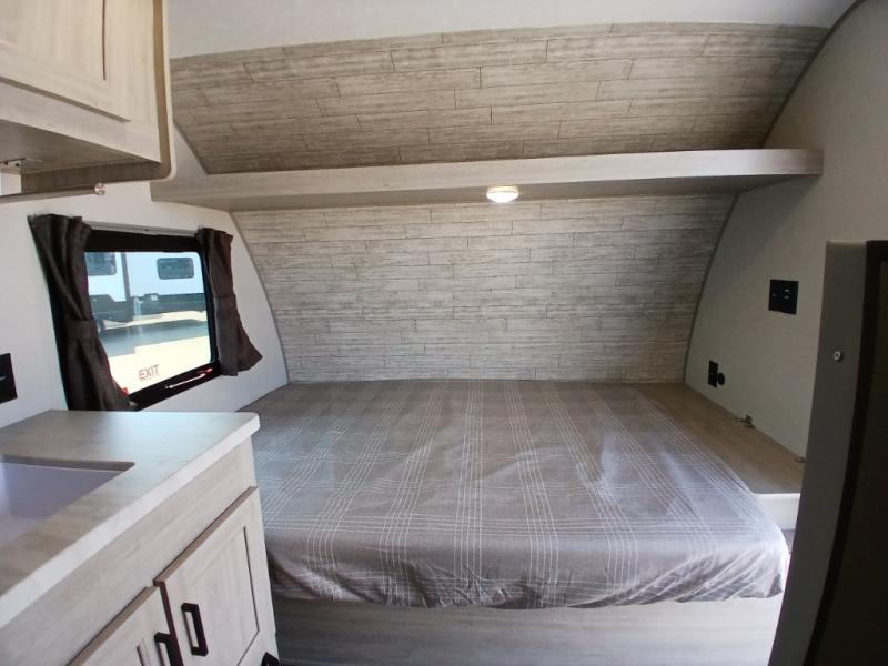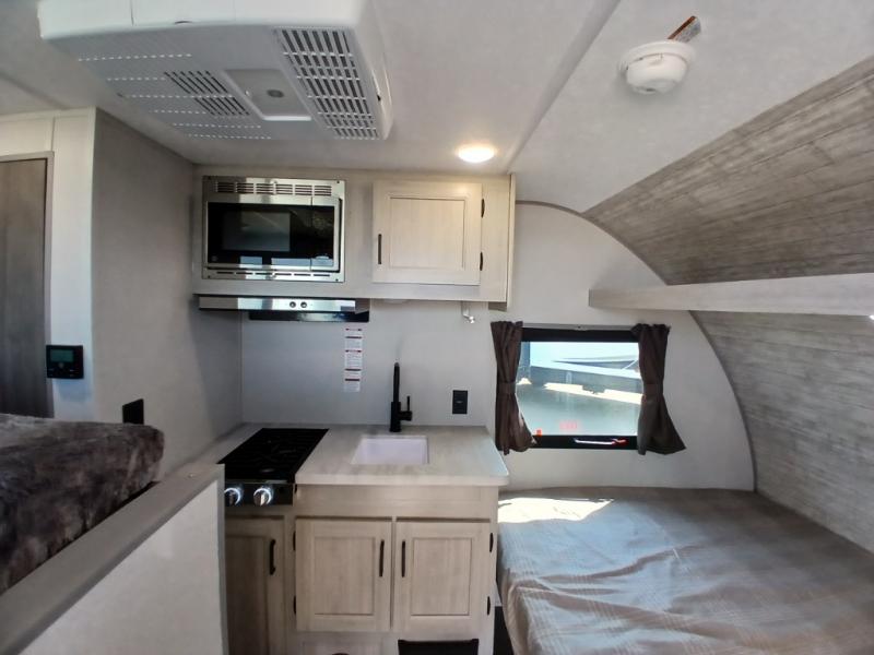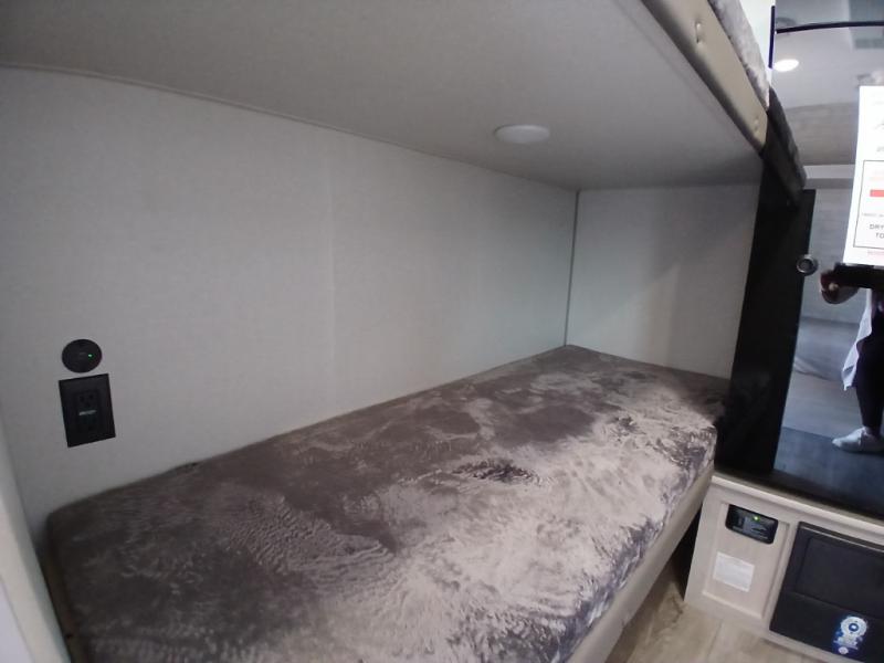 Lightweight camping is easier than you think with this travel trailer in tow! The front 54" x 74" queen bed will provide a great night's rest each night, while the little ones or your guests take the bunk beds. There is a handy shelf above the front bed for your belongings plus additional bedroom storage. A private bath includes a 24" x 32" shower and a toilet with a mirror behind it so you can freshen up each day. You'll also find a two burner cooktop and microwave oven to make meals each day plus a 3.3 cu. ft. 12V refrigerator for food storage!